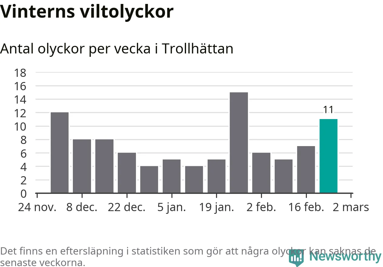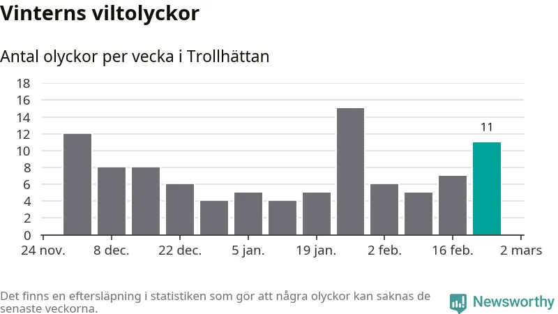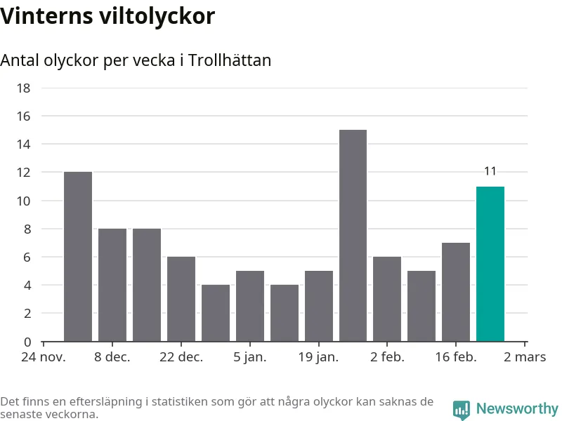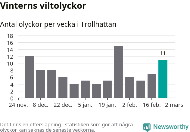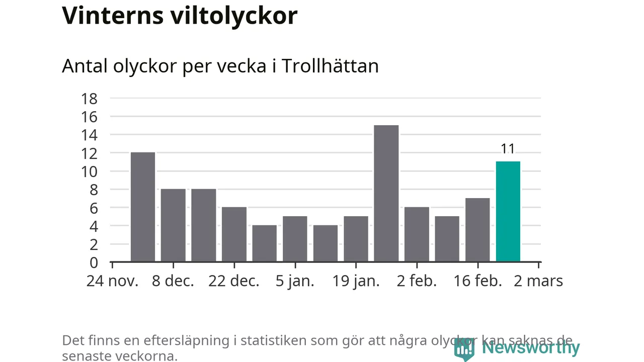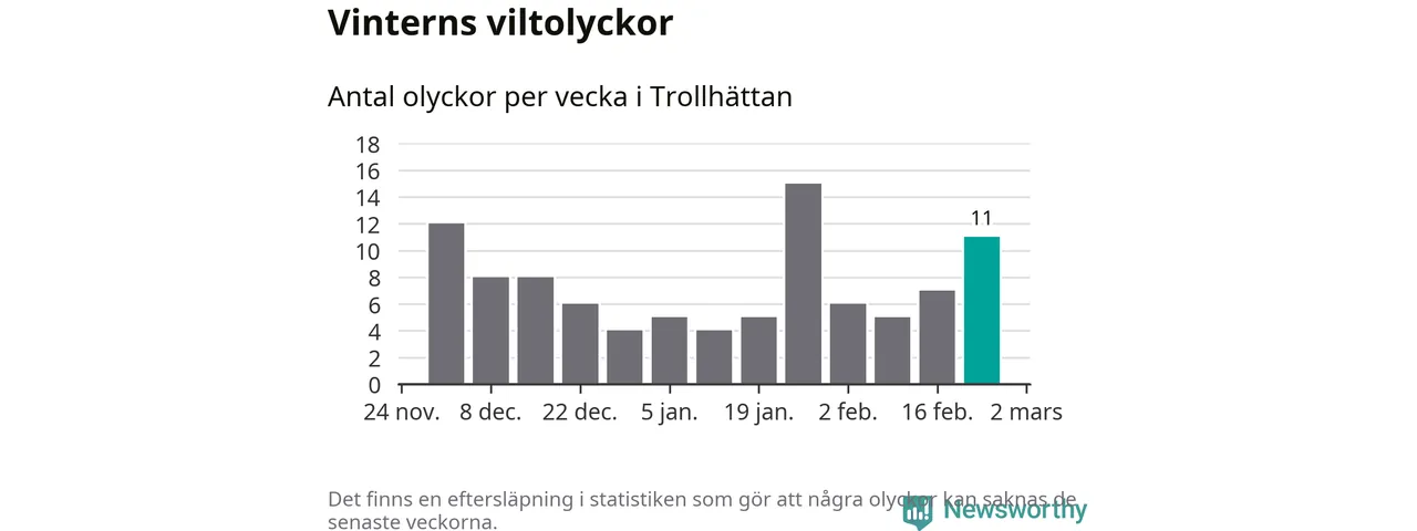 Under vecka 9 rapporterades elva viltolyckor in i Trollhättans kommun. Därmed har det inträffat mer än 50 procent fler viltolyckor den här vintern, än det brukar göra en hel genomsnittlig vinter.