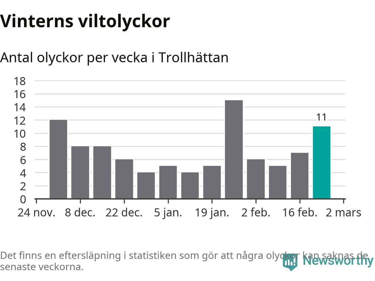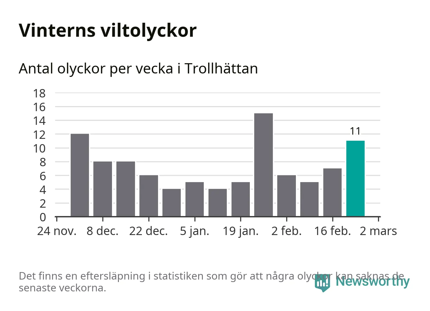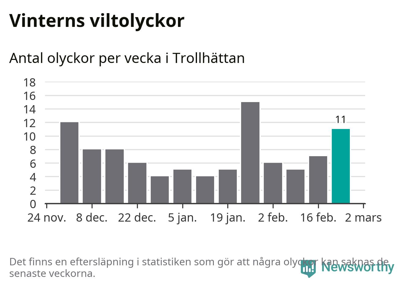Under vecka 9 rapporterades elva viltolyckor in i Trollhättans kommun. Därmed har det inträffat mer än 50 procent fler viltolyckor den här vintern, än det brukar göra en hel genomsnittlig vinter.