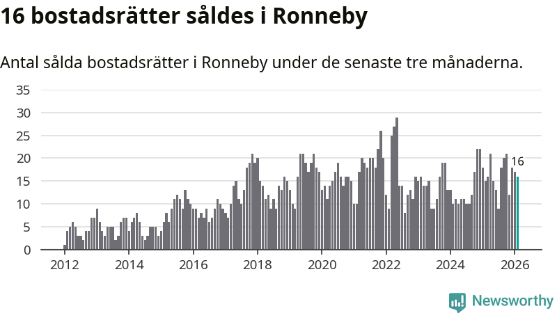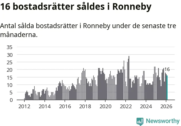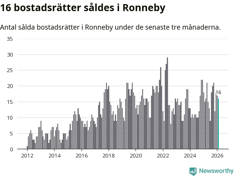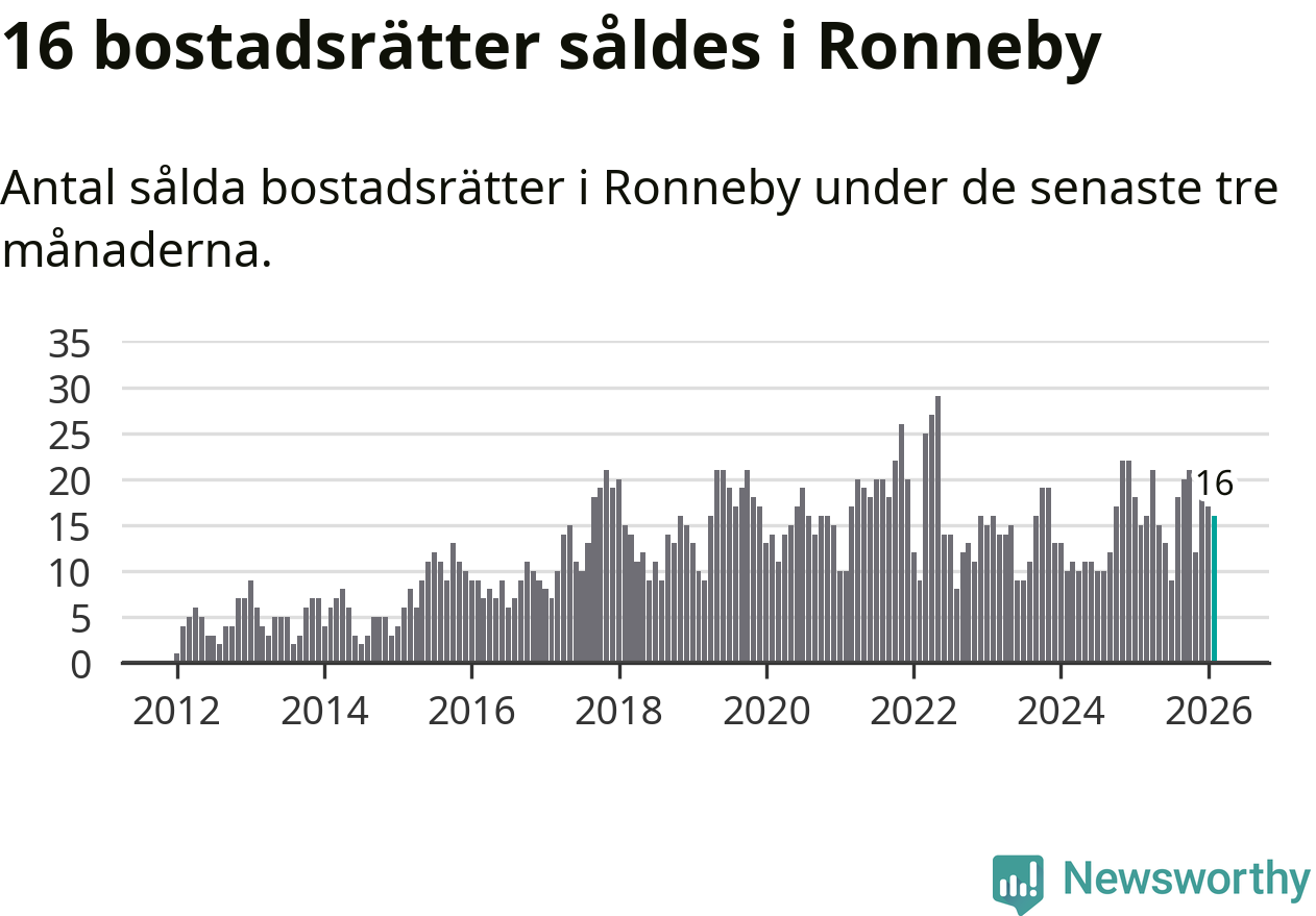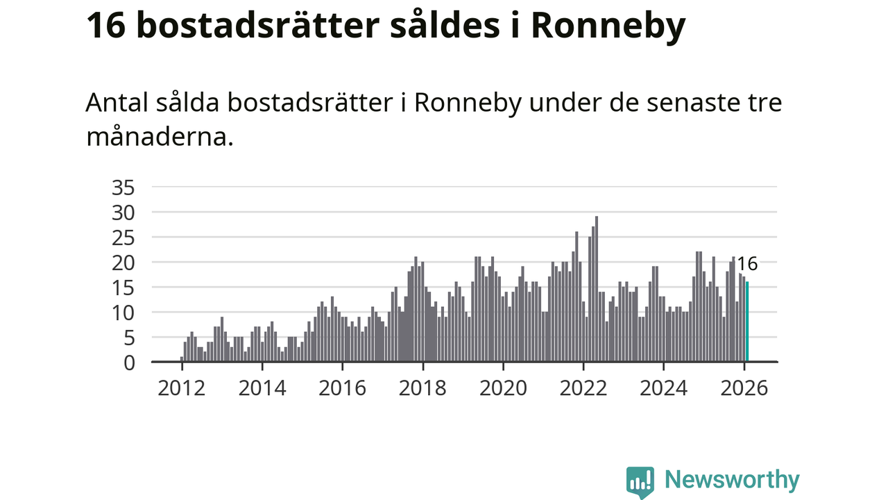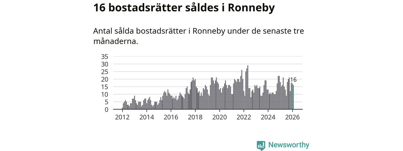 Mellan december och februari gjordes sammanlagt 16 affärer med bostadsrätter i Ronneby kommun. Det kan jämföras med 15 vid motsvarande tid i fjol.