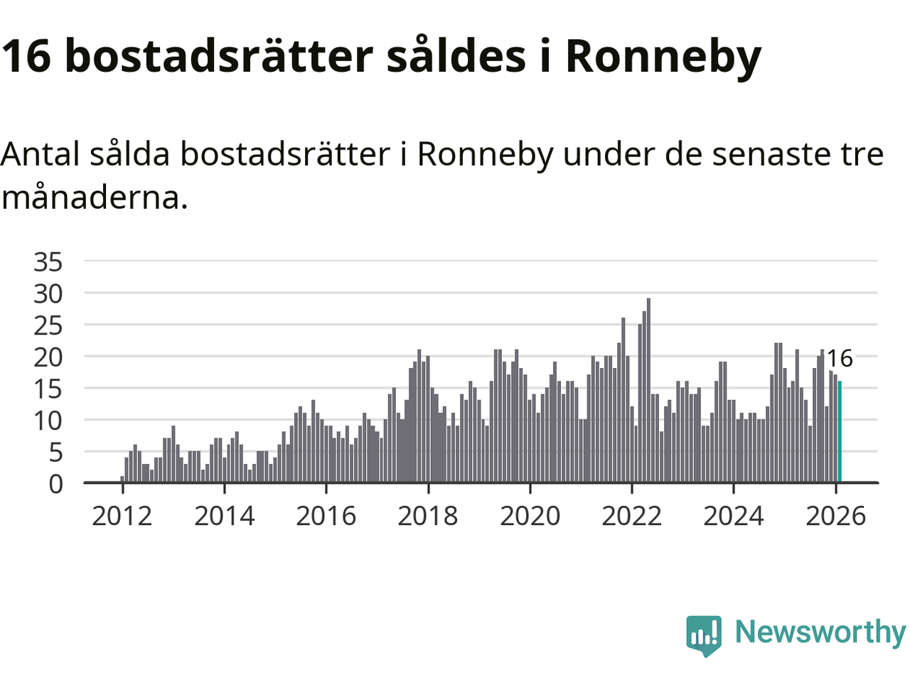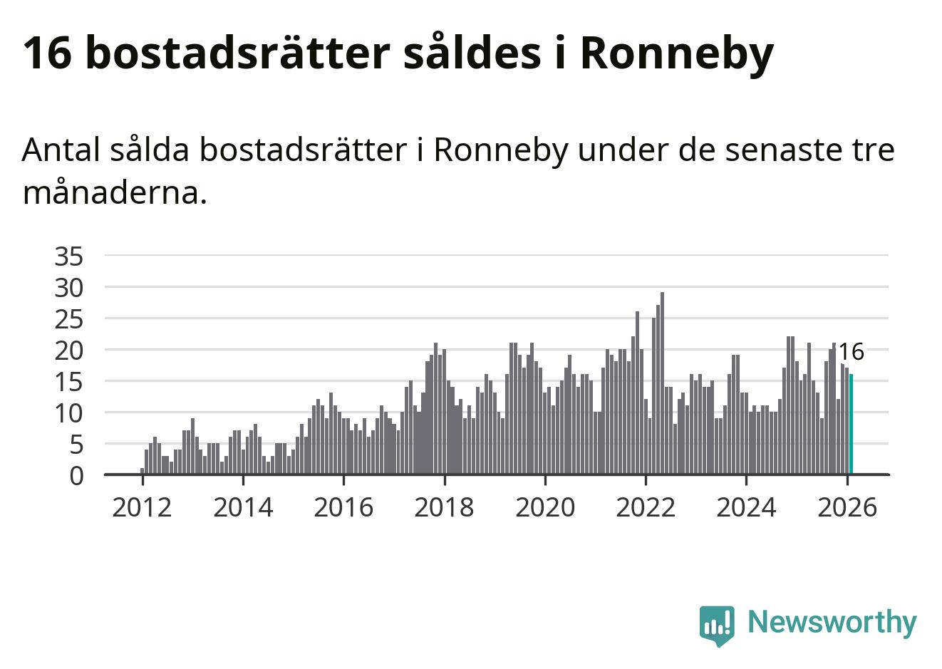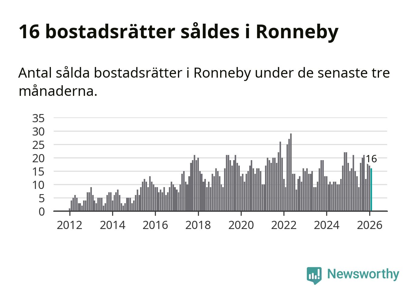 Mellan december och februari gjordes sammanlagt 16 affärer med bostadsrätter i Ronneby kommun. Det kan jämföras med 15 vid motsvarande tid i fjol.