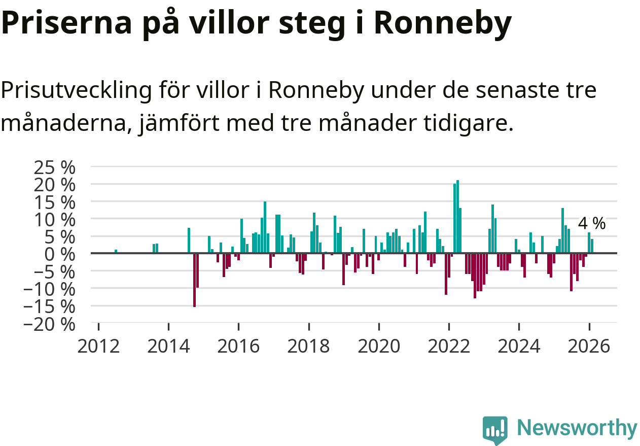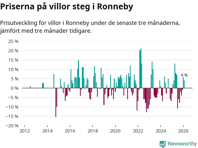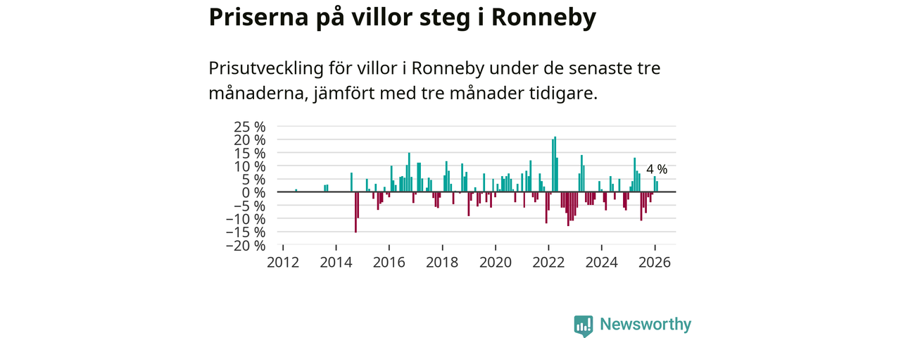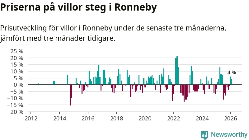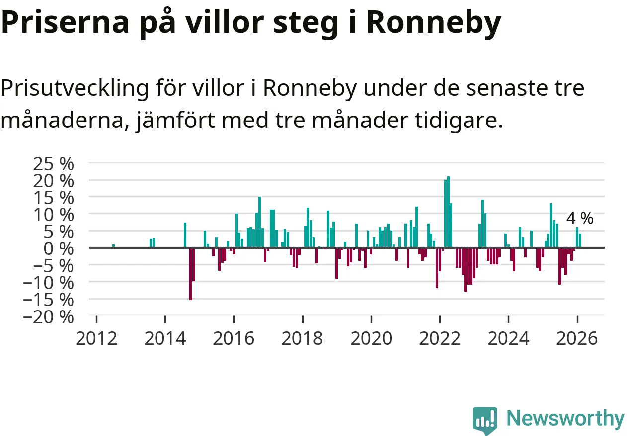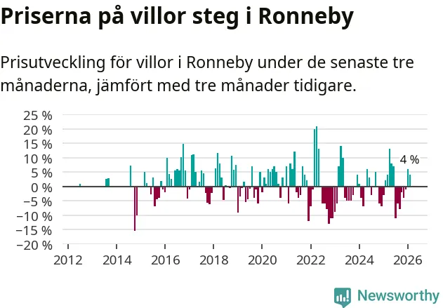 Villapriserna har gått upp i Ronneby kommun. Medelpriset på försäljningarna under de senaste tre månaderna visar på en uppgång med 4 procent.