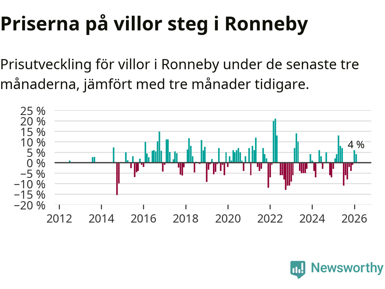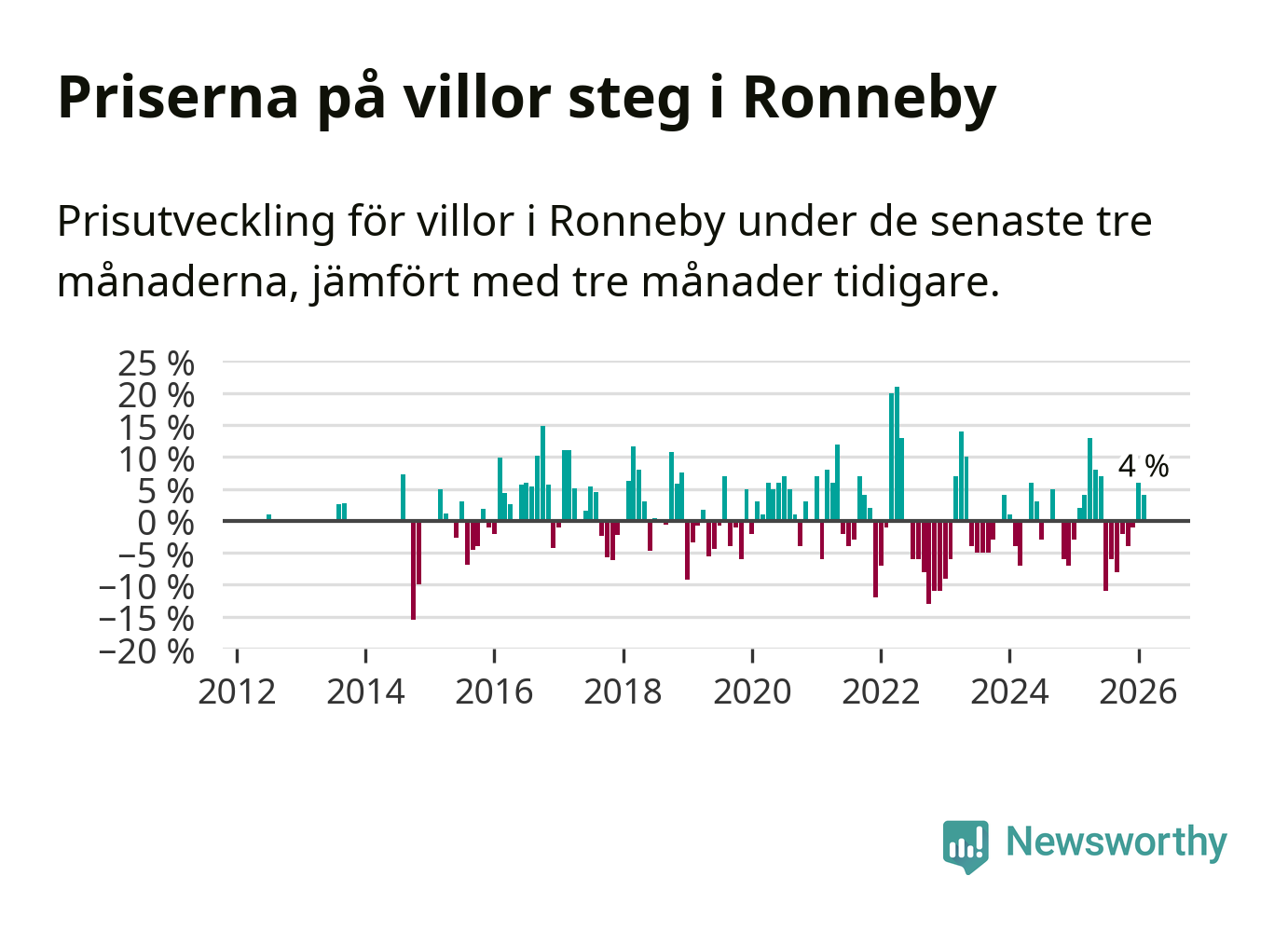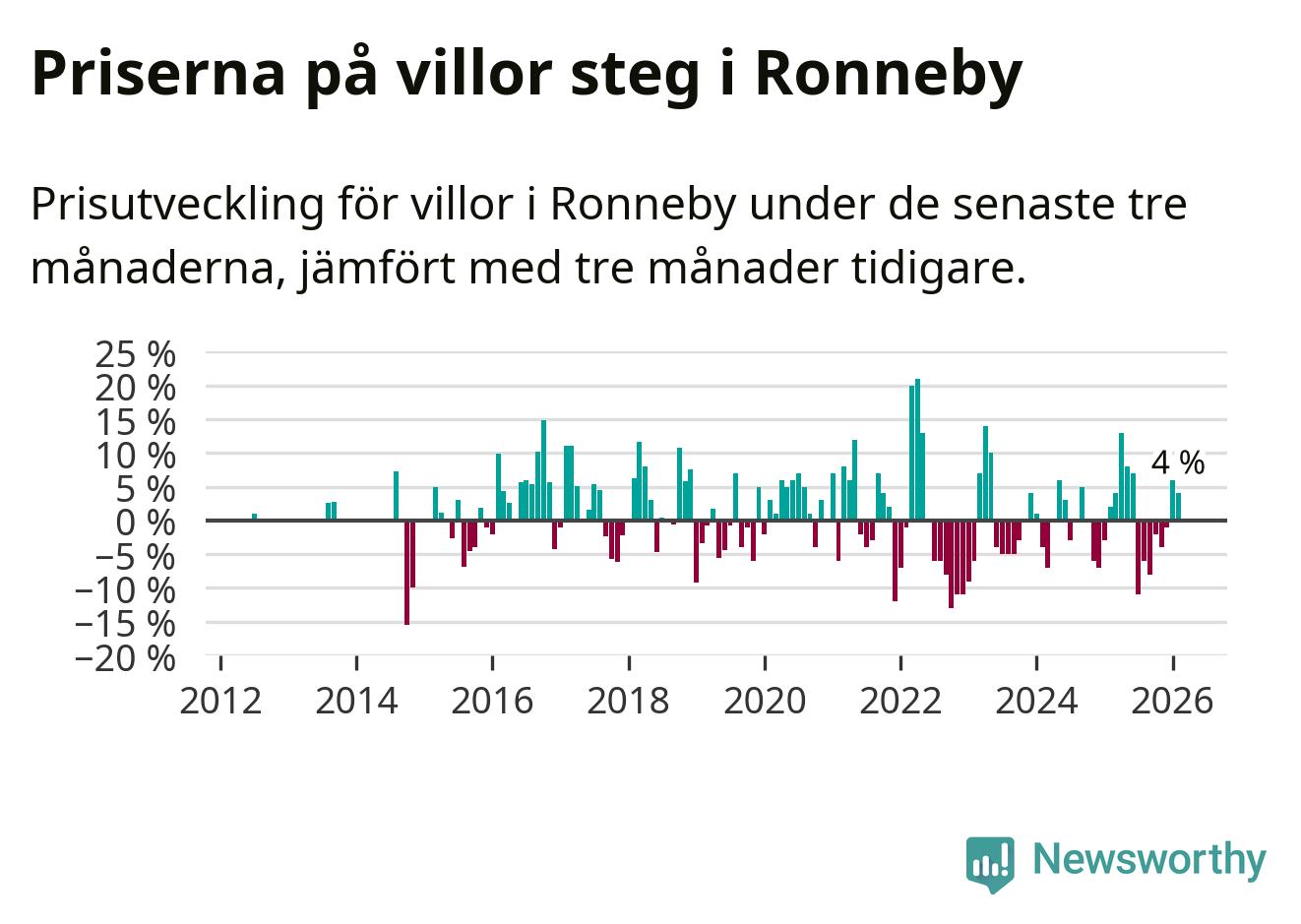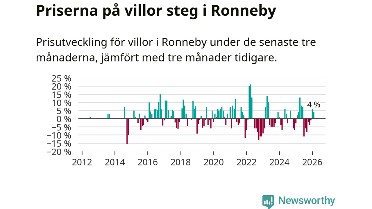 Villapriserna har gått upp i Ronneby kommun. Medelpriset på försäljningarna under de senaste tre månaderna visar på en uppgång med 4 procent.