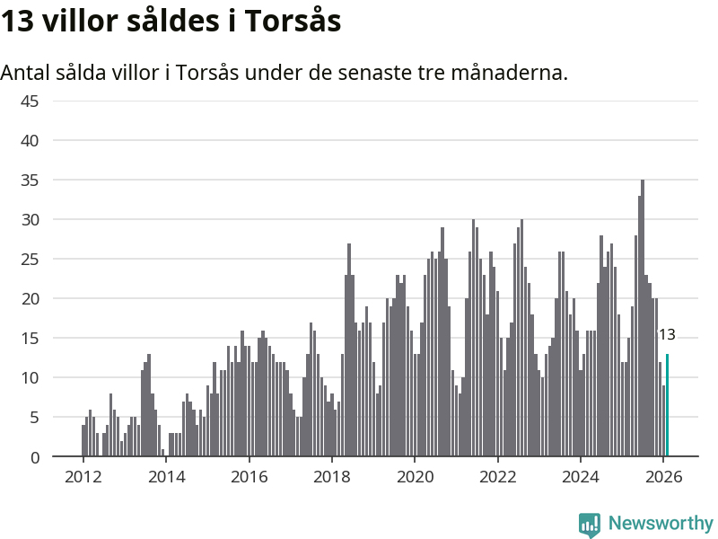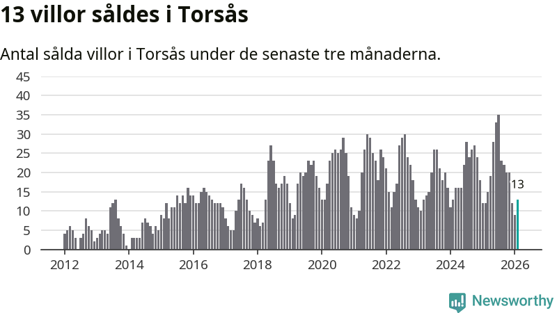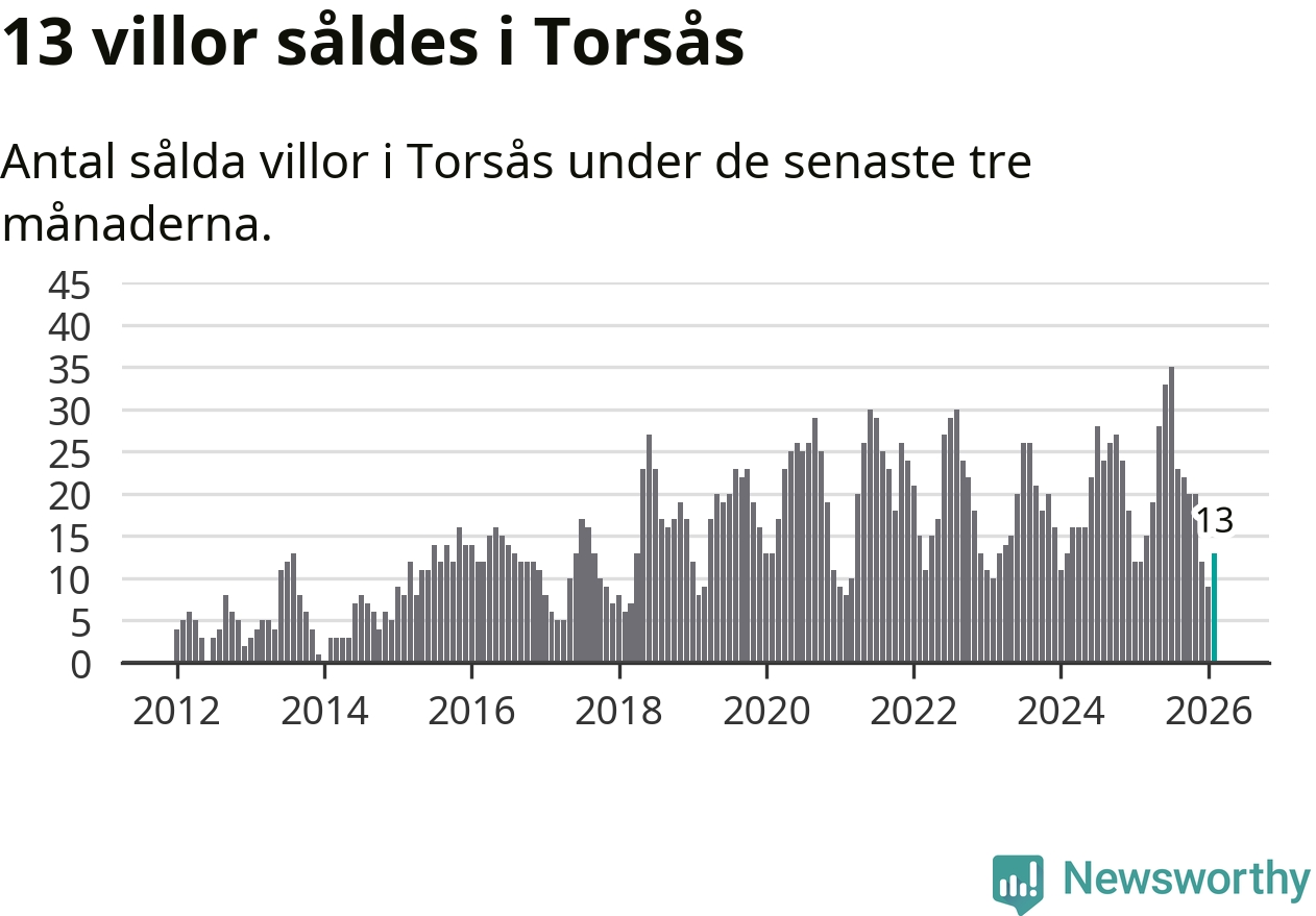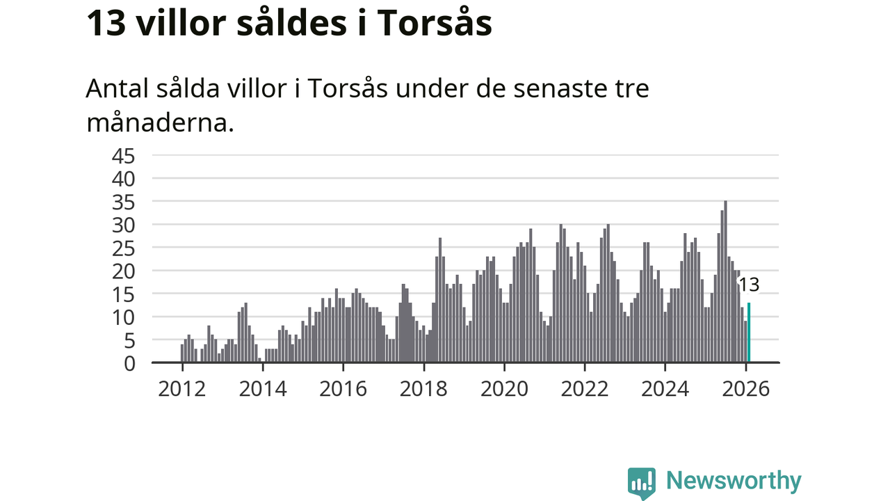 Mellan december och februari gjordes sammanlagt 13 affärer med villor i Torsås kommun. Det kan jämföras med tolv vid motsvarande tid i fjol.