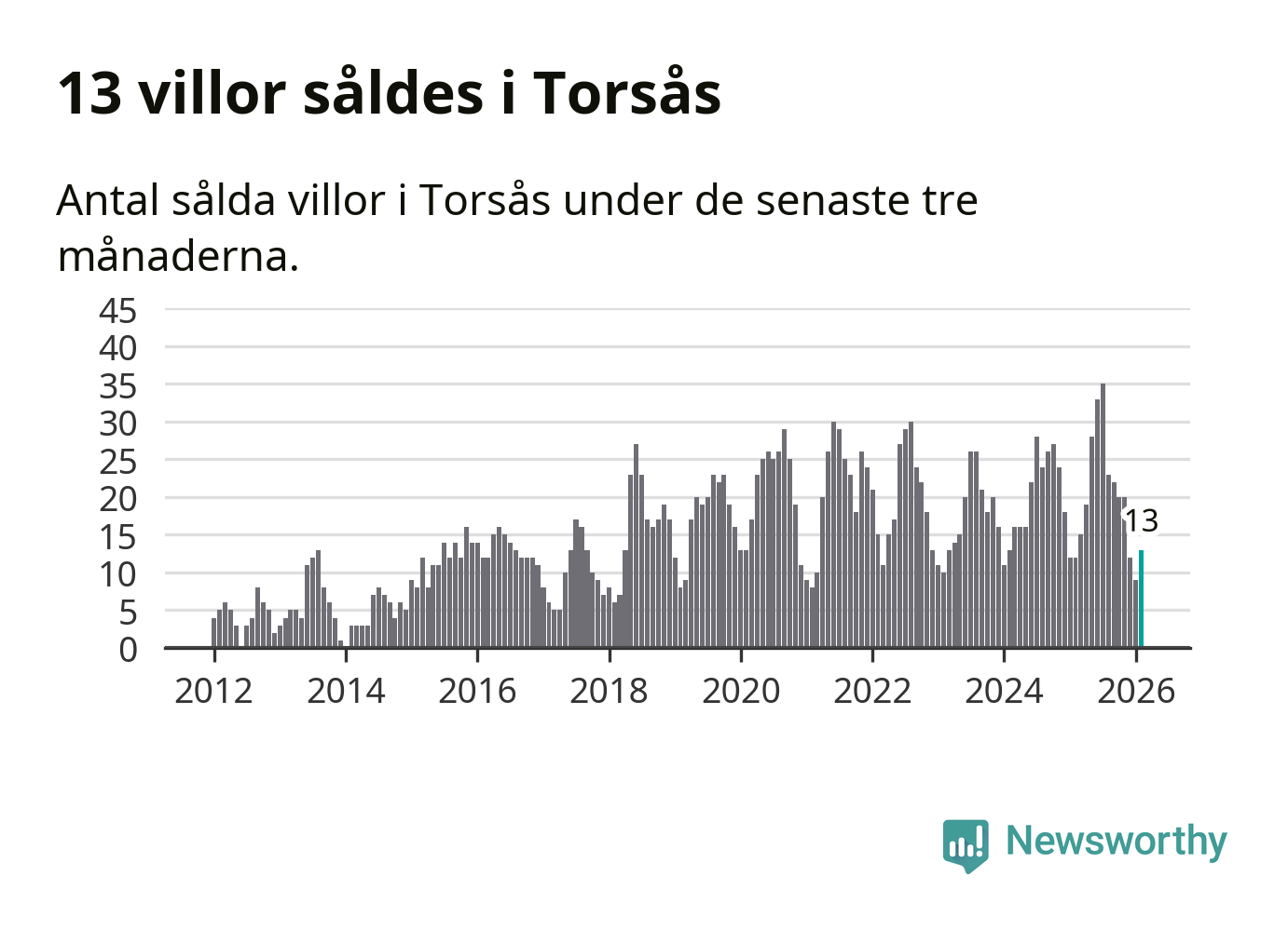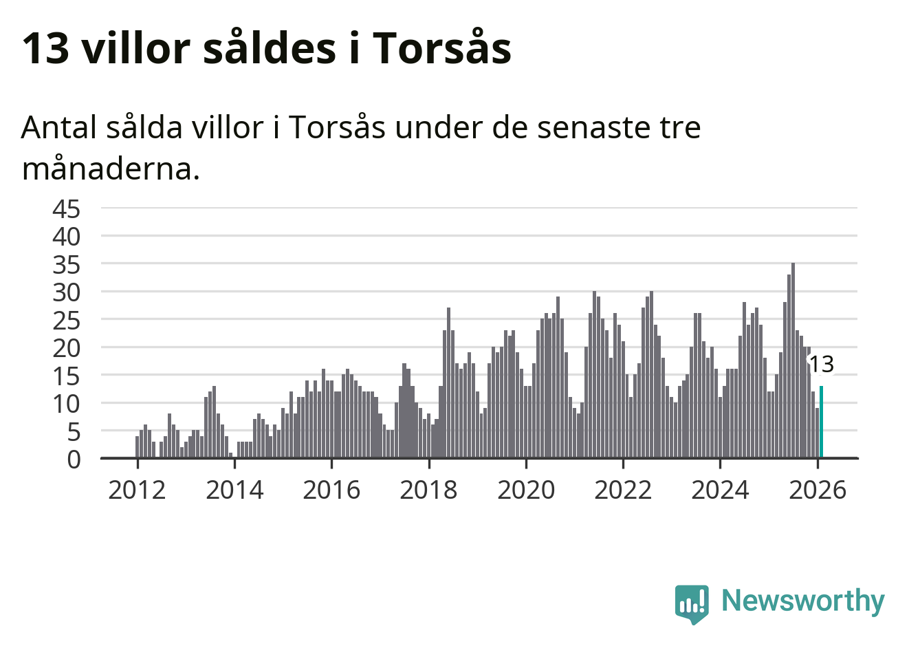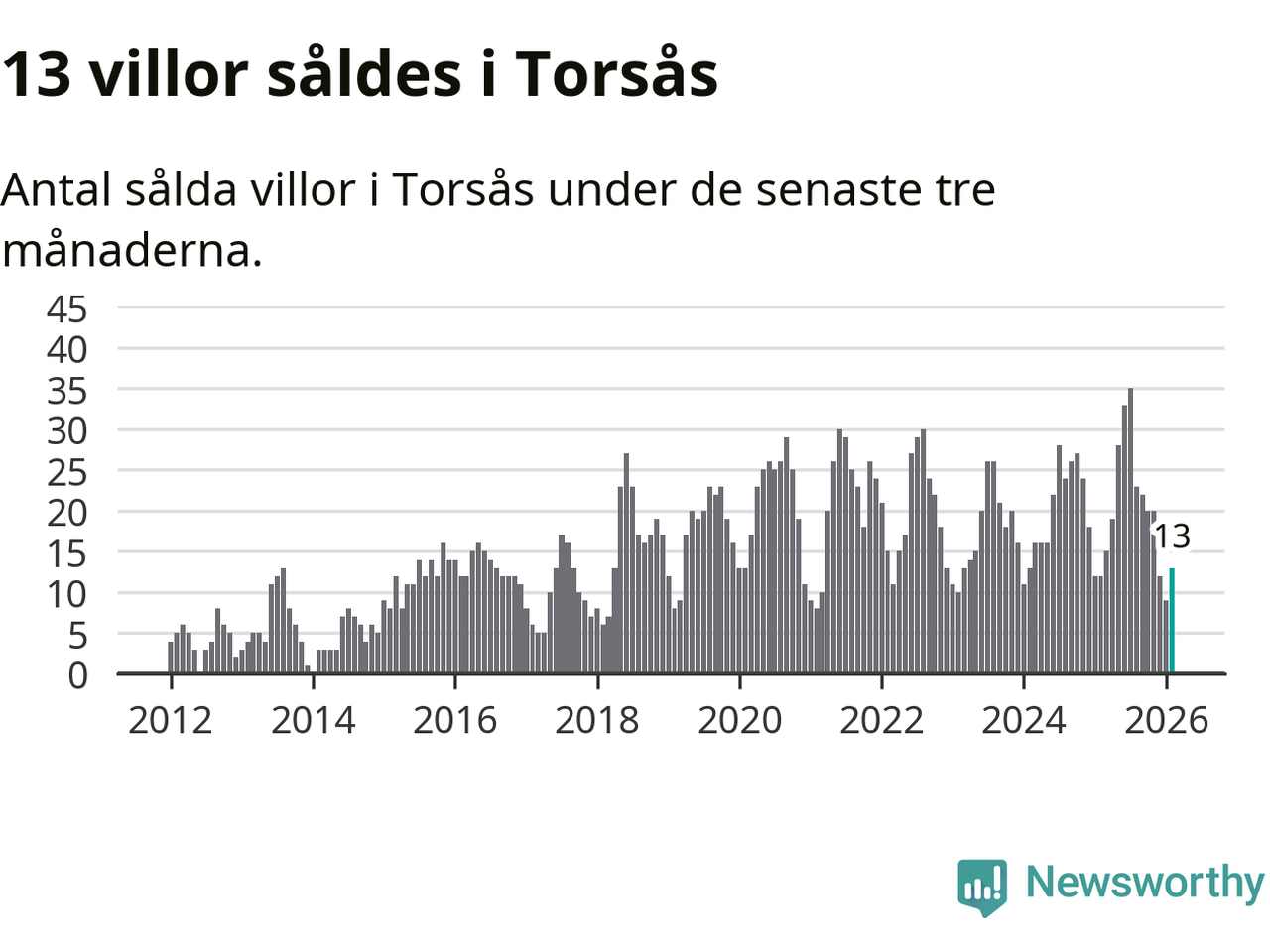 Mellan december och februari gjordes sammanlagt 13 affärer med villor i Torsås kommun. Det kan jämföras med tolv vid motsvarande tid i fjol.