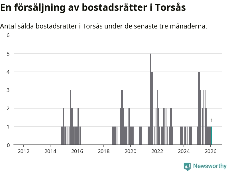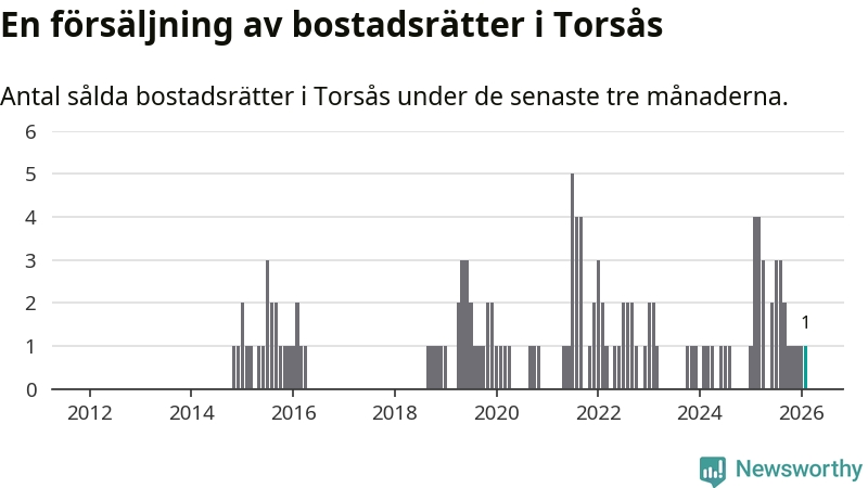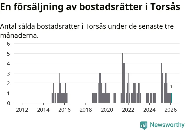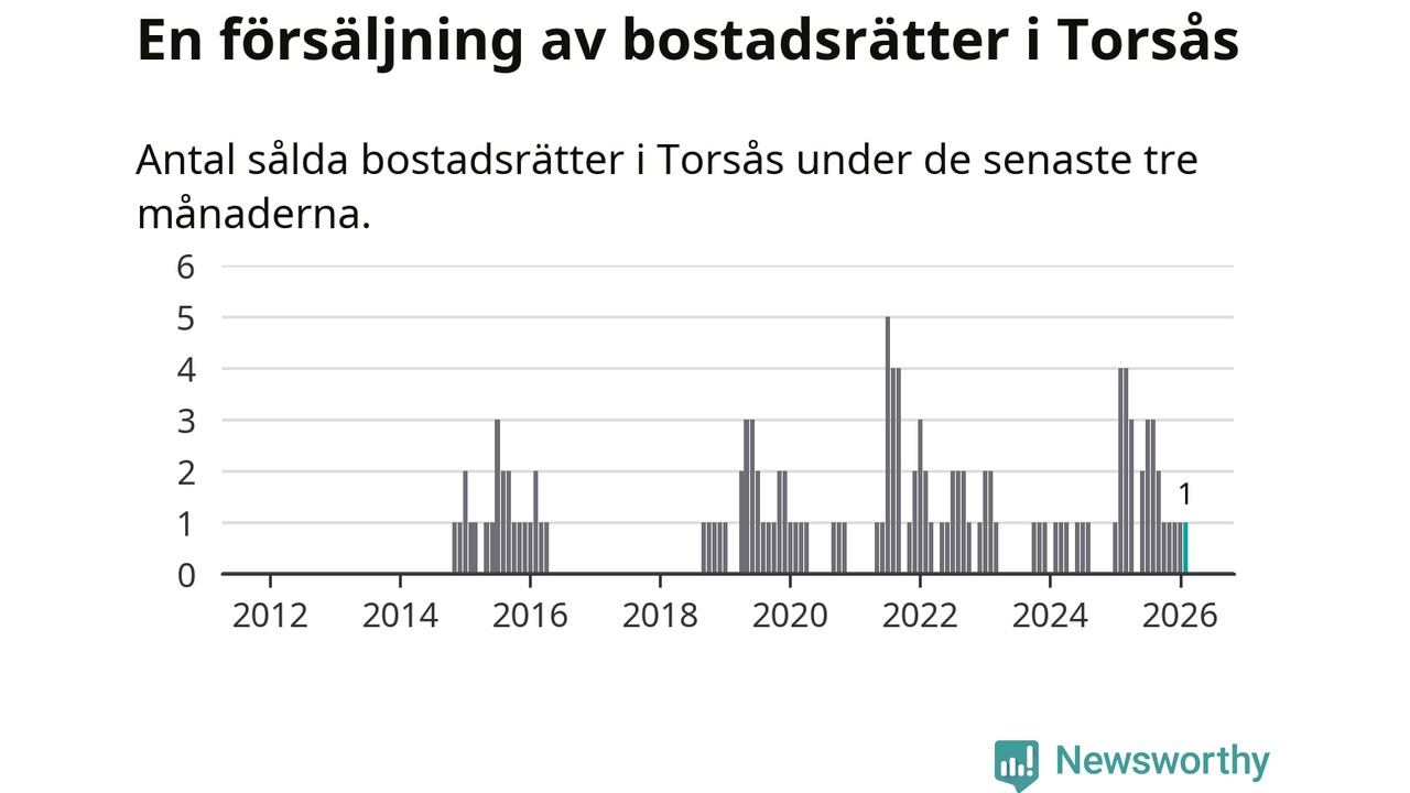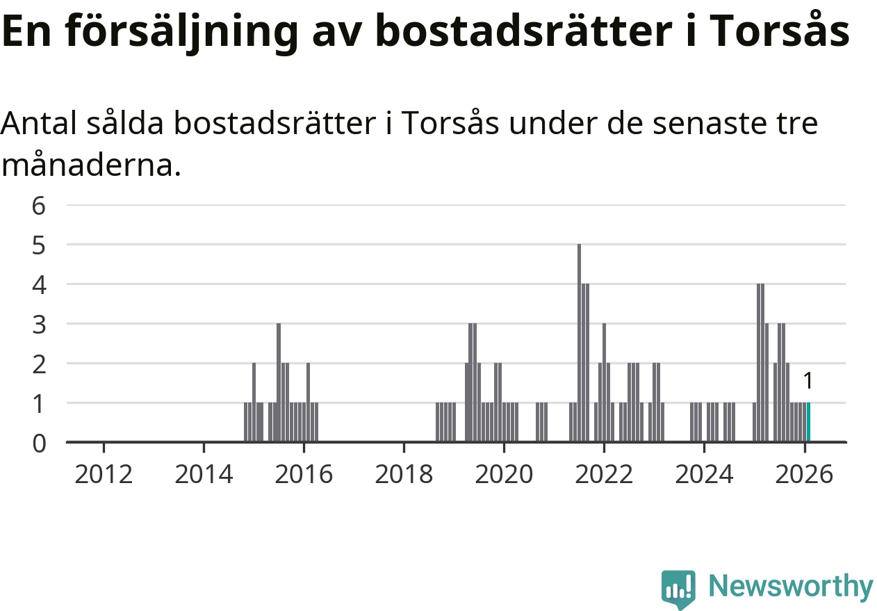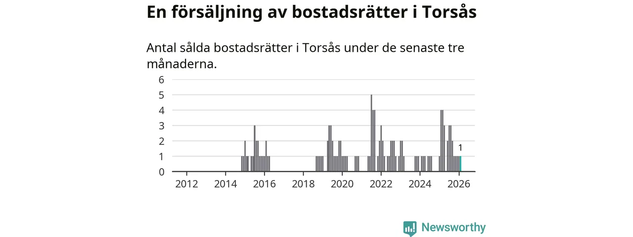 Mellan december och februari gjordes sammanlagt en affär med bostadsrätter i Torsås kommun. Det kan jämföras med fyra vid motsvarande tid i fjol.
