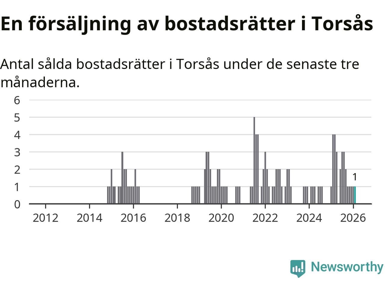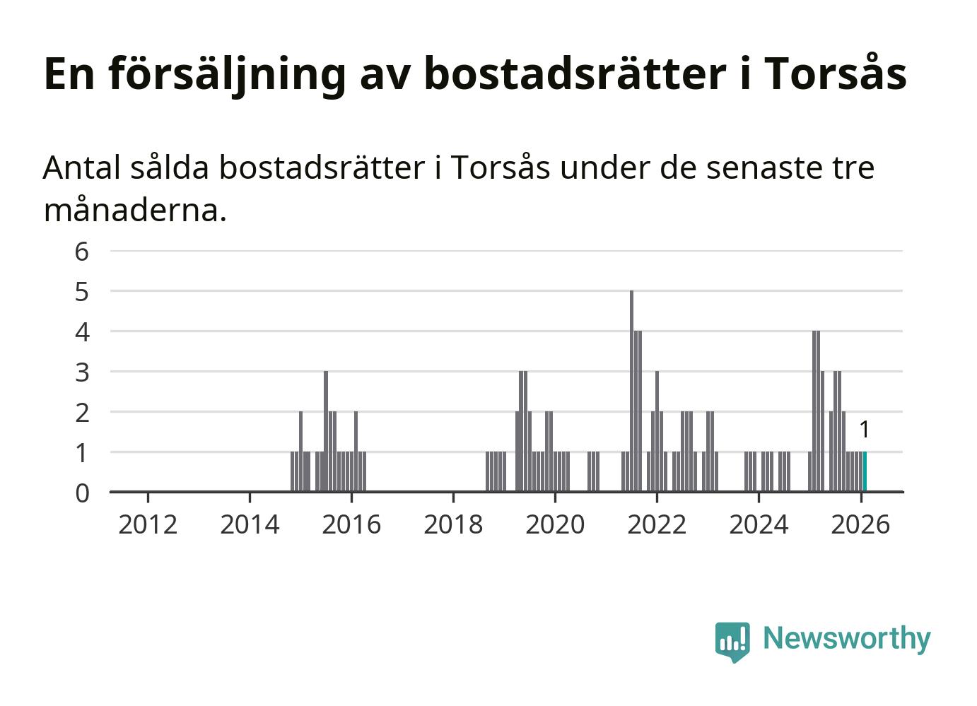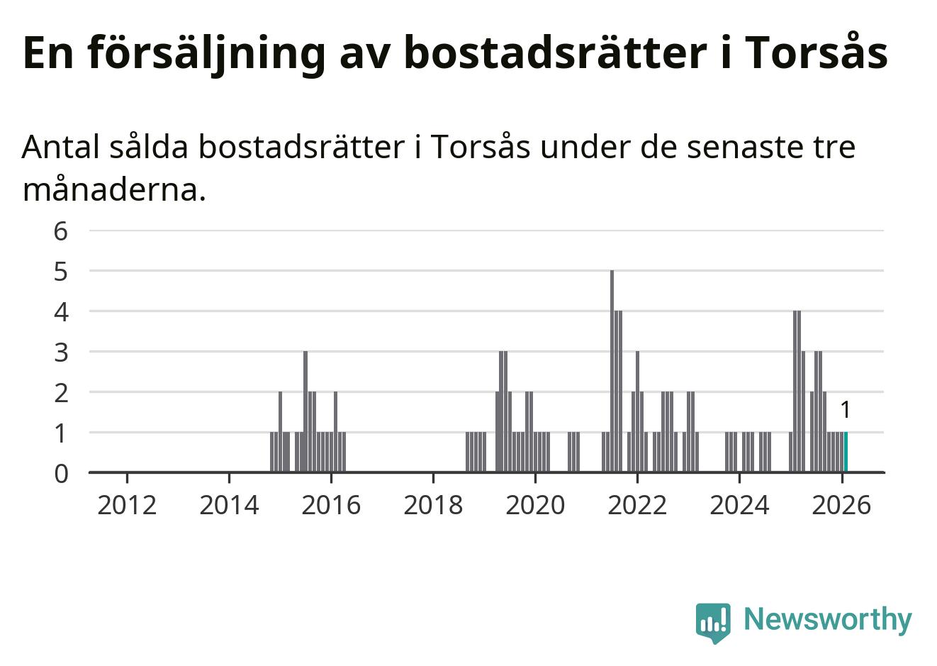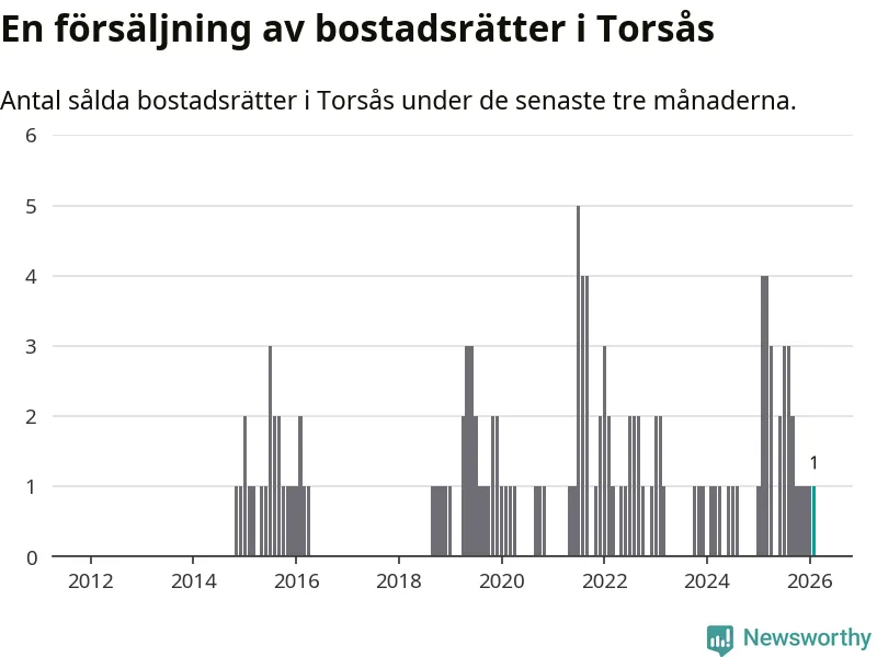 Mellan december och februari gjordes sammanlagt en affär med bostadsrätter i Torsås kommun. Det kan jämföras med fyra vid motsvarande tid i fjol.