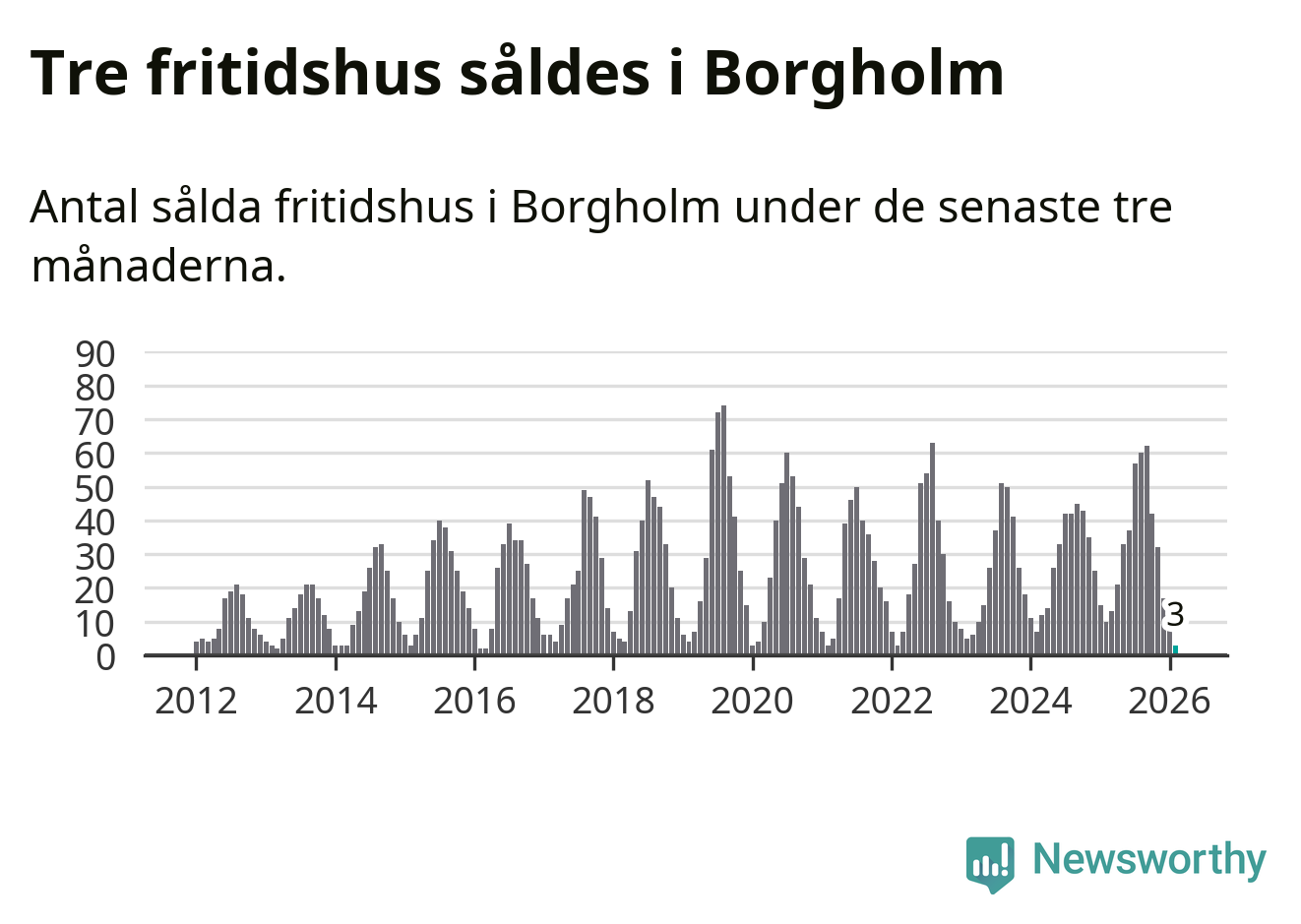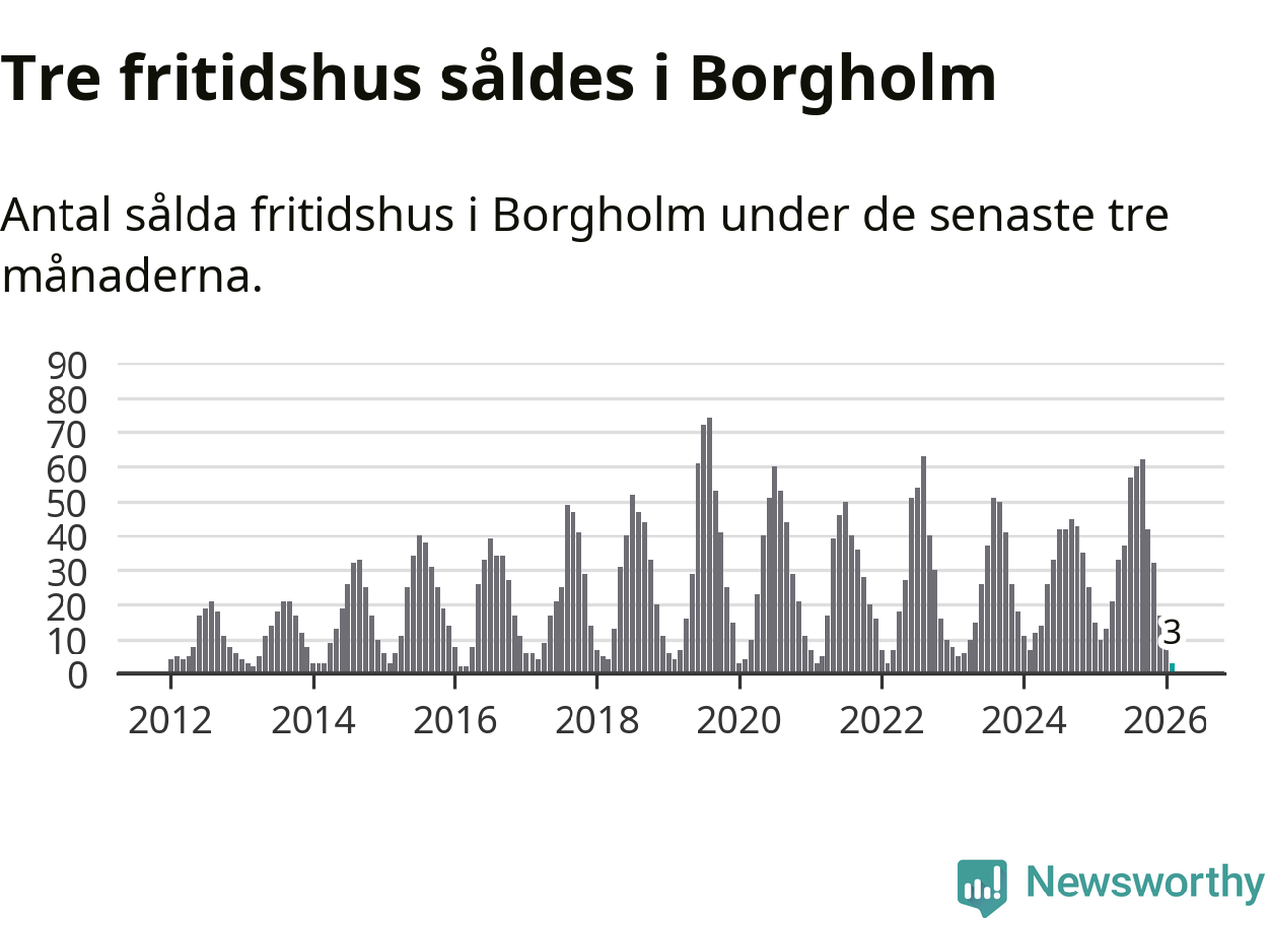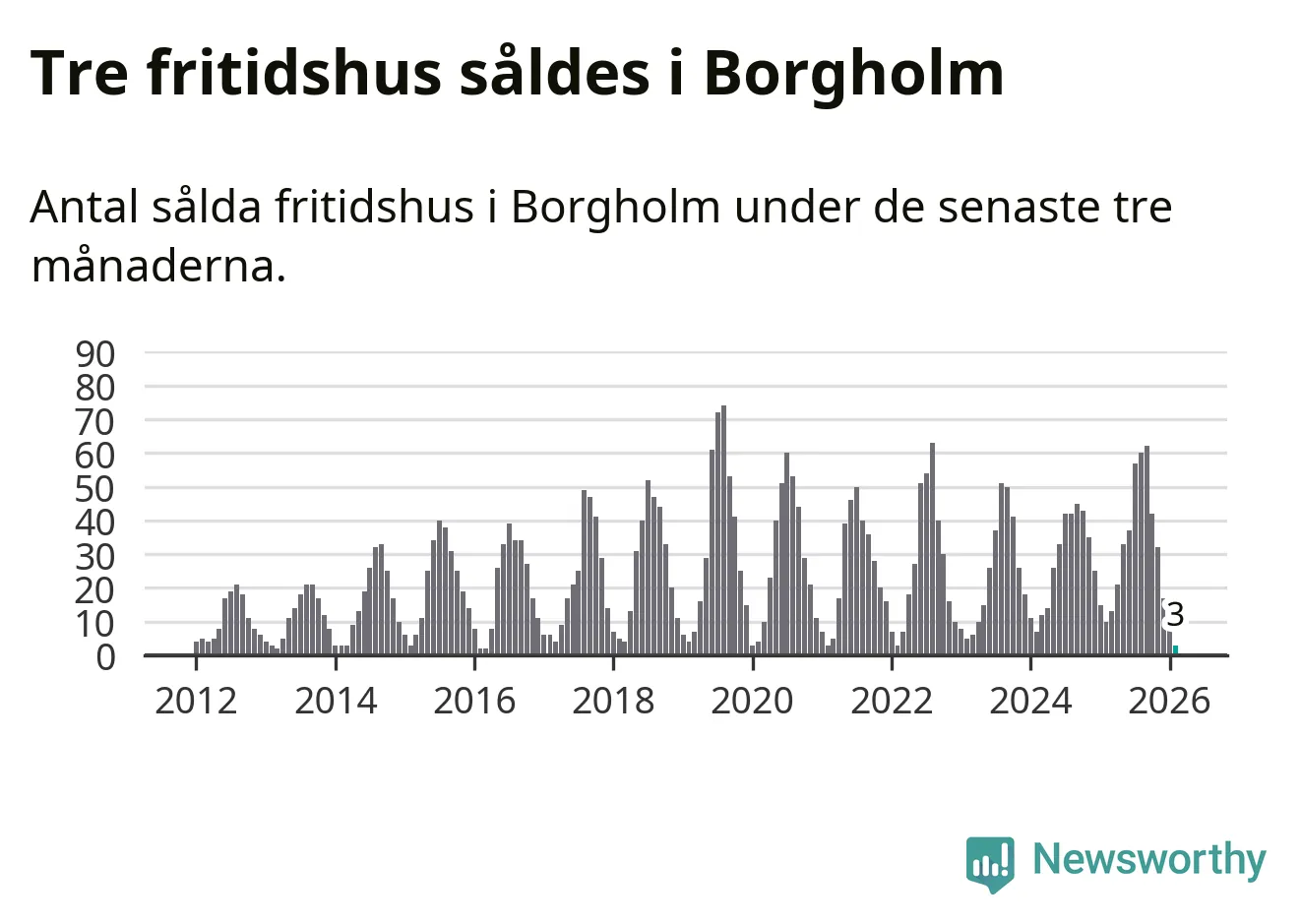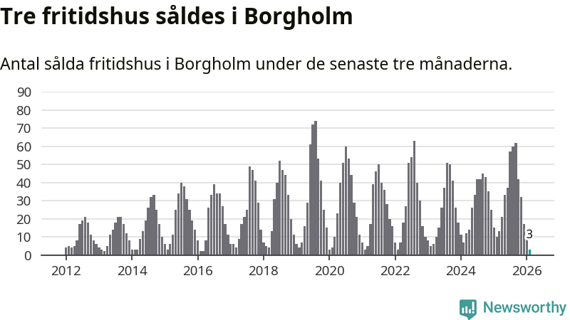 Sammanlagt såldes tre fritidshus i Borgholms kommun mellan december 2025 och februari till ett genomsnittligt pris på 2,6 miljoner kronor. Det är fler försäljningar än på fyra år. I fjol gjordes tio affärer vid den här tiden på året.