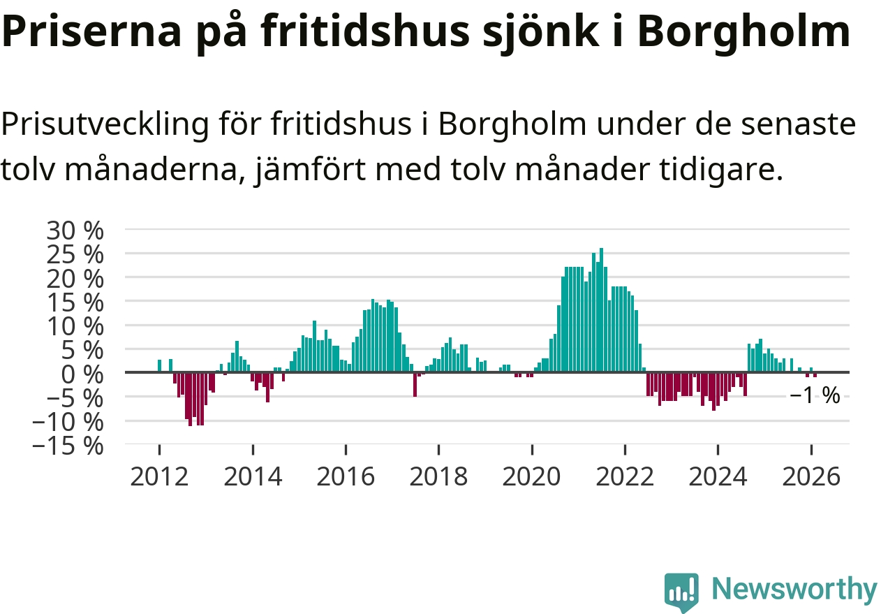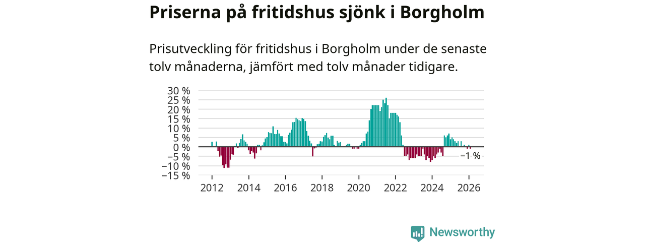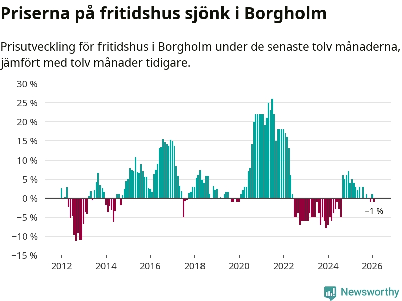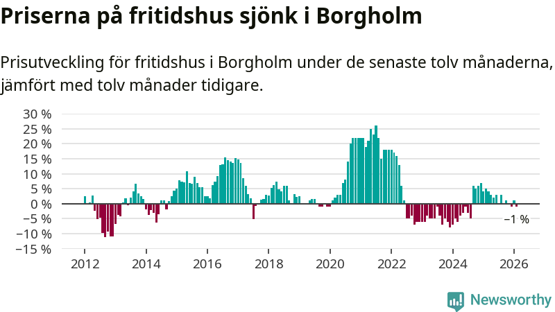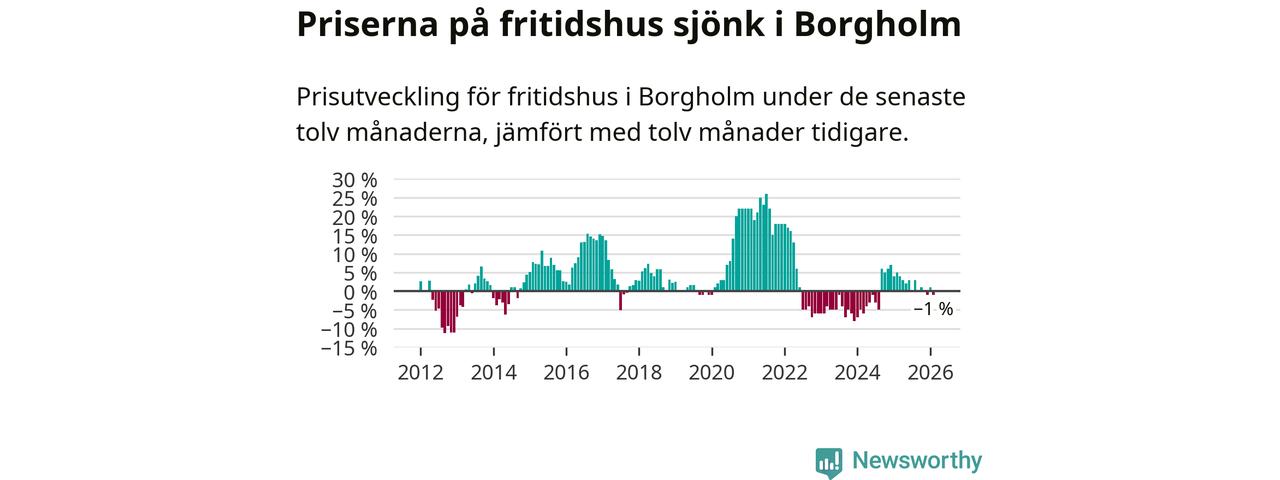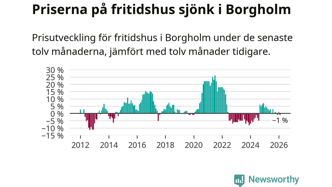 Priserna på fritidshus har gått ner i Borgholms kommun. Medelpriset på försäljningarna under de senaste tolv månaderna visar på en nedgång med 1 procent.