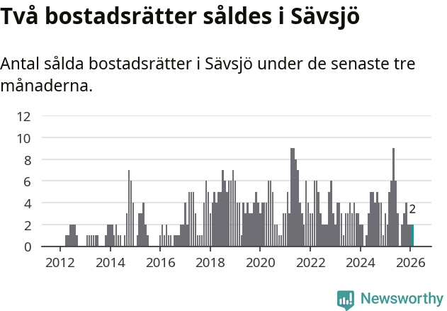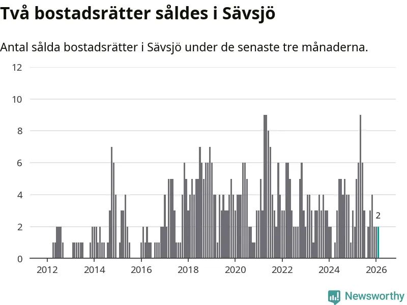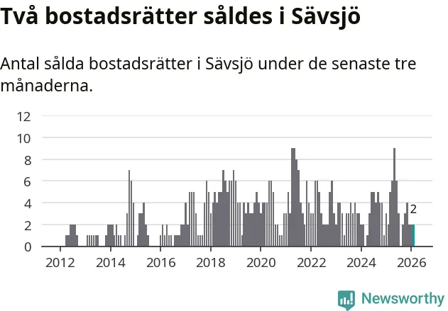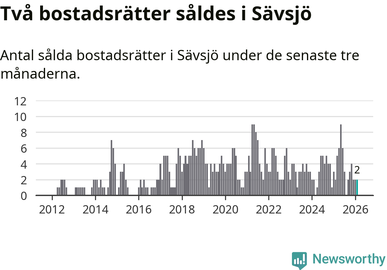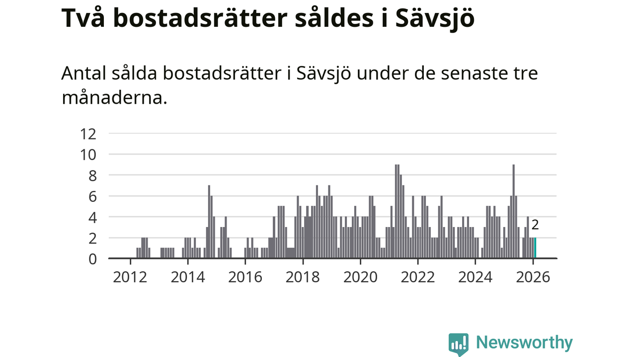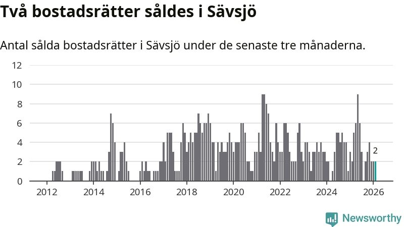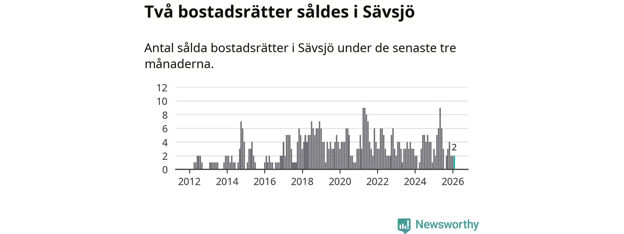 Mellan december och februari gjordes sammanlagt två affärer med bostadsrätter i Sävsjö kommun. Det är lika många affärer som vid motsvarande tid i fjol.
