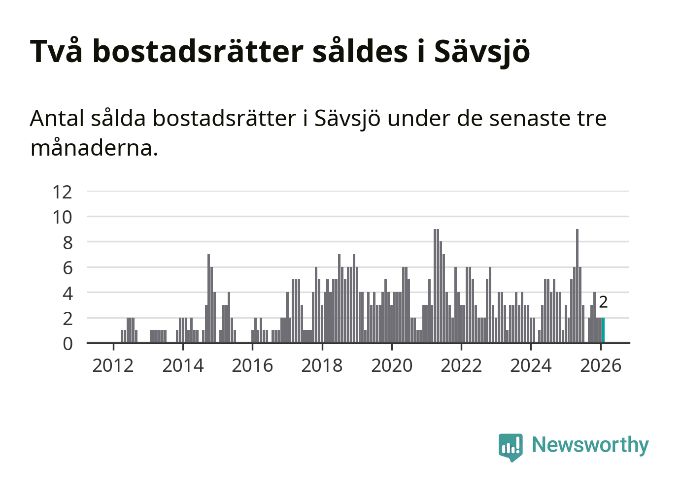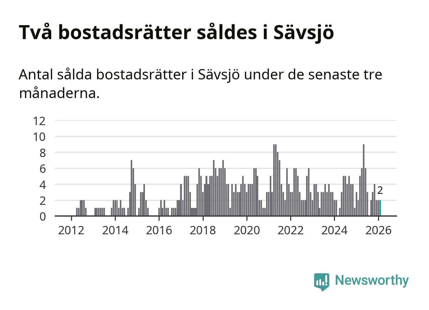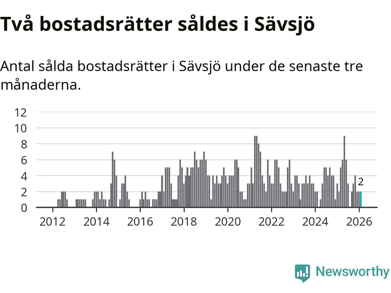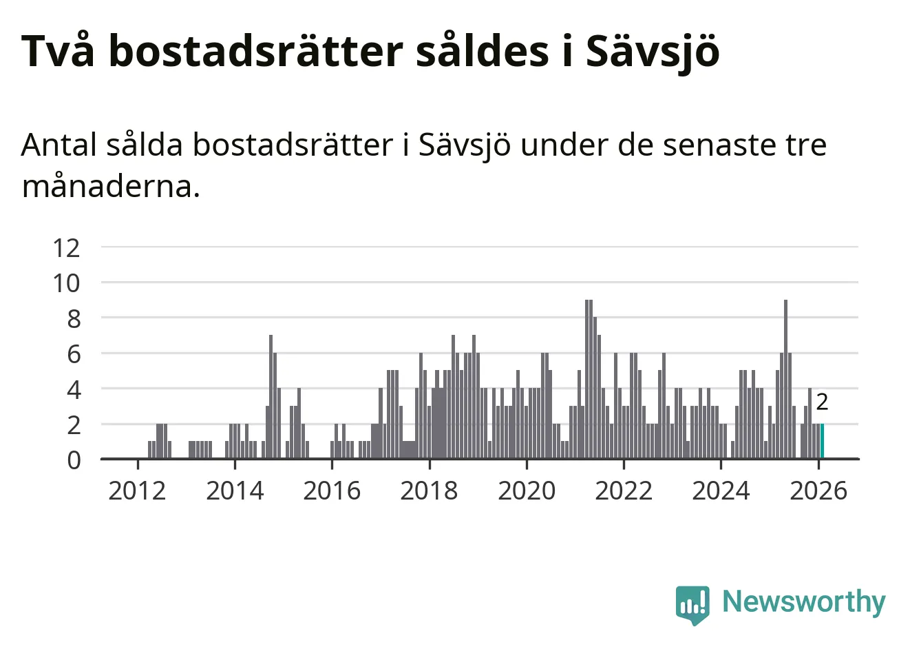 Mellan december och februari gjordes sammanlagt två affärer med bostadsrätter i Sävsjö kommun. Det är lika många affärer som vid motsvarande tid i fjol.
