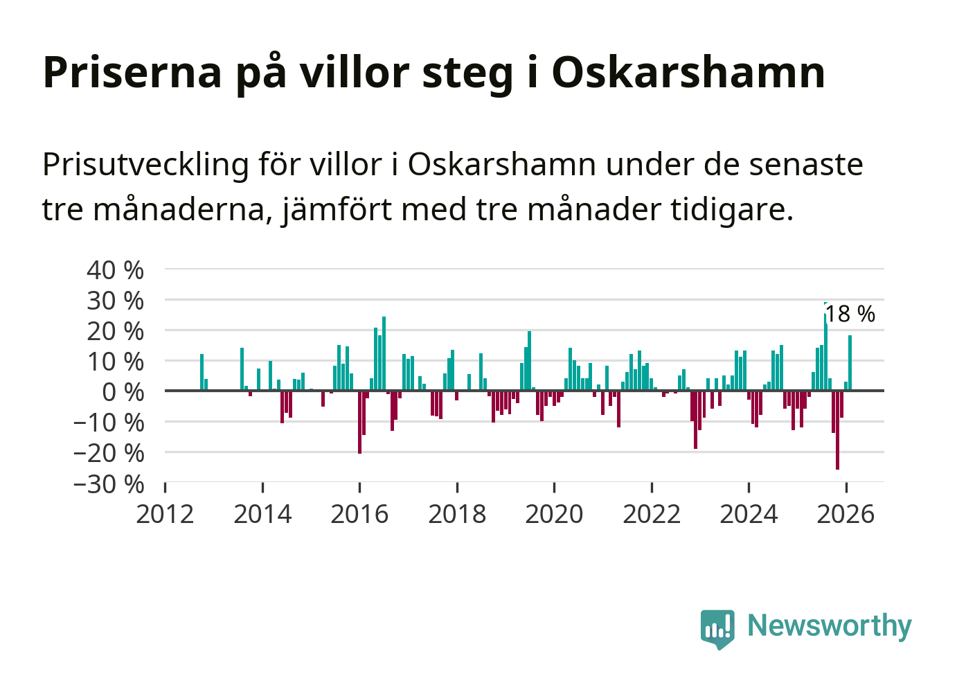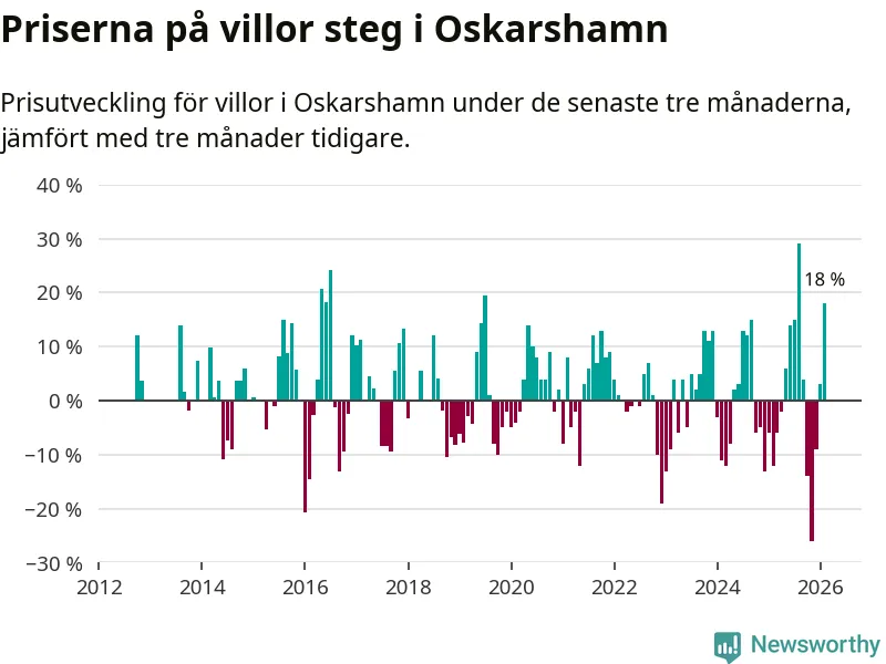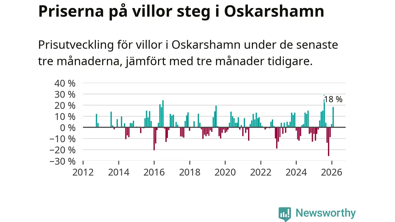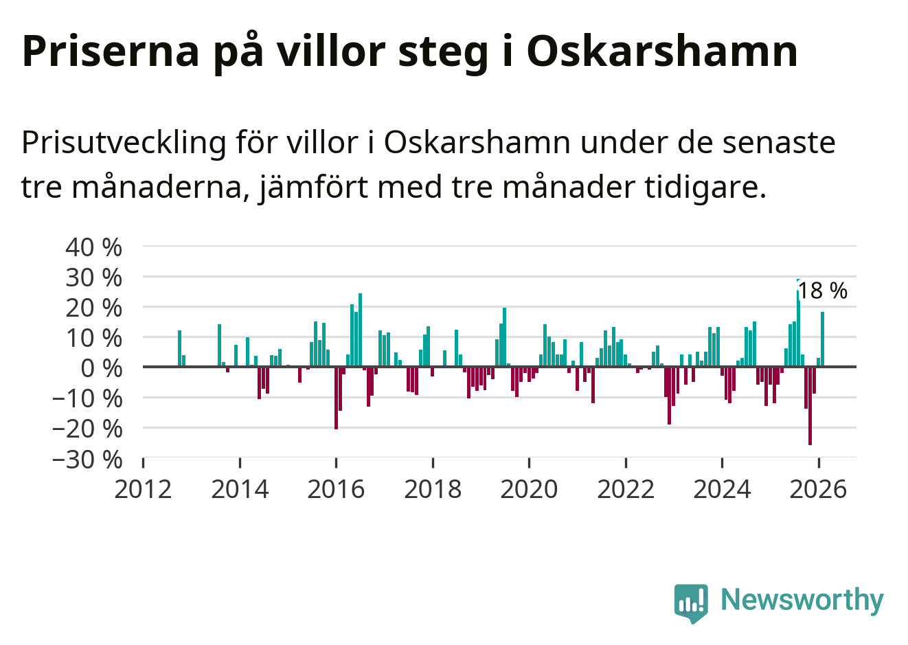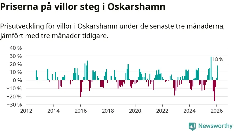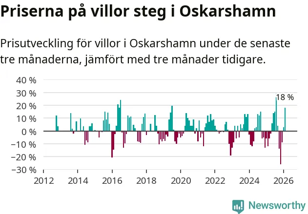 Villapriserna steg mellan december och februari med 18 procent i Oskarshamns kommun. Det är en betydande uppgång jämfört med det gångna året då priserna i snitt ökat med 3 procent.