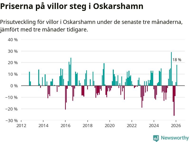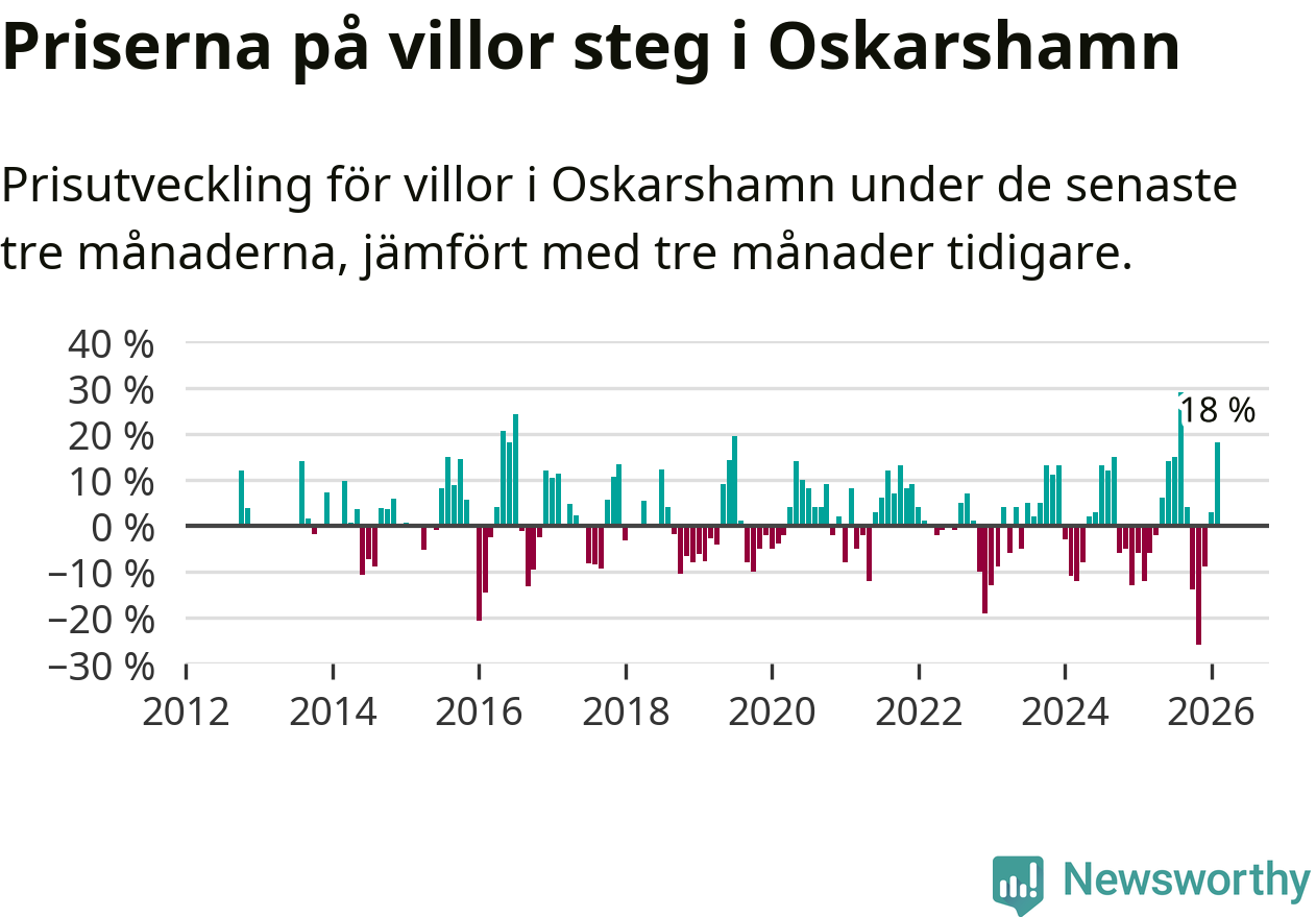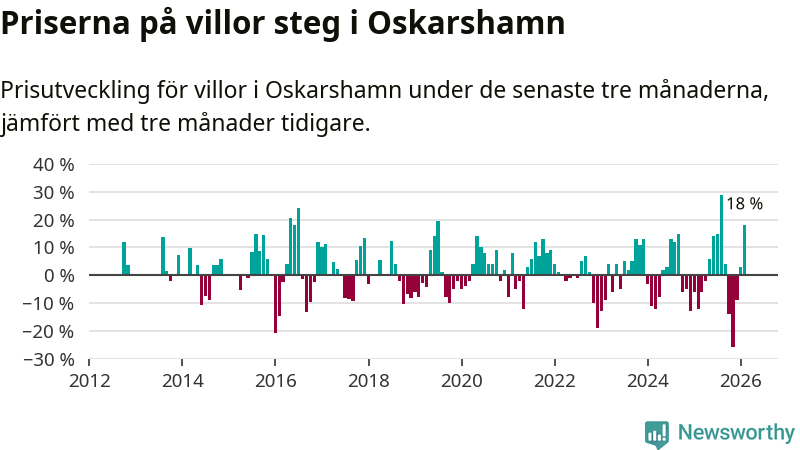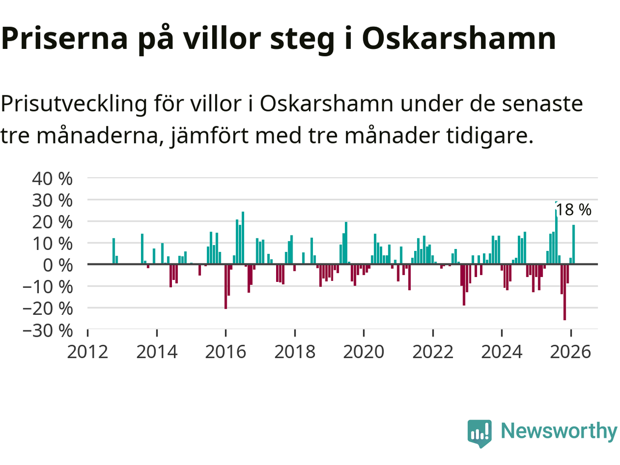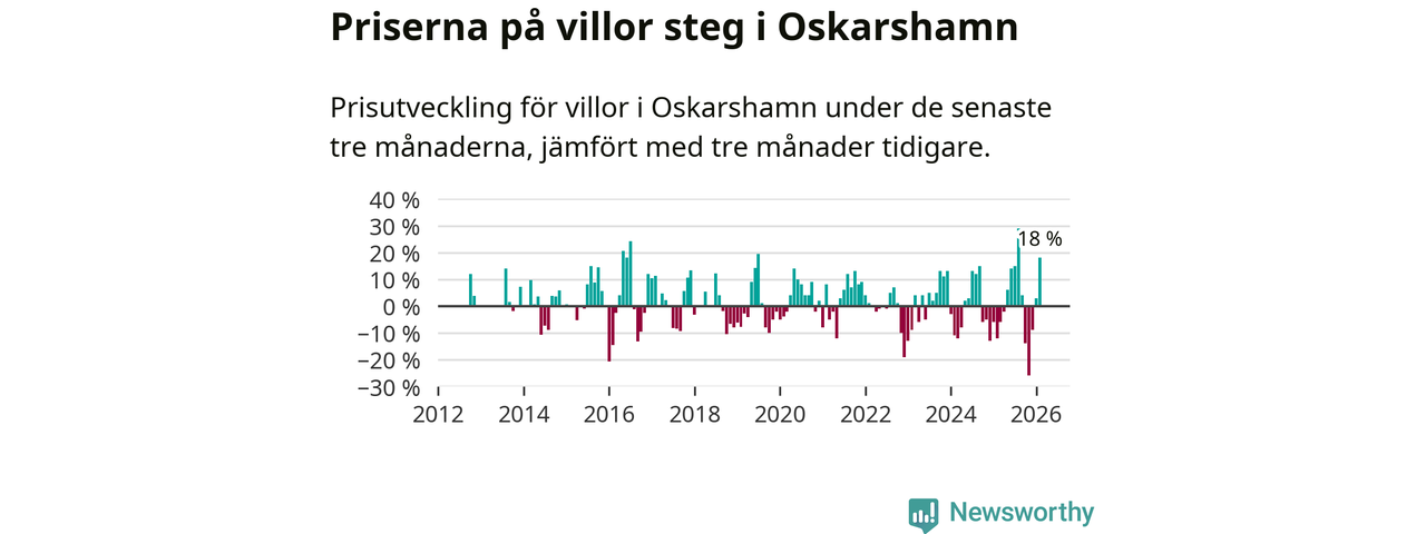 Villapriserna steg mellan december och februari med 18 procent i Oskarshamns kommun. Det är en betydande uppgång jämfört med det gångna året då priserna i snitt ökat med 3 procent.