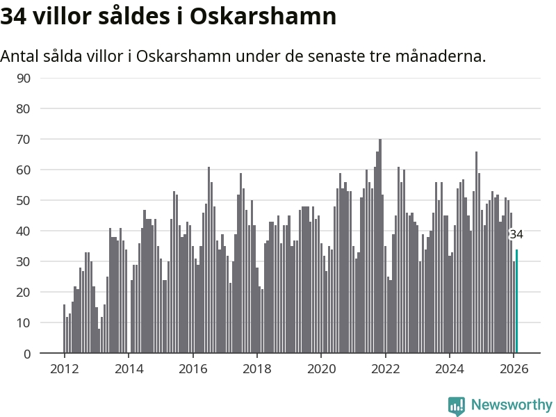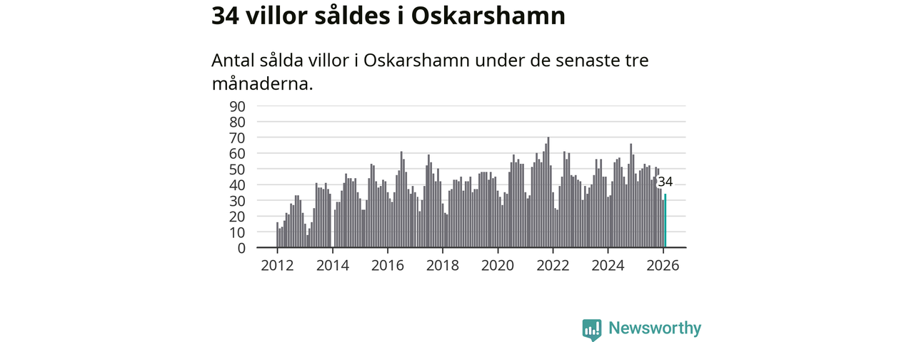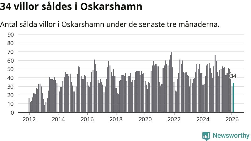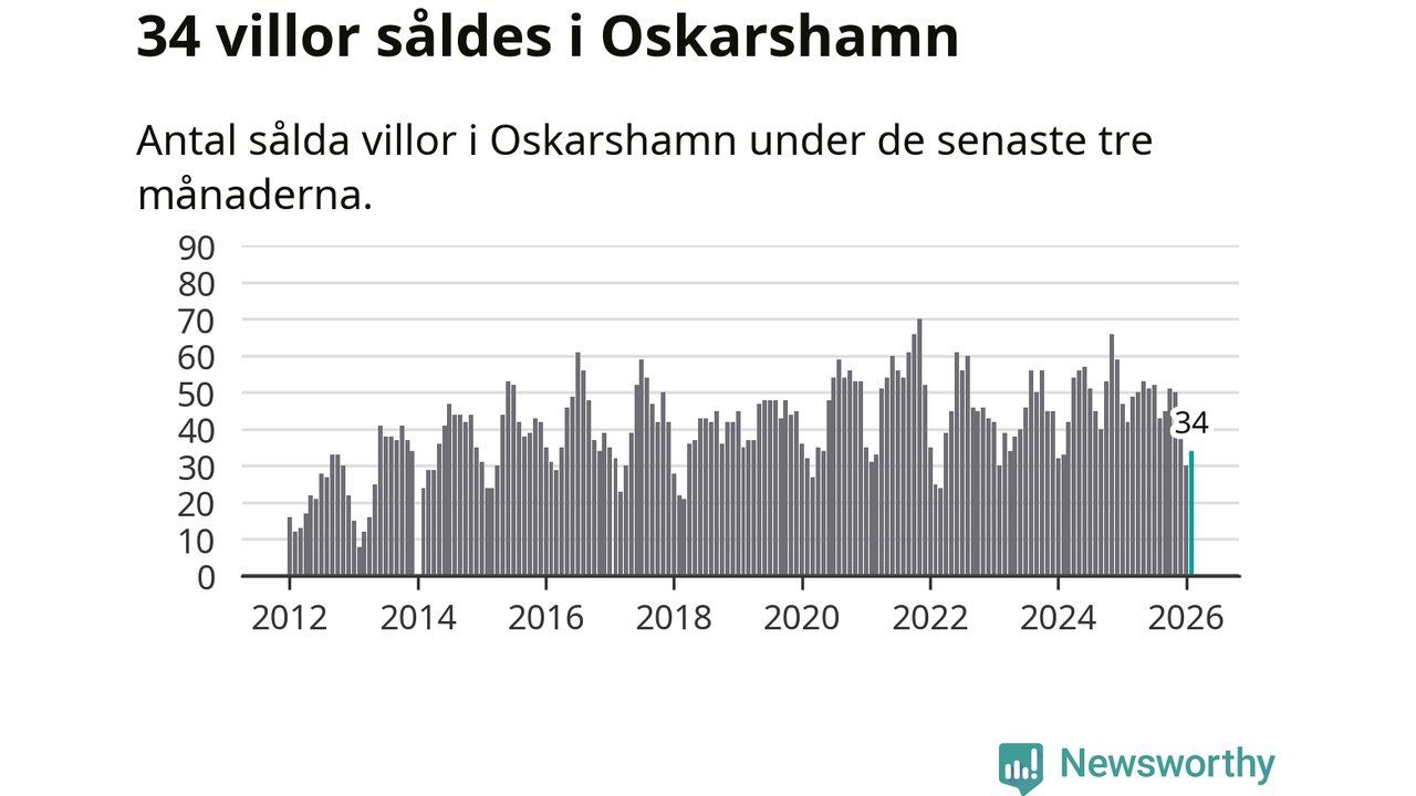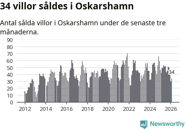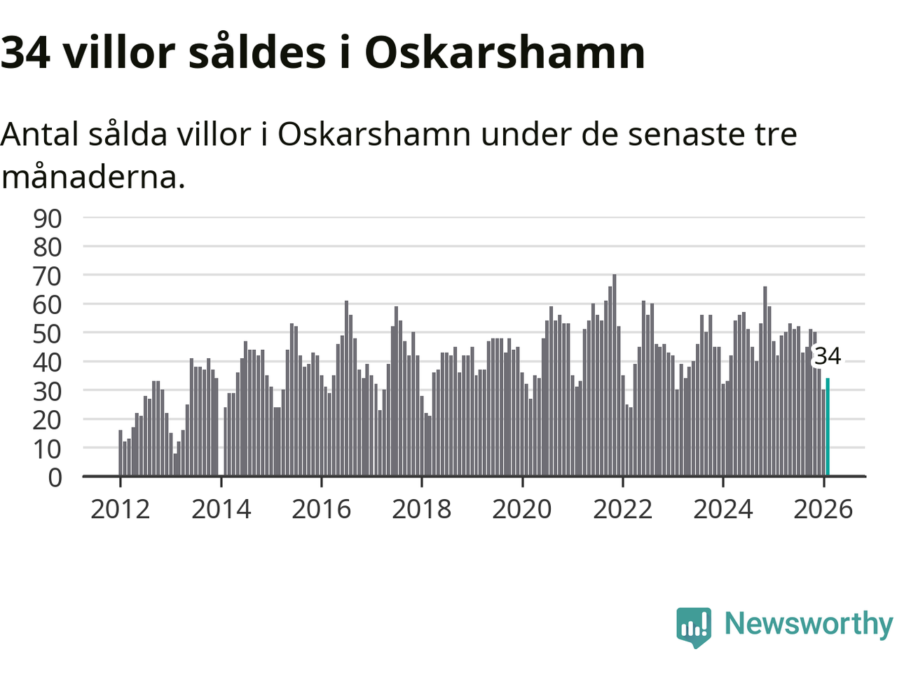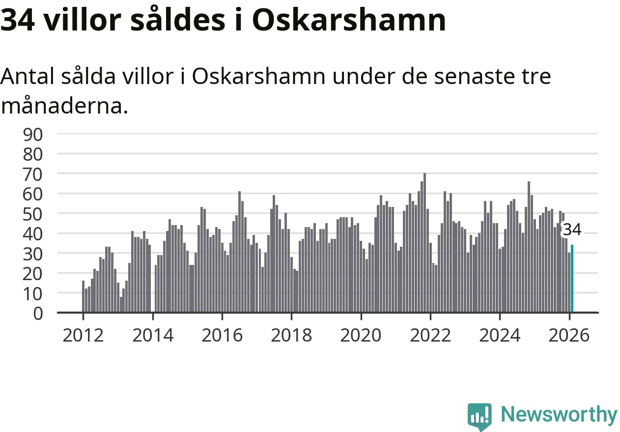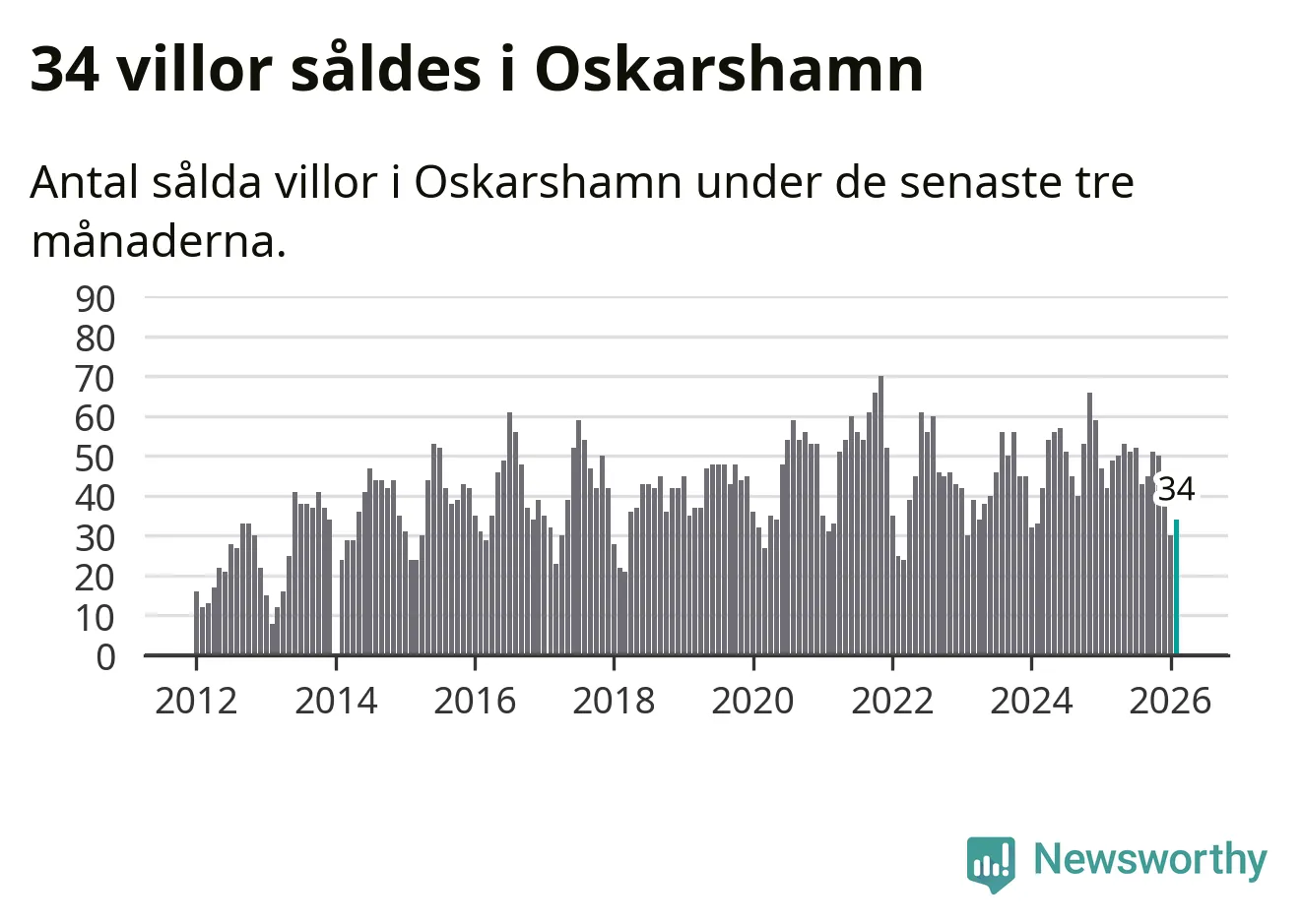Sammanlagt såldes 34 villor i Oskarshamns kommun mellan december och februari till ett genomsnittligt pris på 2,2 miljoner kronor. I fjol gjordes 42 affärer vid den här tiden på året.