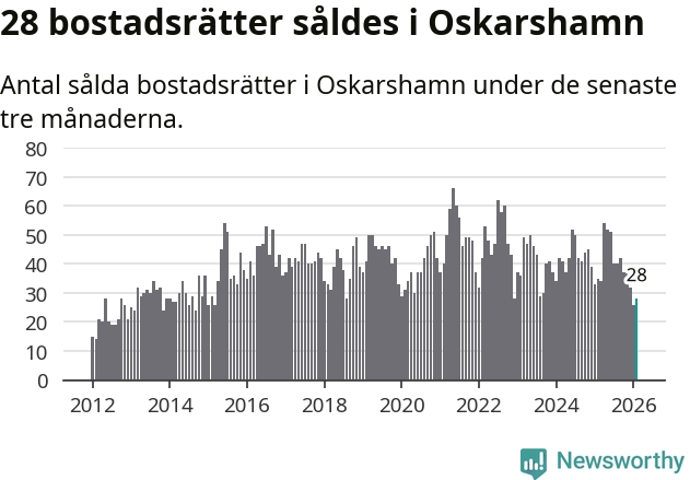 Sammanlagt såldes 28 bostadsrätter i Oskarshamns kommun mellan december och februari till ett genomsnittligt pris på 0,7 miljoner kronor. I fjol gjordes 35 affärer vid den här tiden på året.
