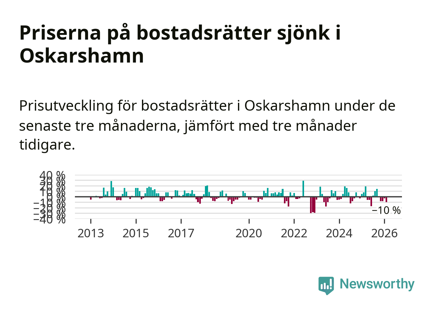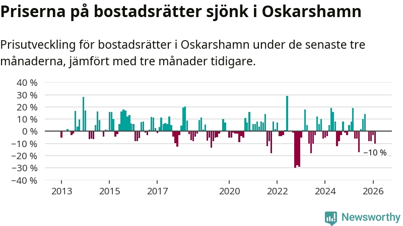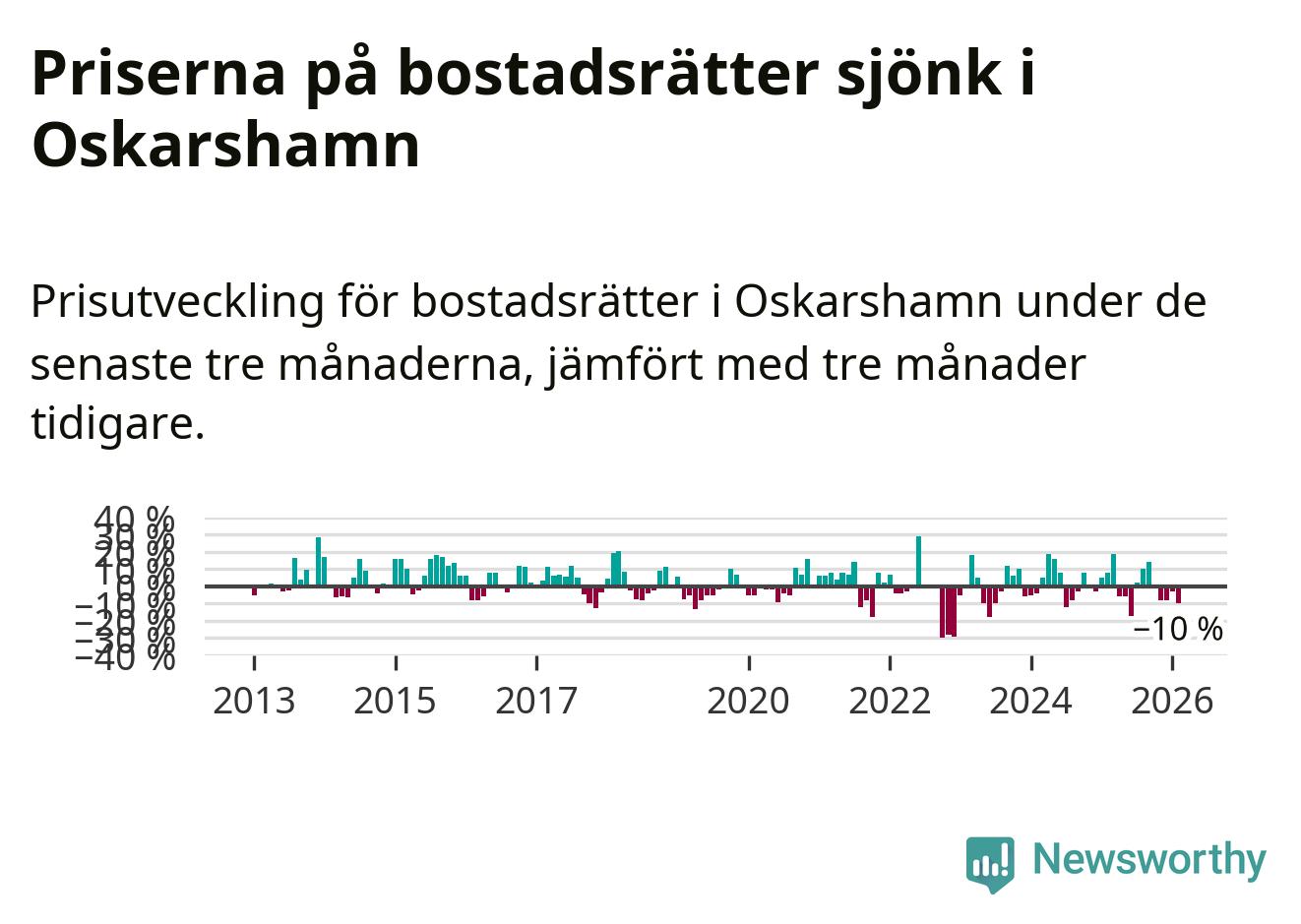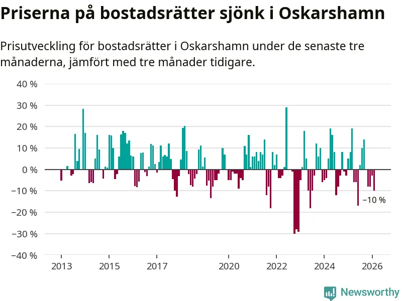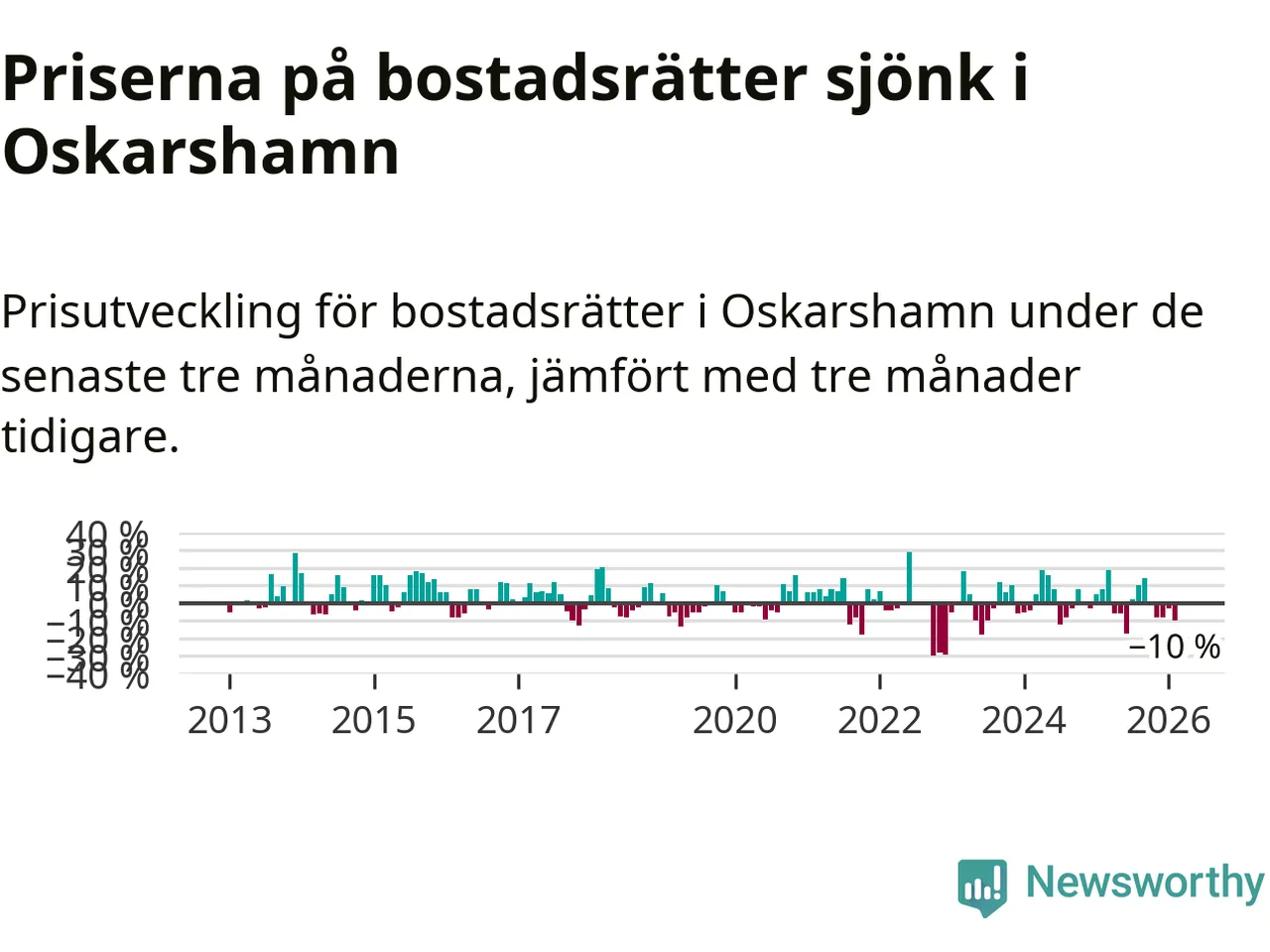 Priserna på bostadsrätter har gått ner i Oskarshamns kommun. Medelpriset på försäljningarna under de senaste tre månaderna visar på en nedgång med 10 procent.