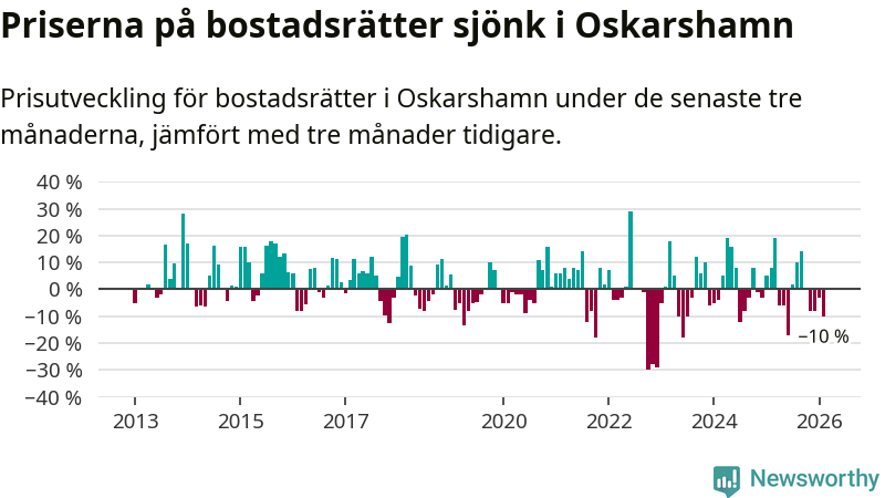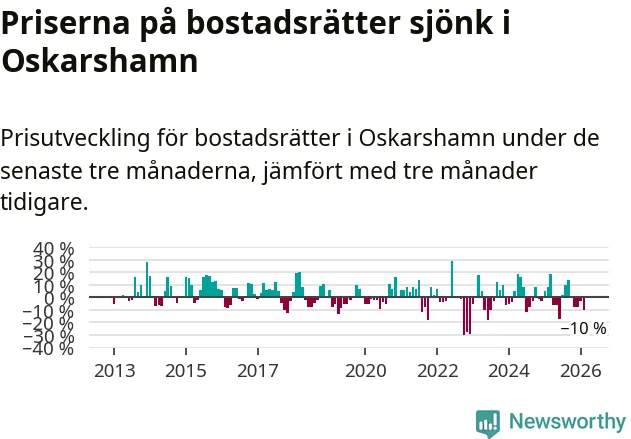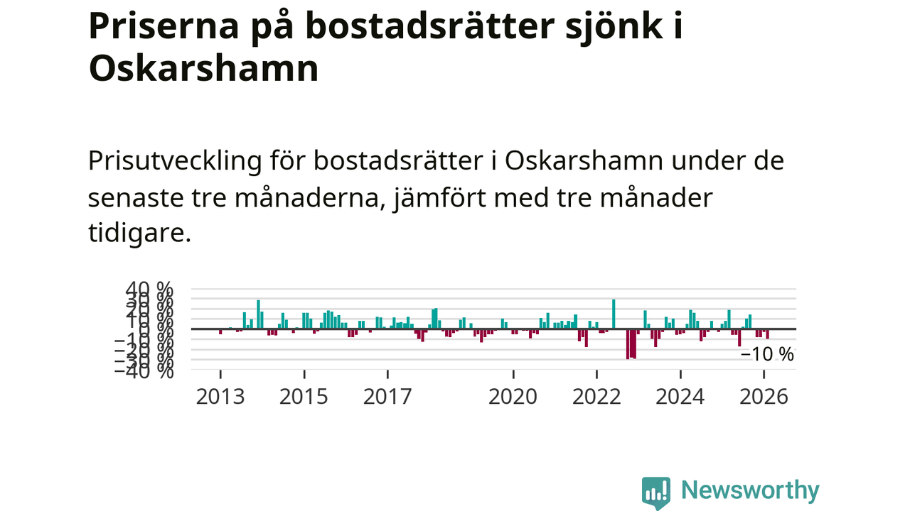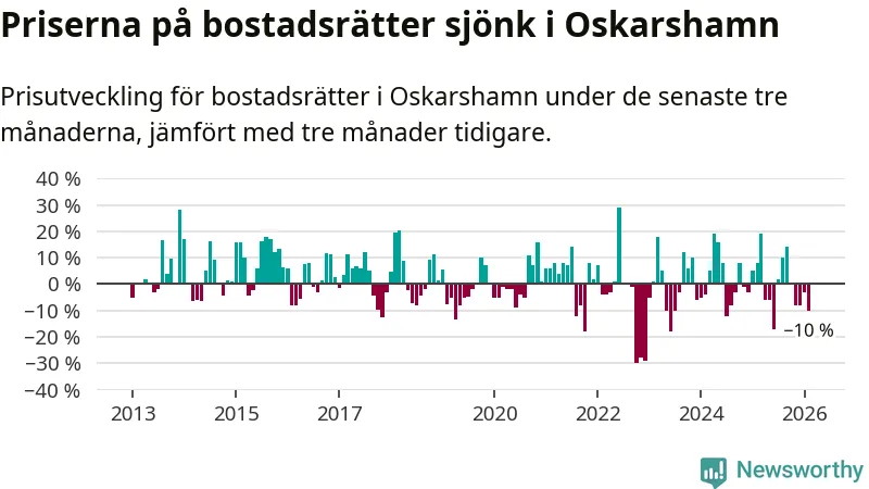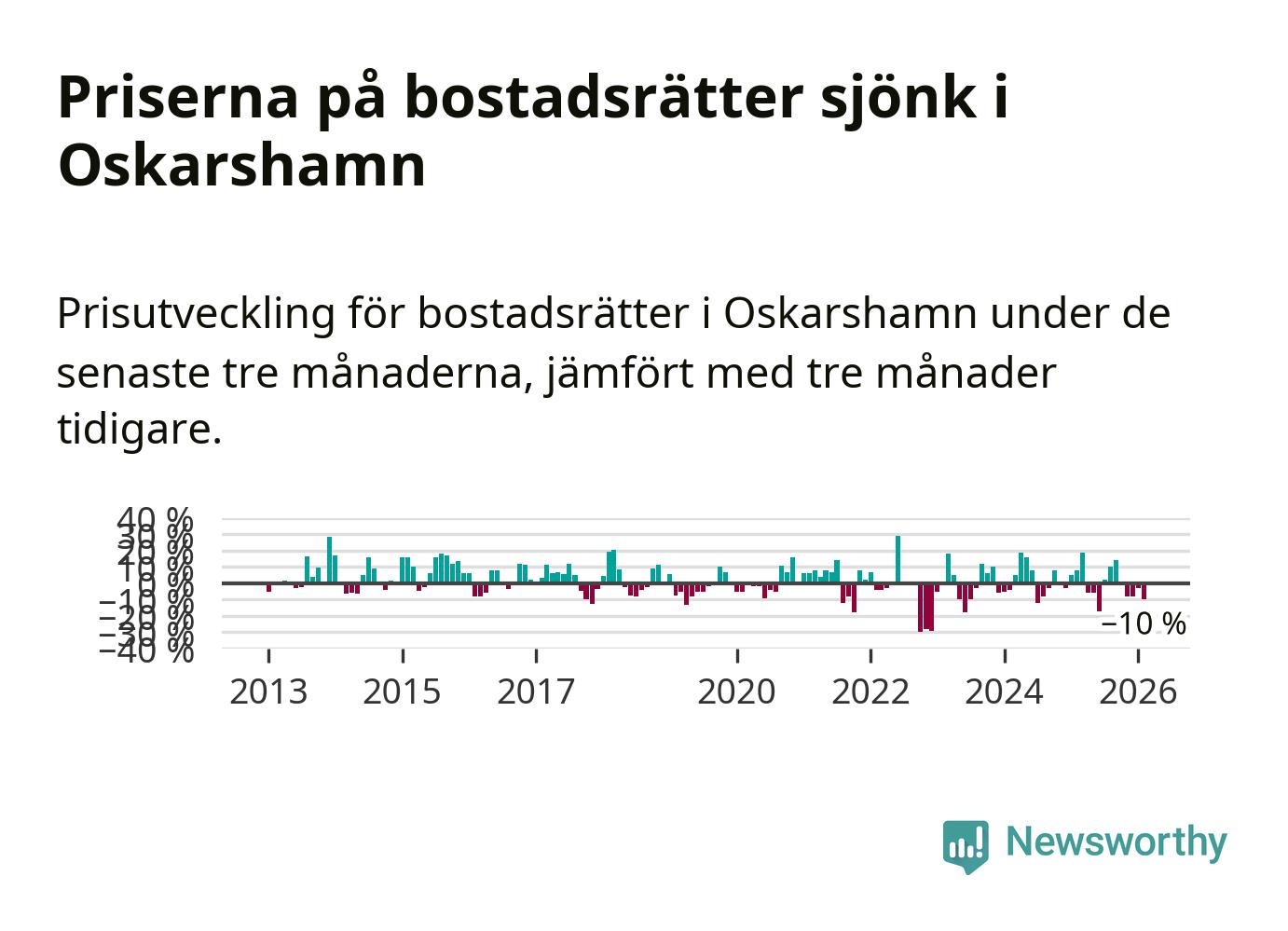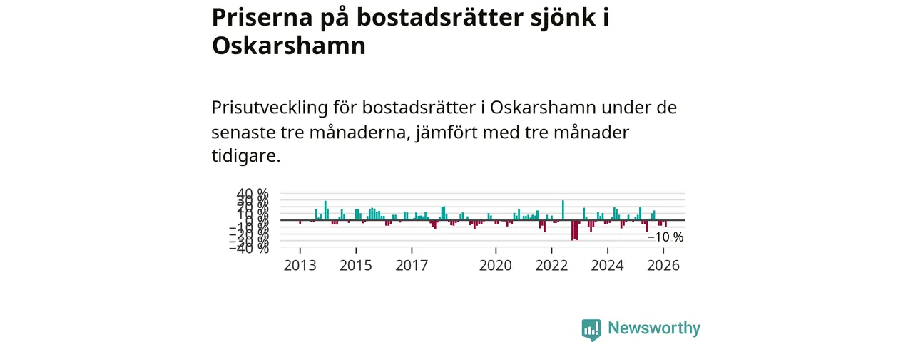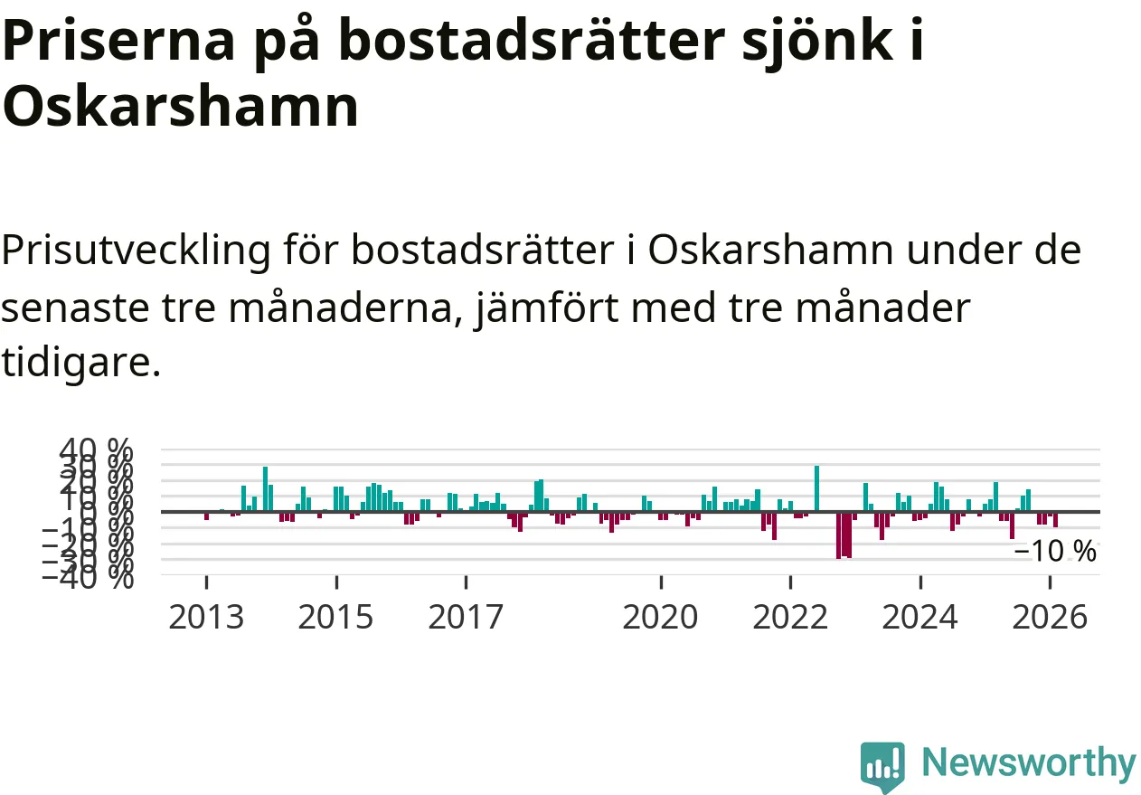 Priserna på bostadsrätter har gått ner i Oskarshamns kommun. Medelpriset på försäljningarna under de senaste tre månaderna visar på en nedgång med 10 procent.