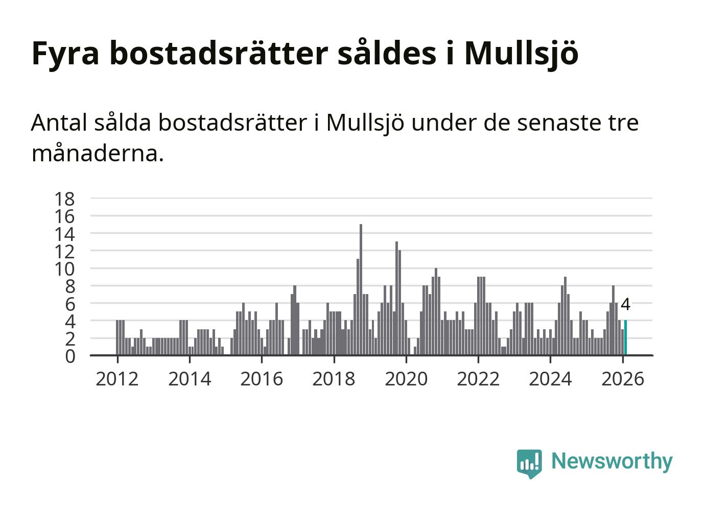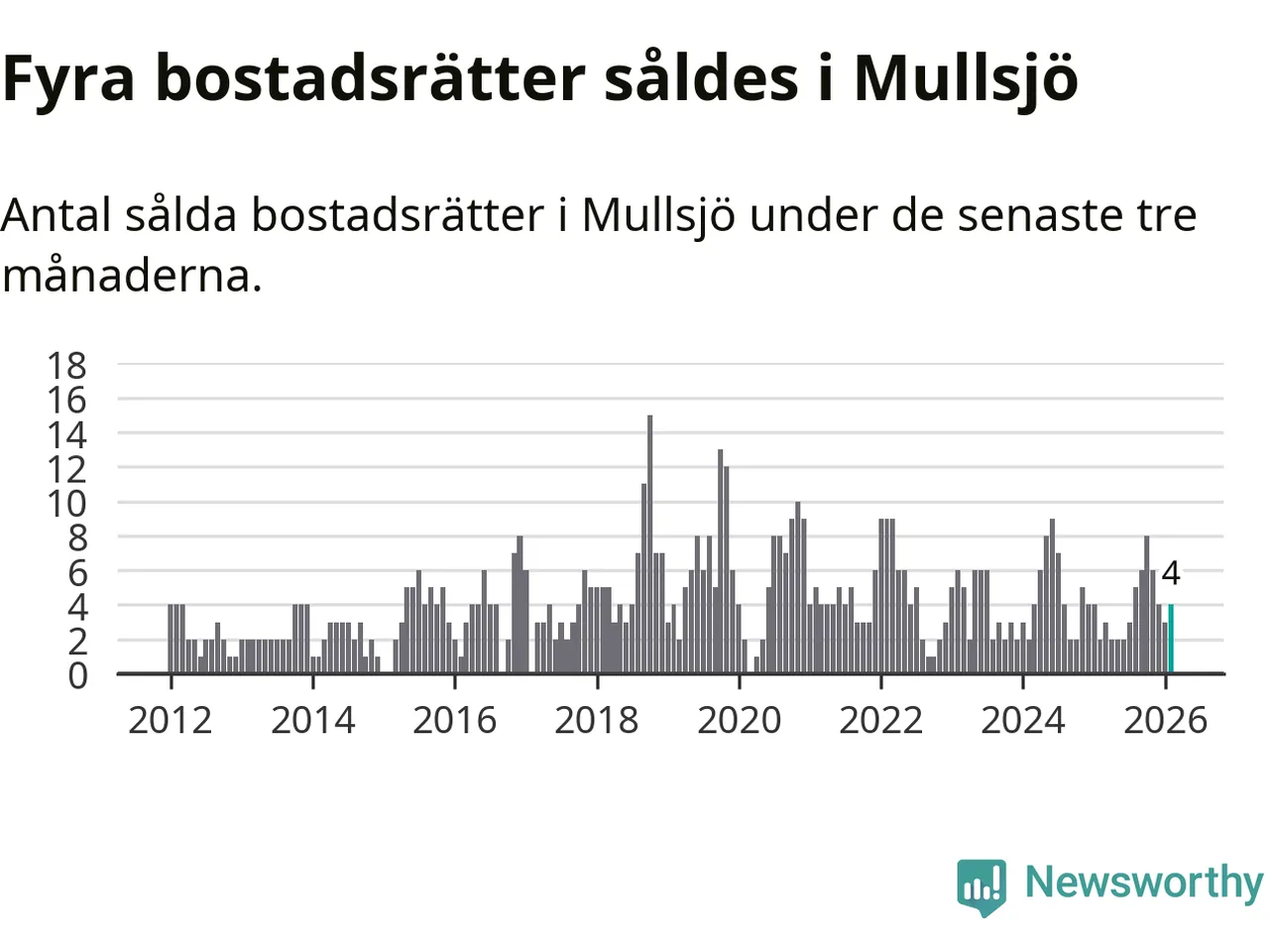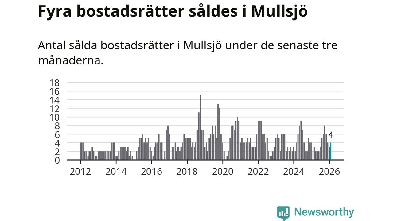 Mellan december och februari gjordes sammanlagt fyra affärer med bostadsrätter i Mullsjö kommun. Det kan jämföras med två vid motsvarande tid i fjol.