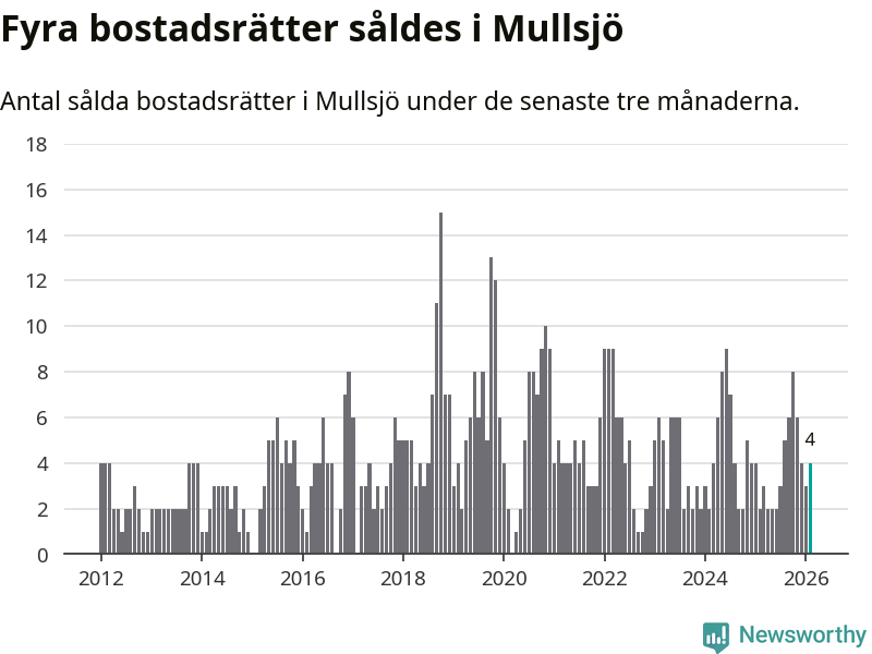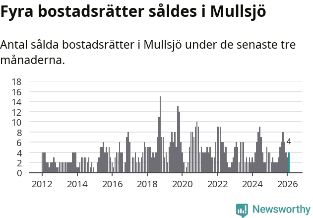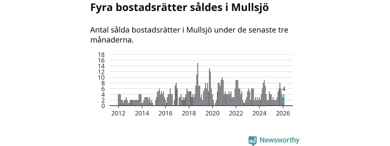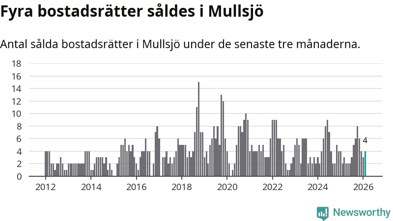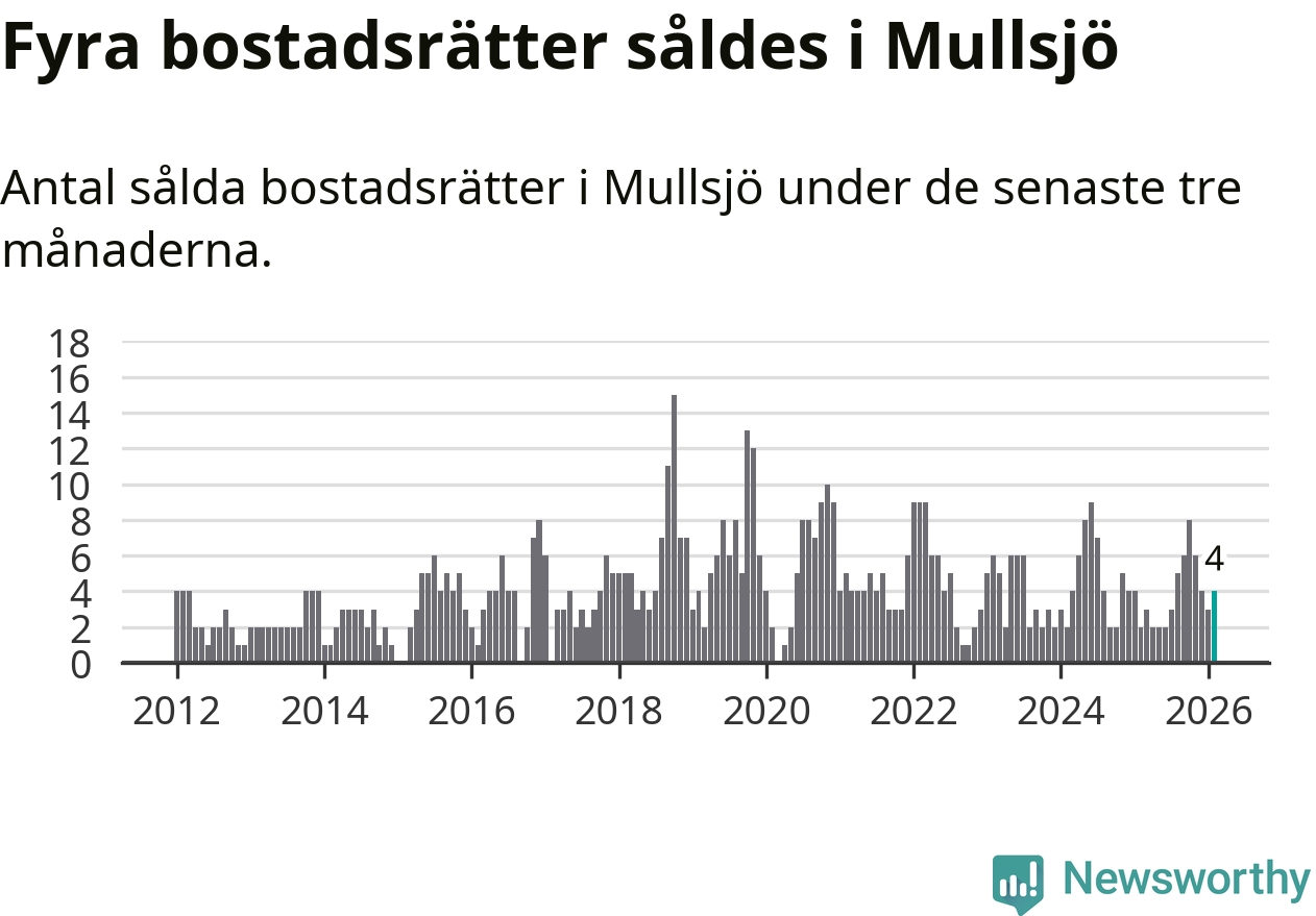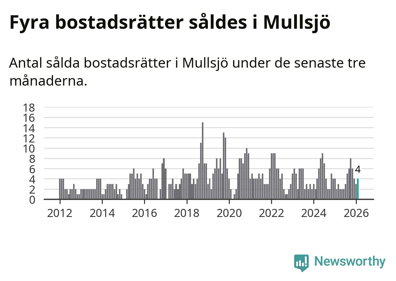 Mellan december och februari gjordes sammanlagt fyra affärer med bostadsrätter i Mullsjö kommun. Det kan jämföras med två vid motsvarande tid i fjol.