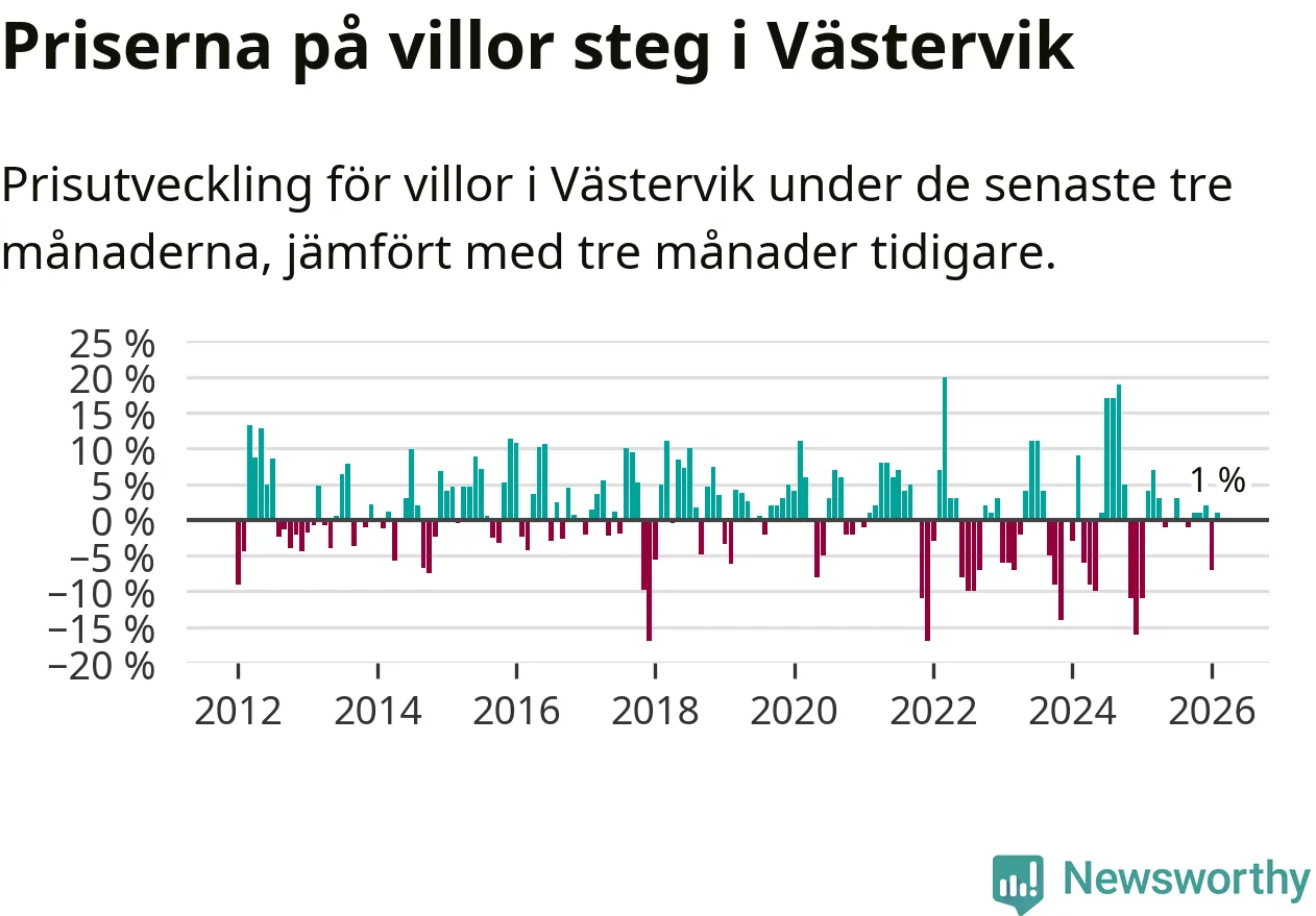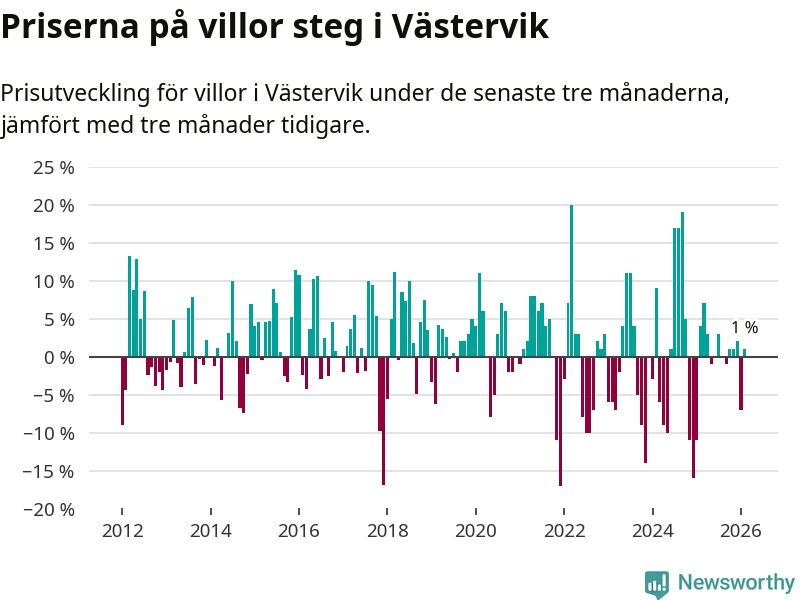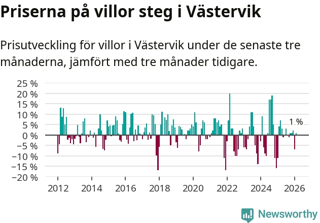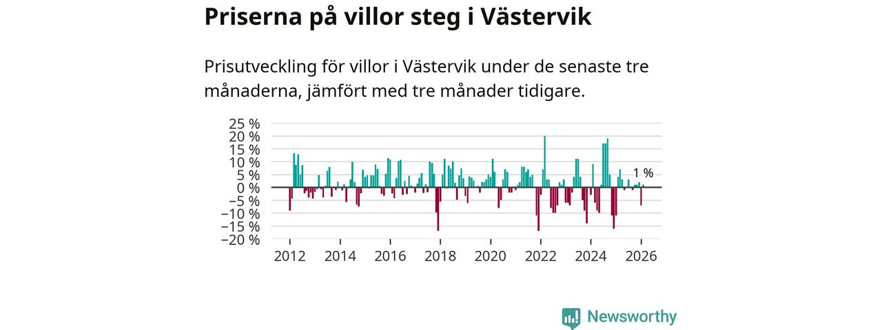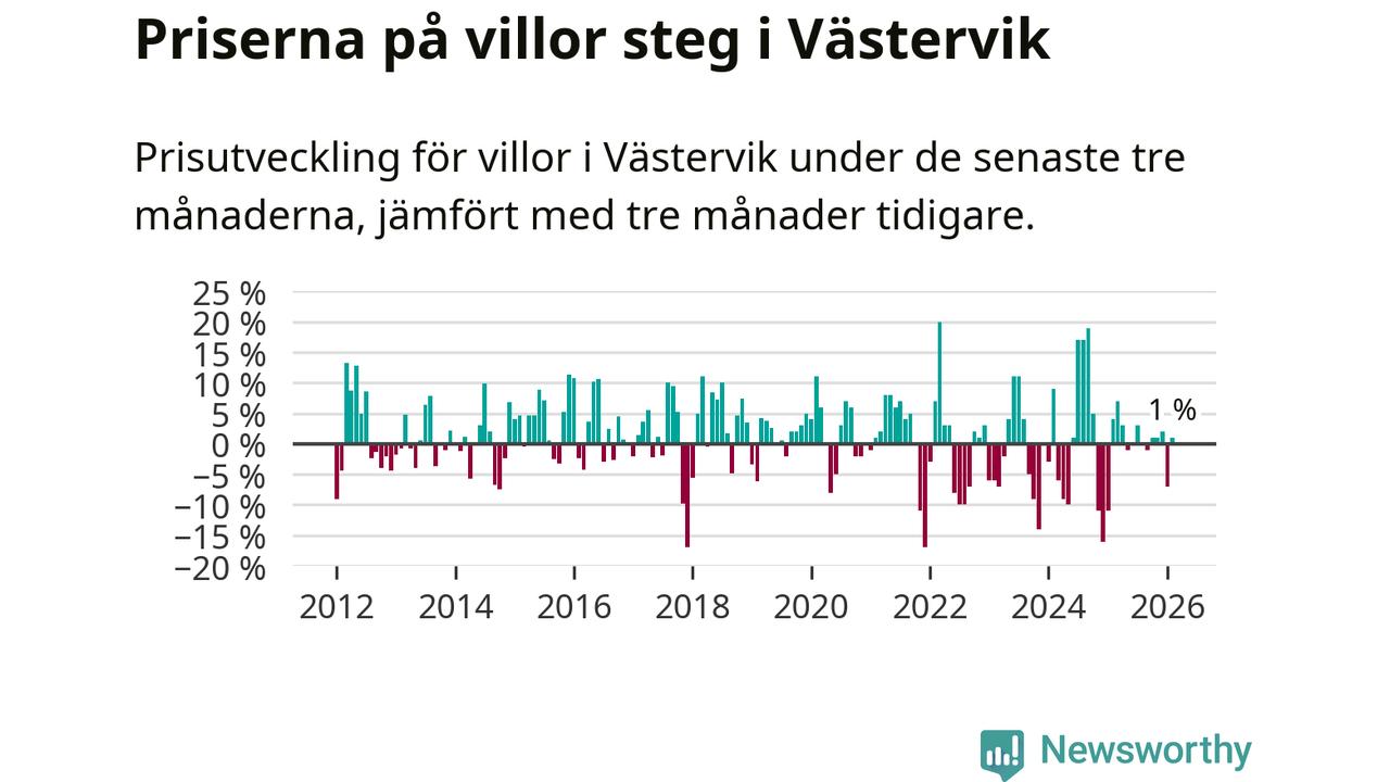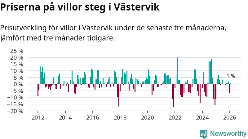 Villapriserna har gått upp i Västerviks kommun. Medelpriset på försäljningarna under de senaste tre månaderna visar på en uppgång med 1 procent.