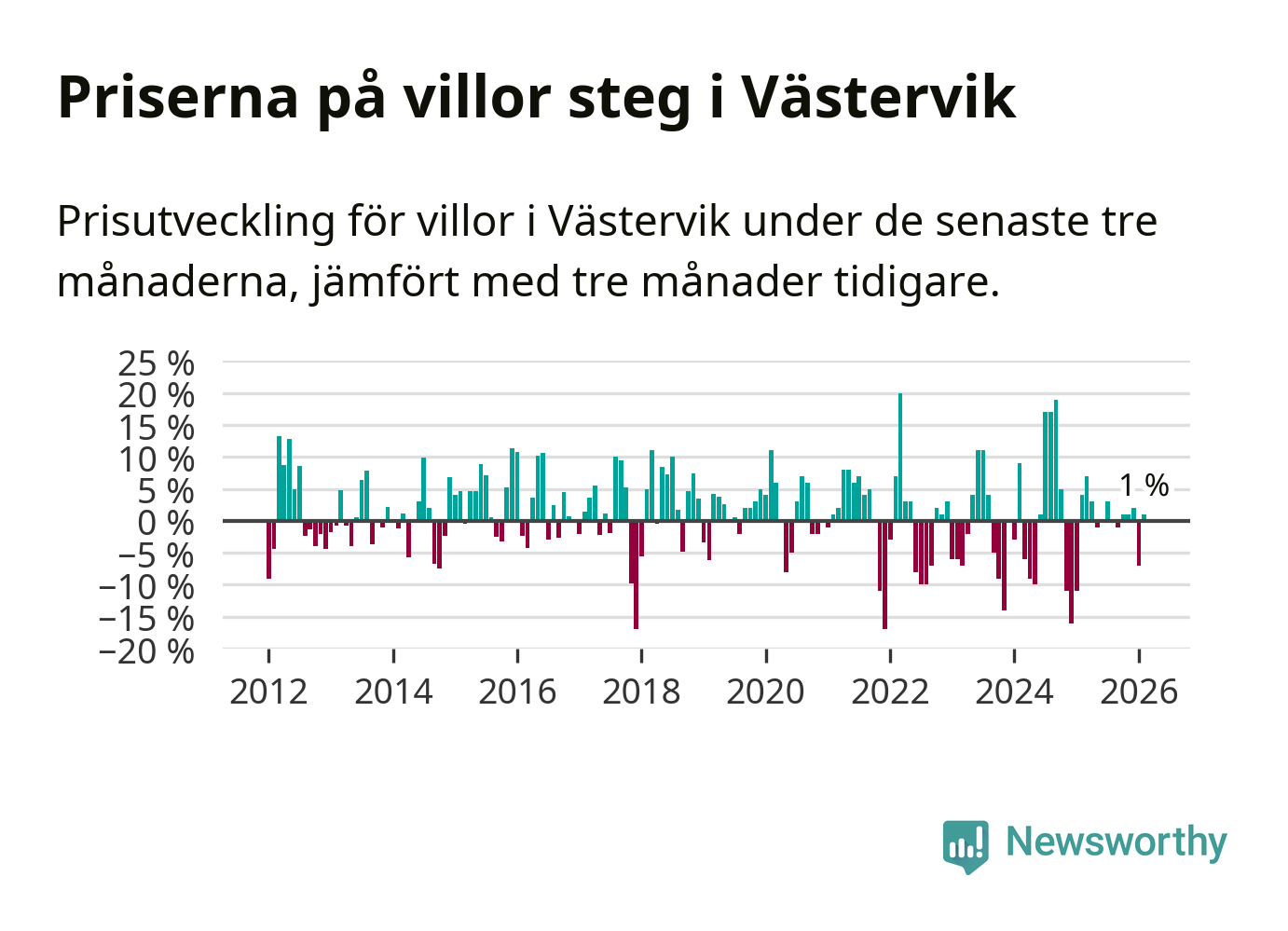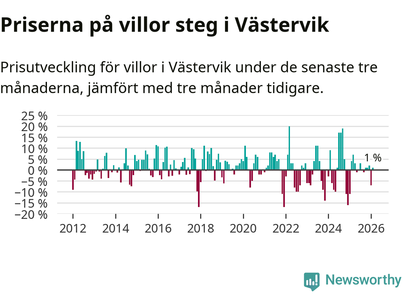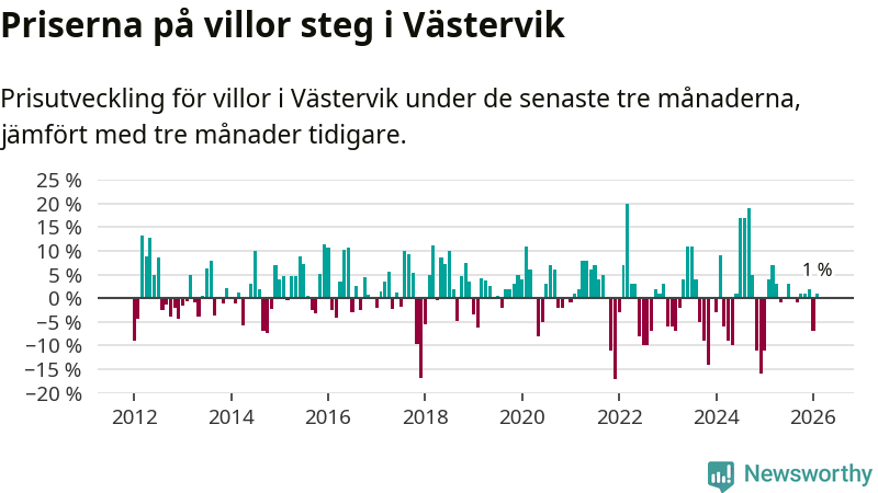 Villapriserna har gått upp i Västerviks kommun. Medelpriset på försäljningarna under de senaste tre månaderna visar på en uppgång med 1 procent.