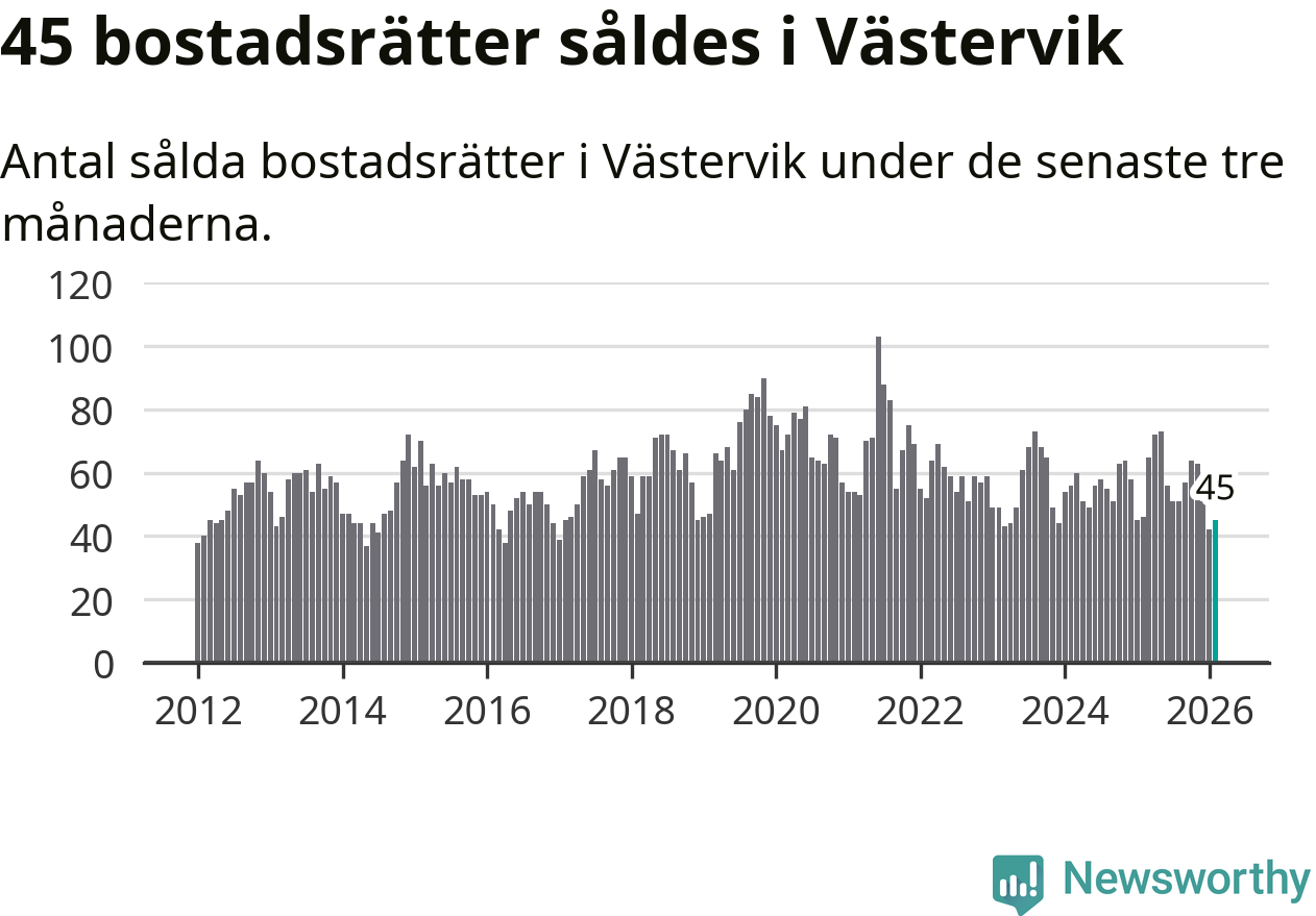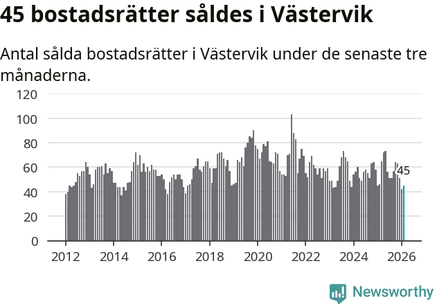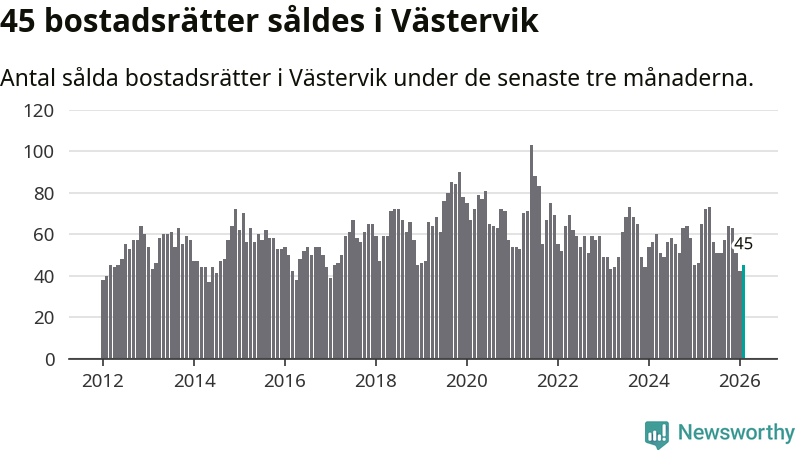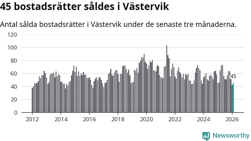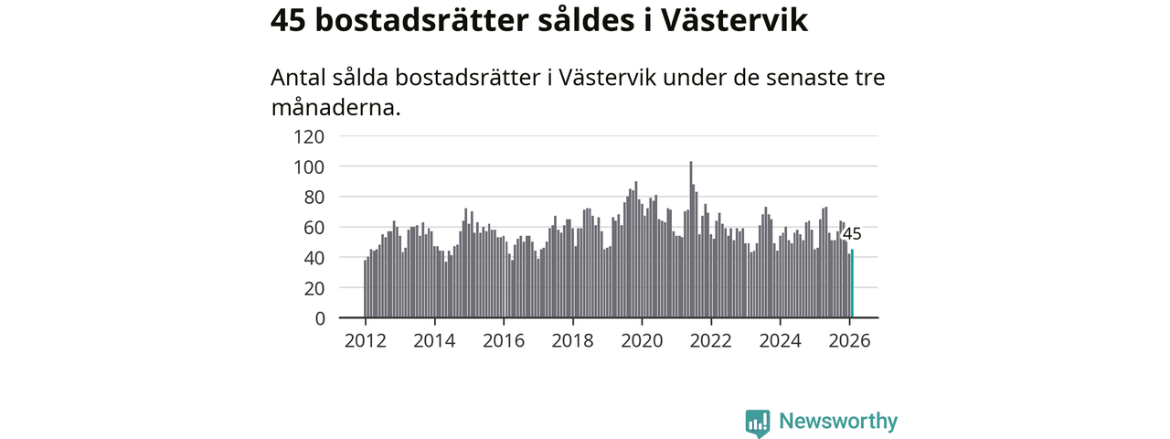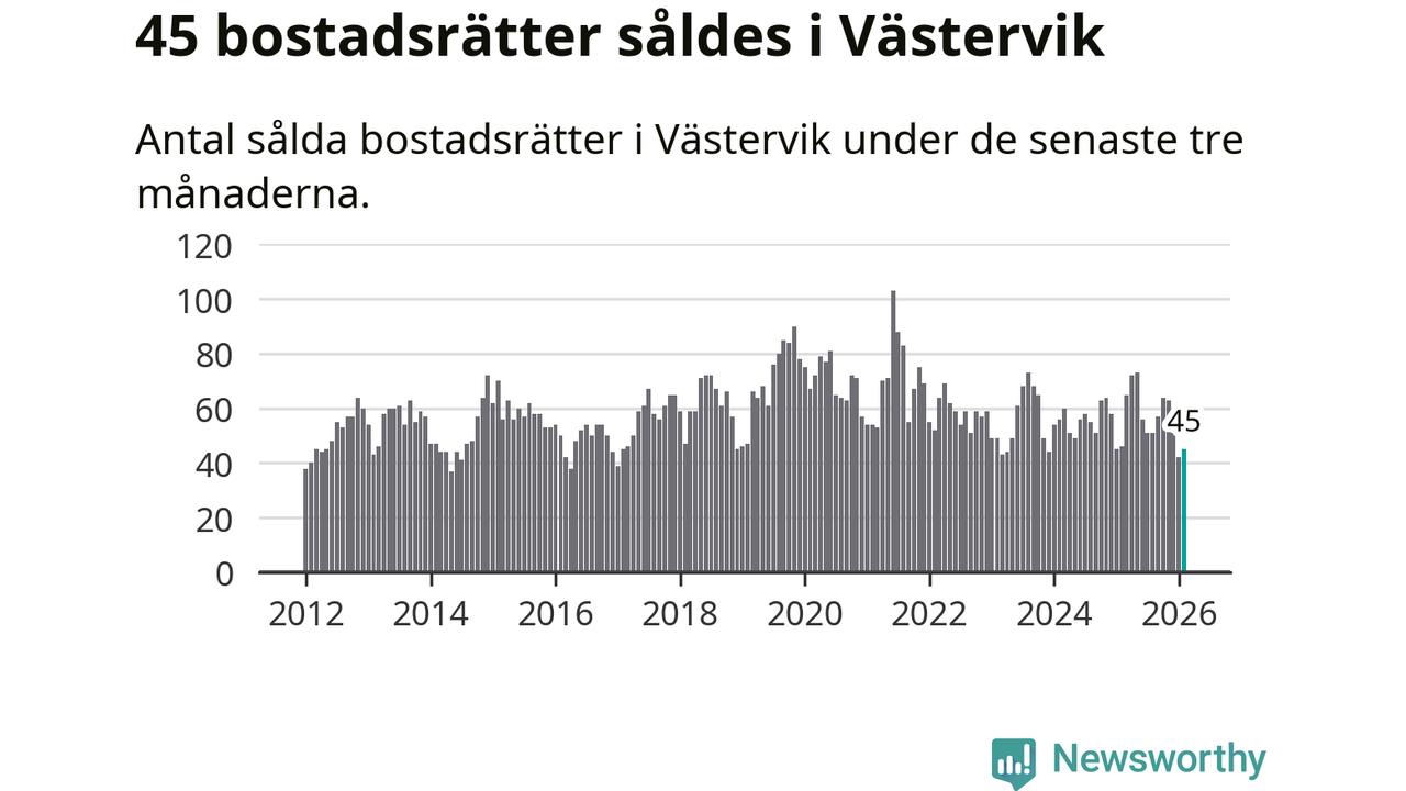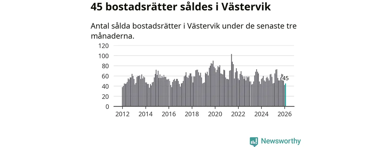 Sammanlagt såldes 45 bostadsrätter i Västerviks kommun mellan december och februari till ett genomsnittligt pris på 1,0 miljon kronor. I fjol gjordes 46 affärer vid den här tiden på året.