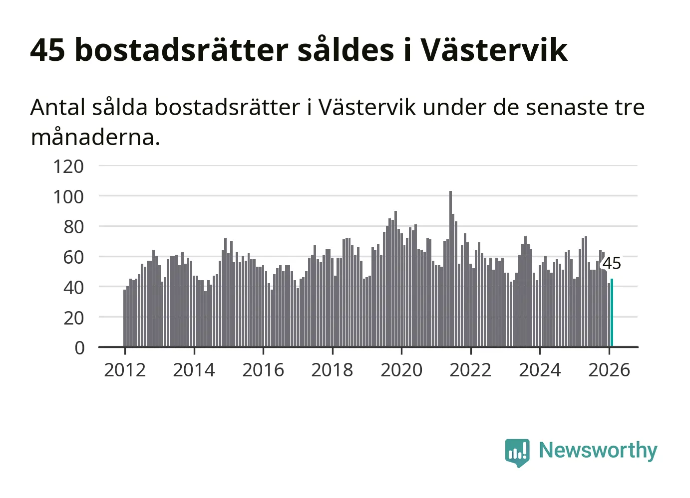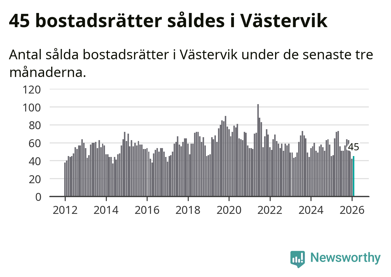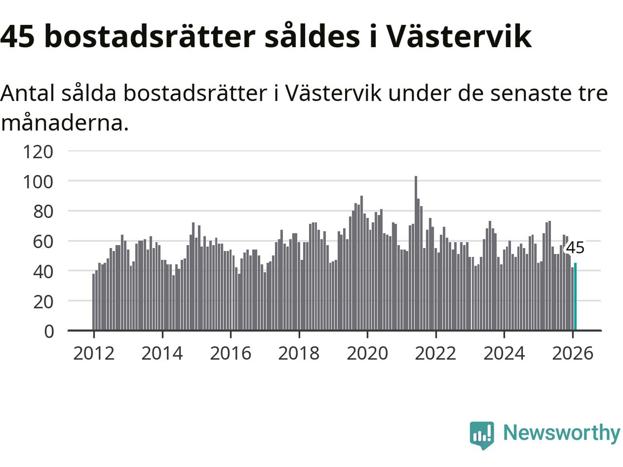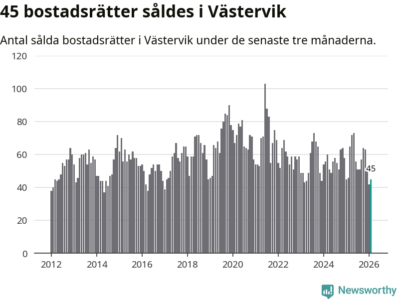 Sammanlagt såldes 45 bostadsrätter i Västerviks kommun mellan december och februari till ett genomsnittligt pris på 1,0 miljon kronor. I fjol gjordes 46 affärer vid den här tiden på året.