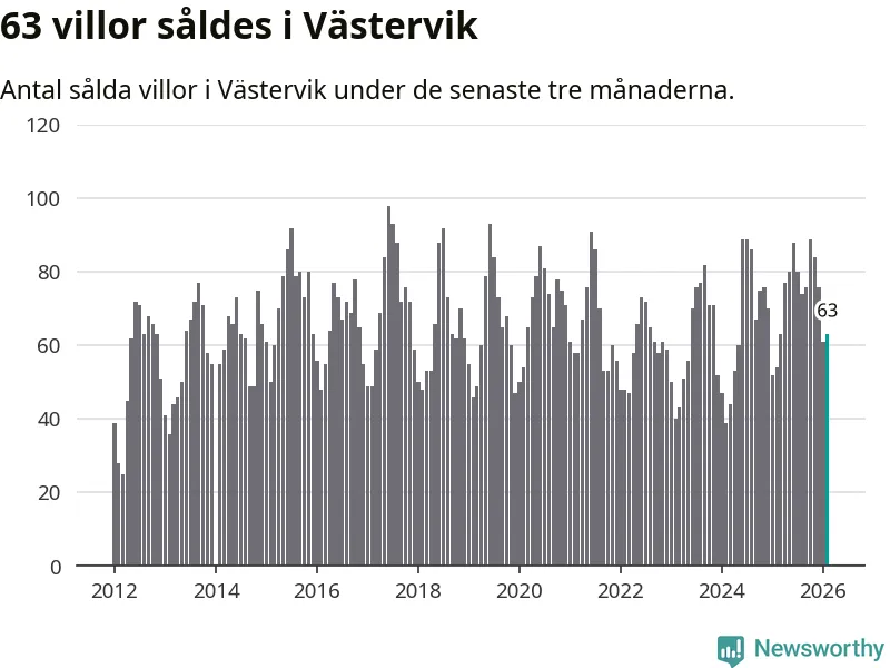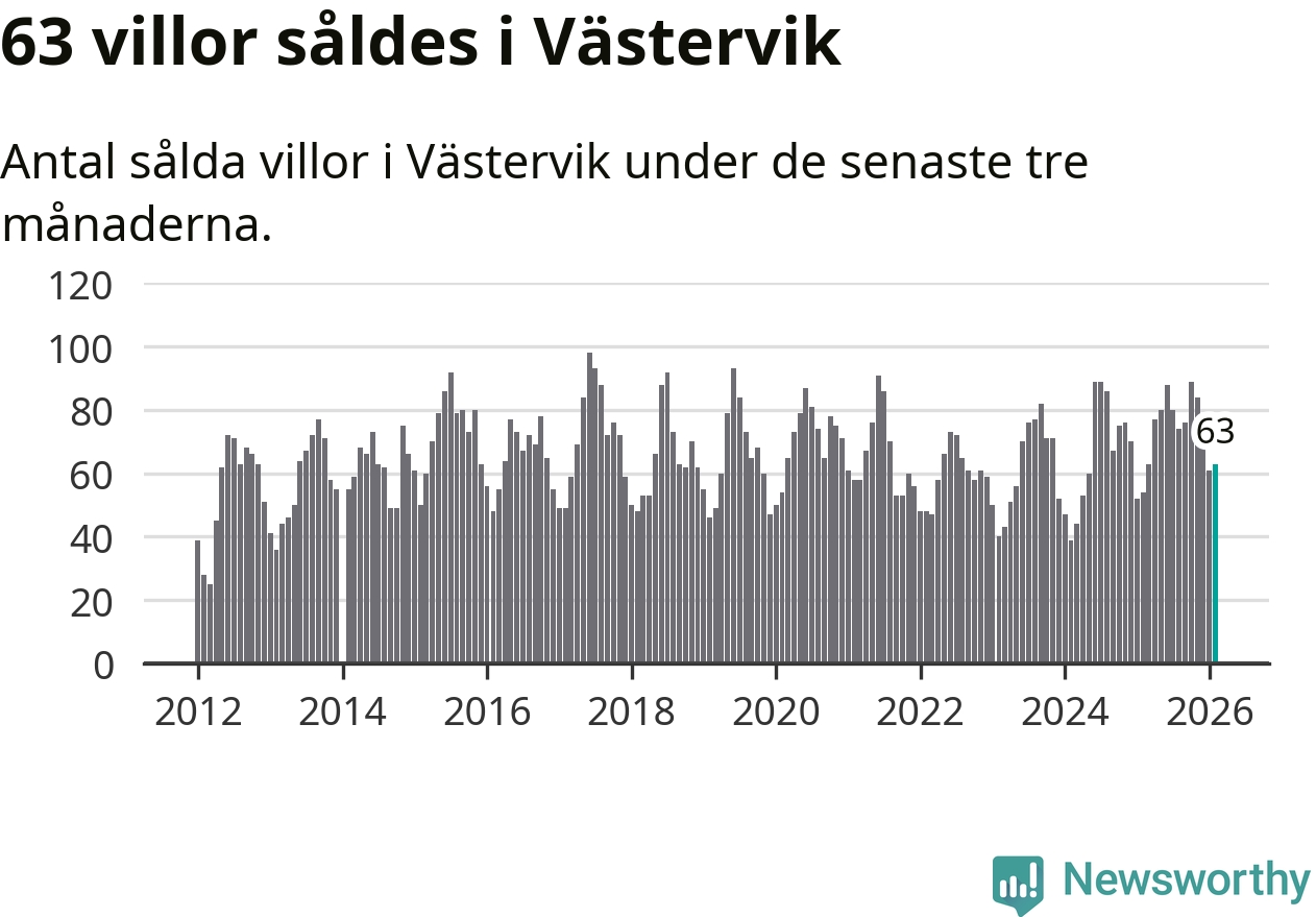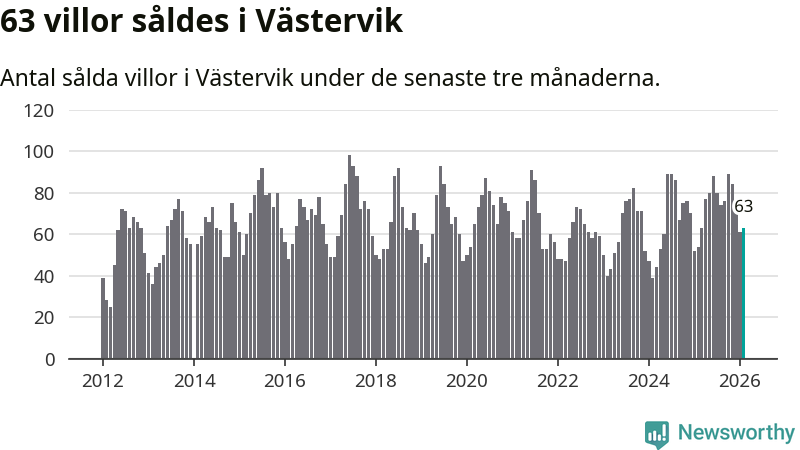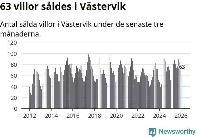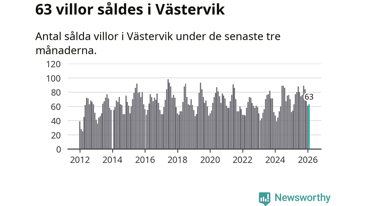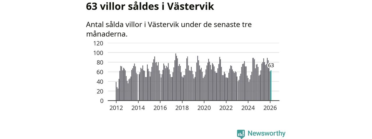 Sammanlagt såldes 63 villor i Västerviks kommun mellan december och februari till ett genomsnittligt pris på 2,1 miljoner kronor. I fjol gjordes 54 affärer vid den här tiden på året.