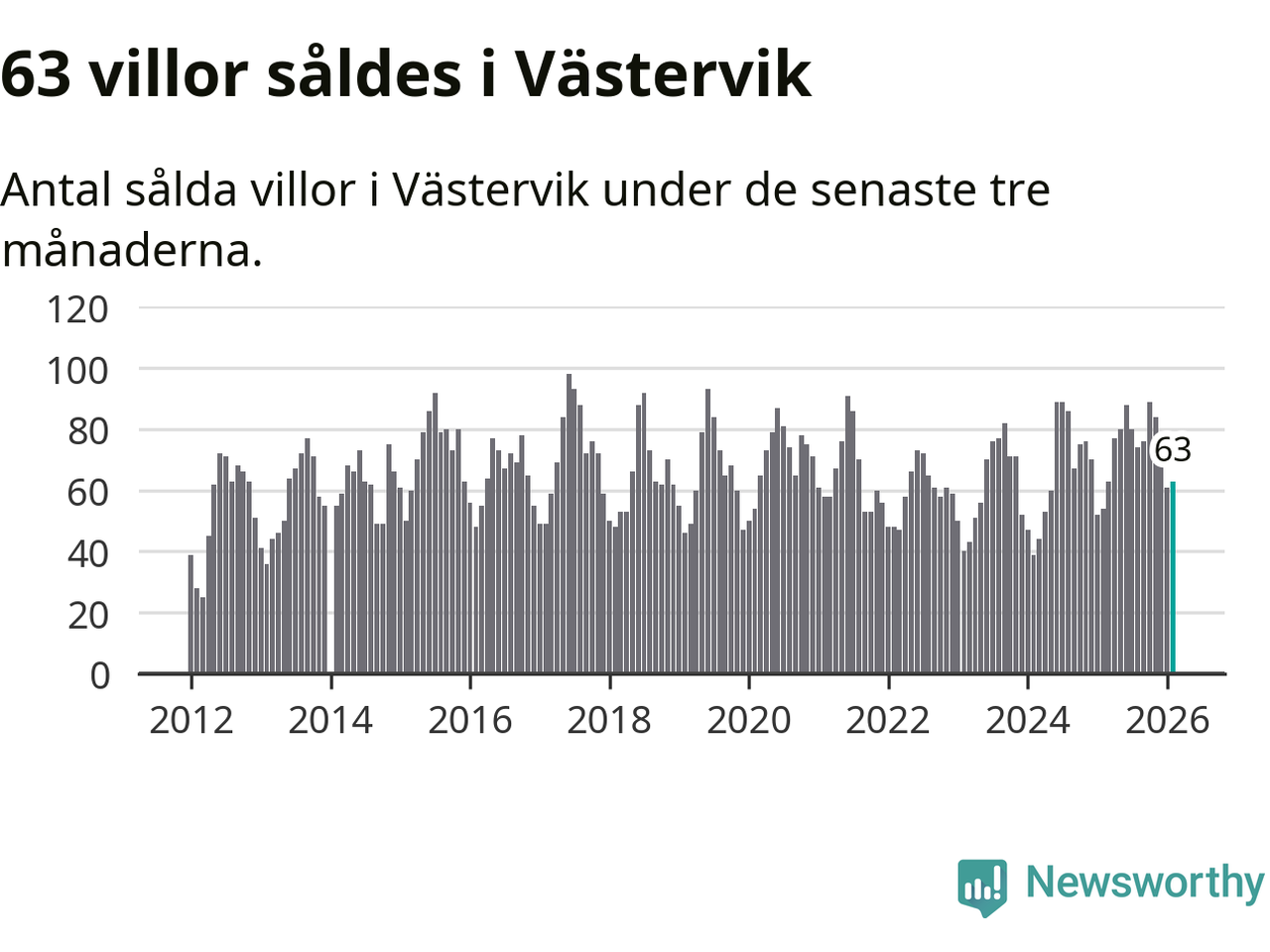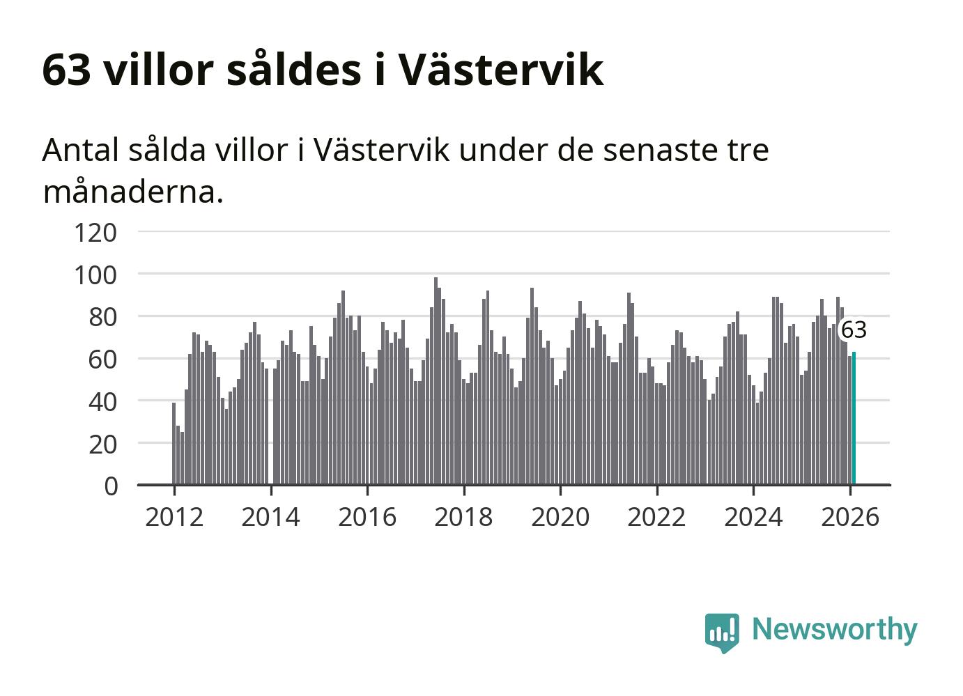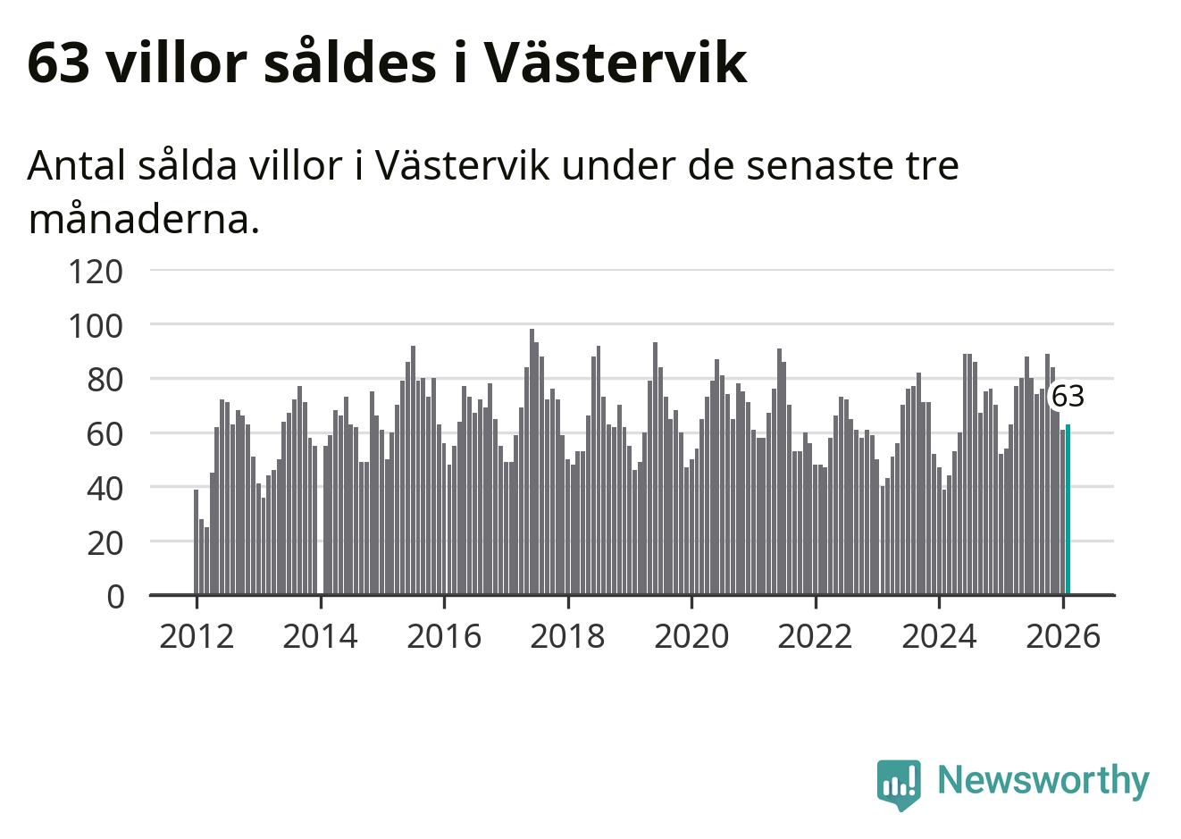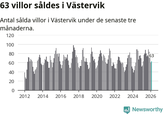 Sammanlagt såldes 63 villor i Västerviks kommun mellan december och februari till ett genomsnittligt pris på 2,1 miljoner kronor. I fjol gjordes 54 affärer vid den här tiden på året.