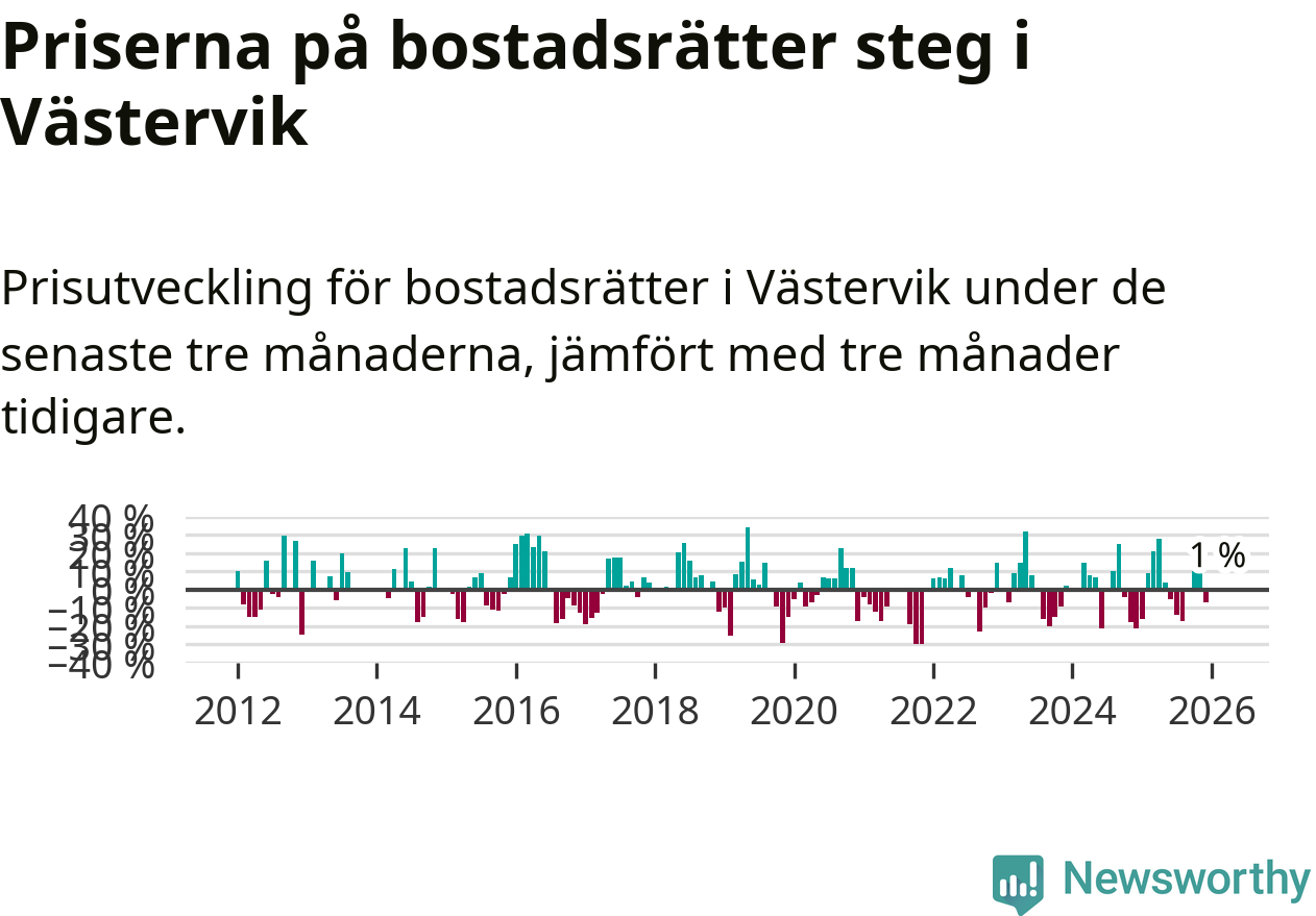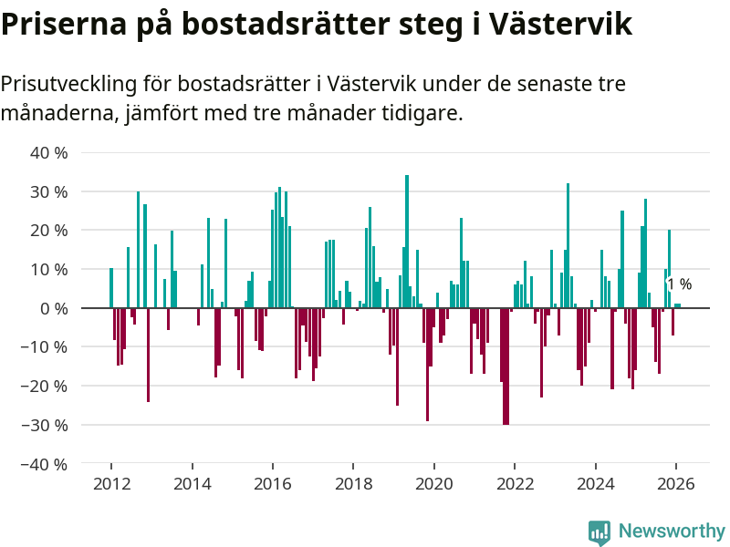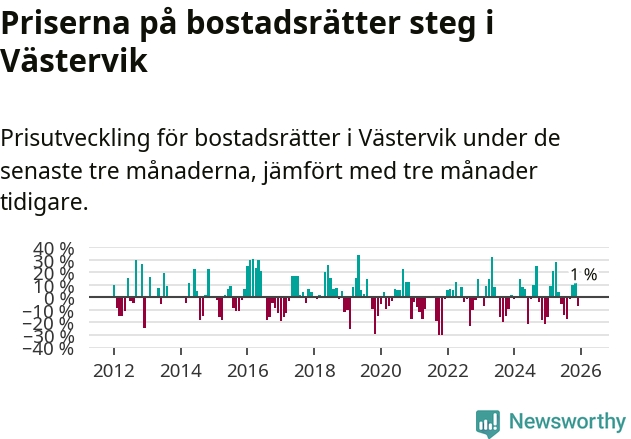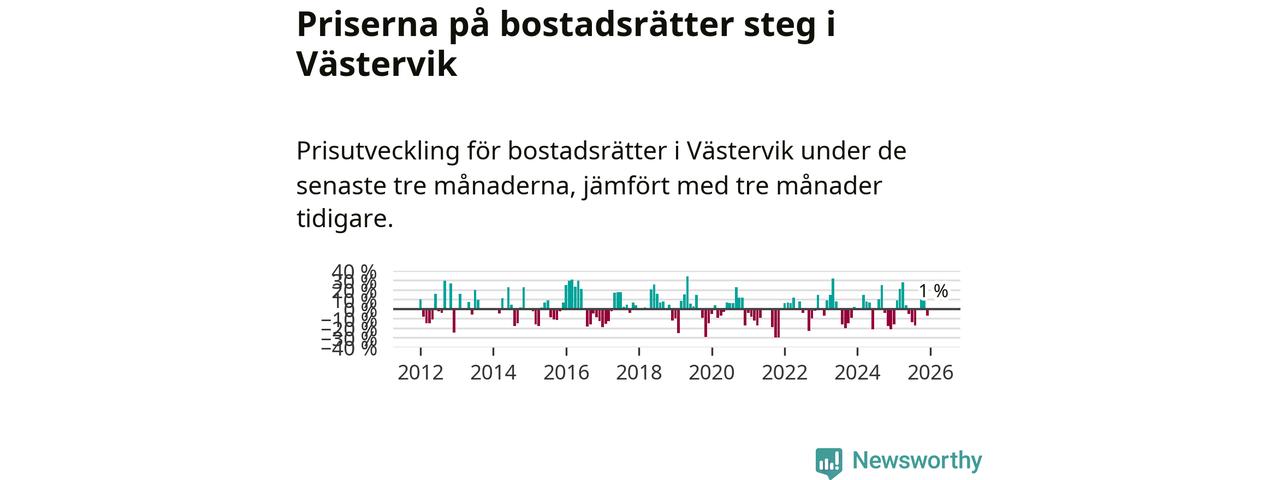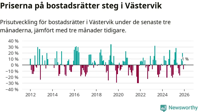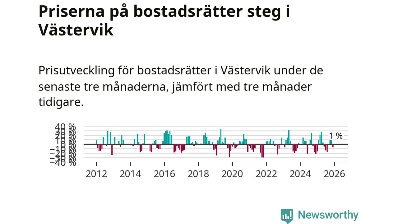 Priserna på bostadsrätter har gått upp i Västerviks kommun. Medelpriset på försäljningarna under de senaste tre månaderna visar på en uppgång med 1 procent.