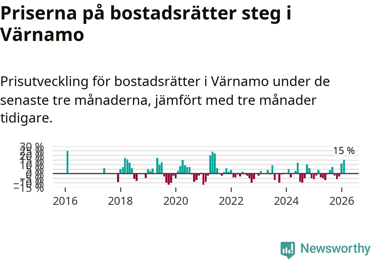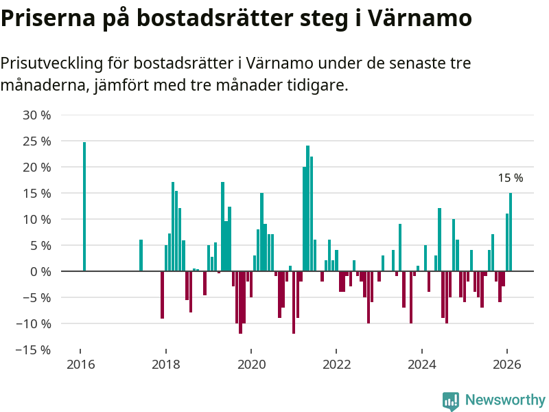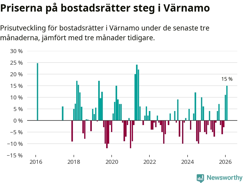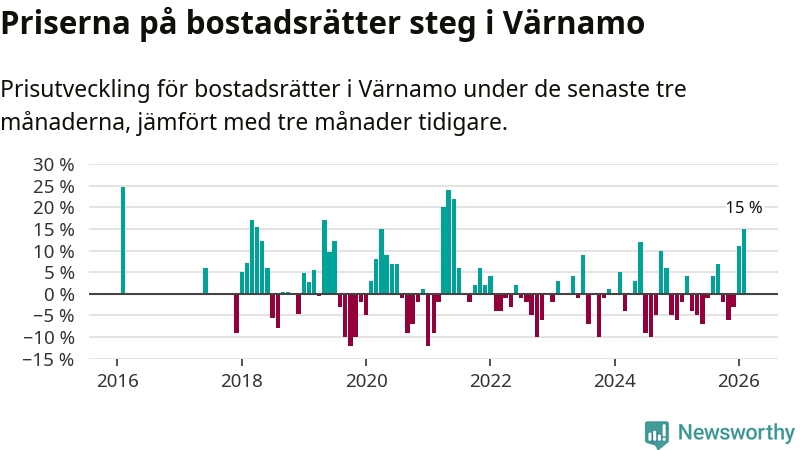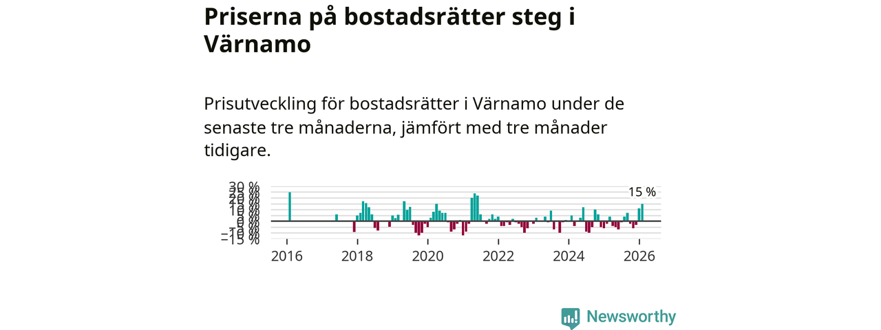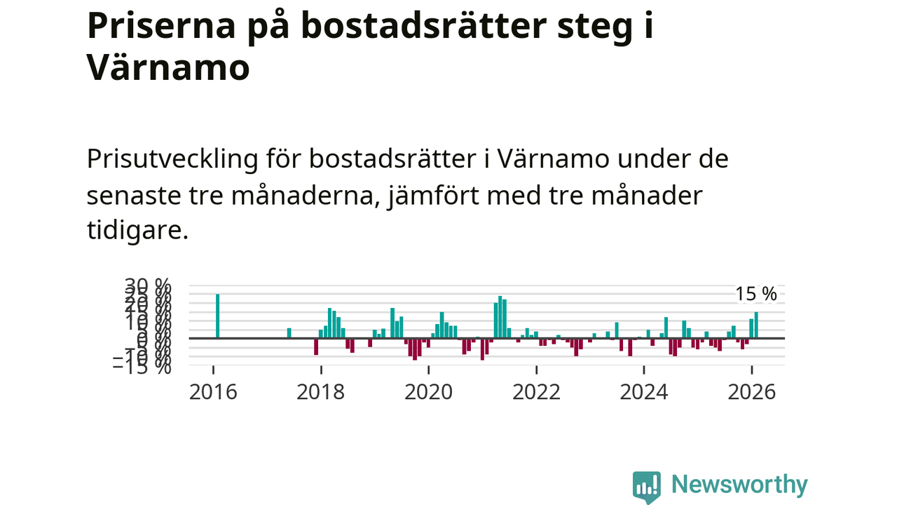 Priserna på bostadsrätter steg med 15 procent i Värnamo kommun under de senaste tre månaderna. Det är den starkaste prisutvecklingen sedan 2021.