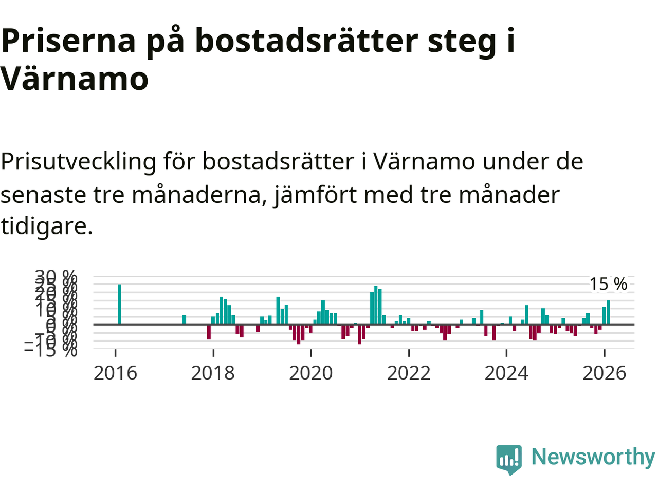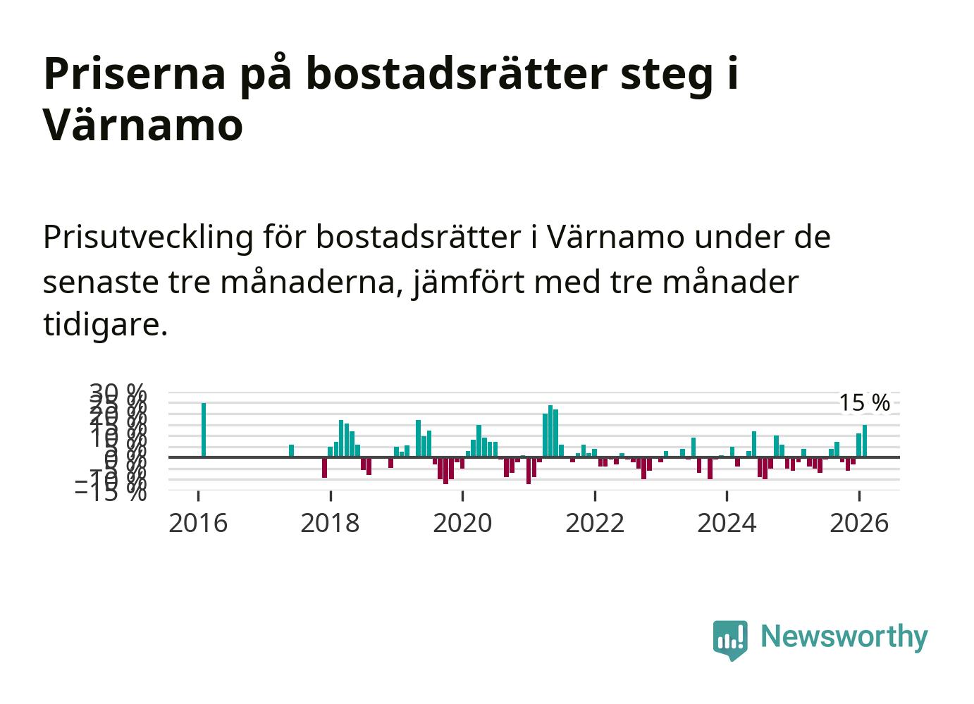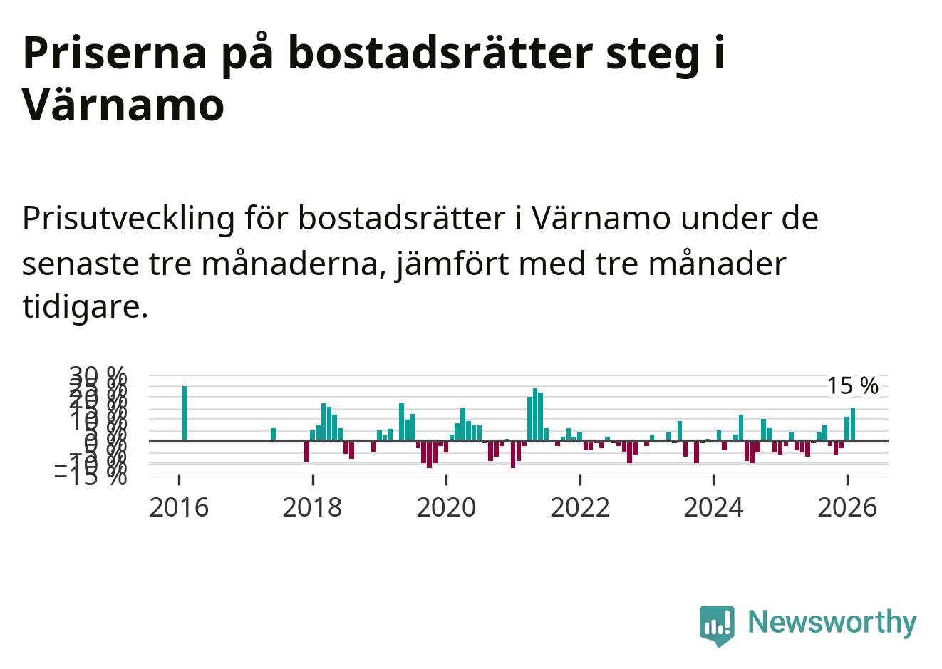 Priserna på bostadsrätter steg med 15 procent i Värnamo kommun under de senaste tre månaderna. Det är den starkaste prisutvecklingen sedan 2021.