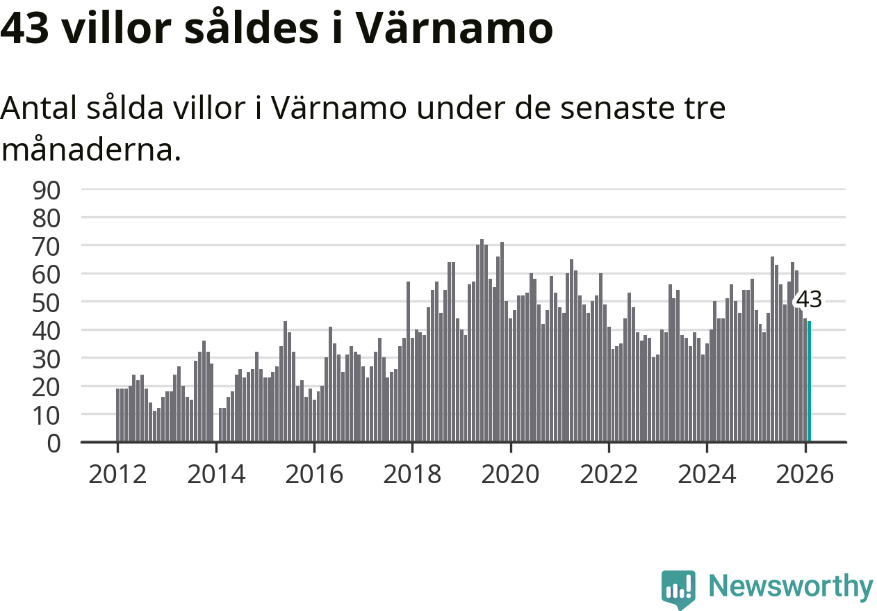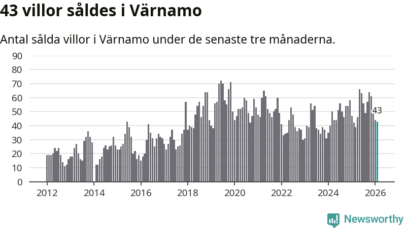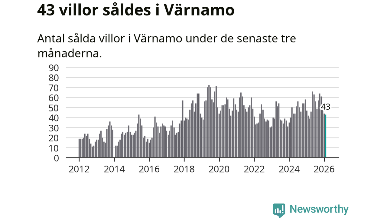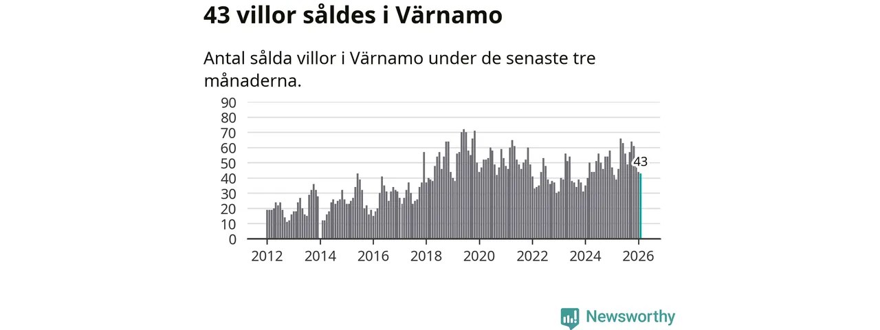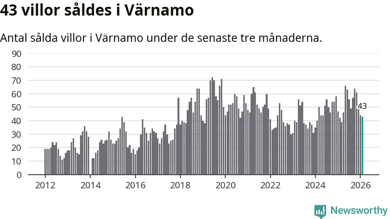 Sammanlagt såldes 43 villor i Värnamo kommun mellan december och februari till ett genomsnittligt pris på 2,5 miljoner kronor. I fjol gjordes 42 affärer vid den här tiden på året.