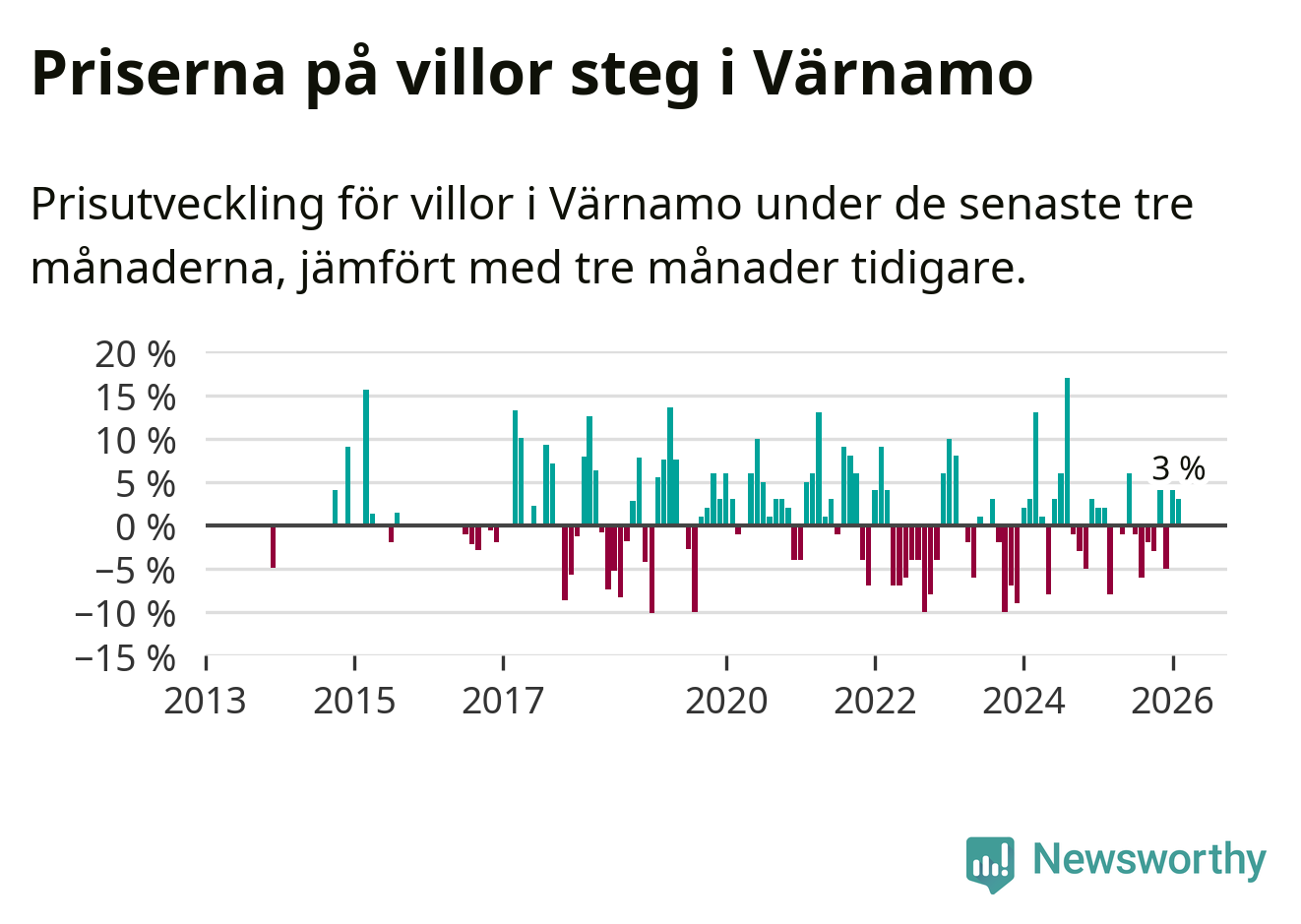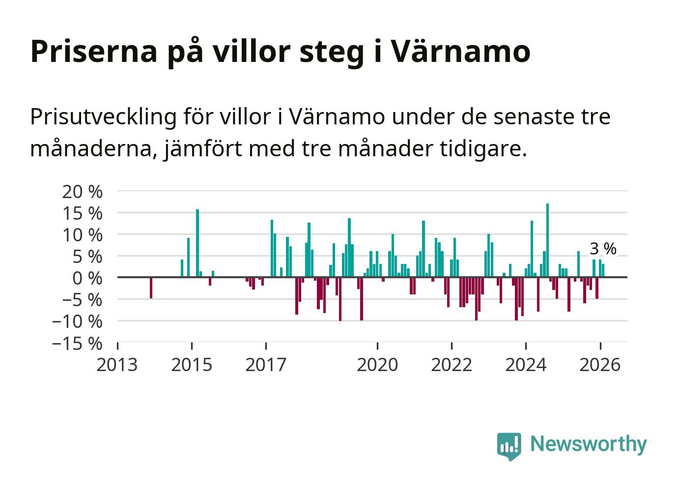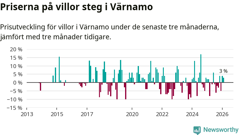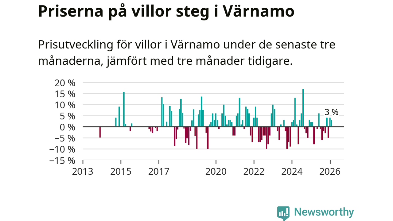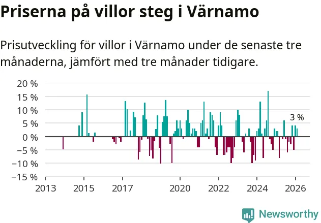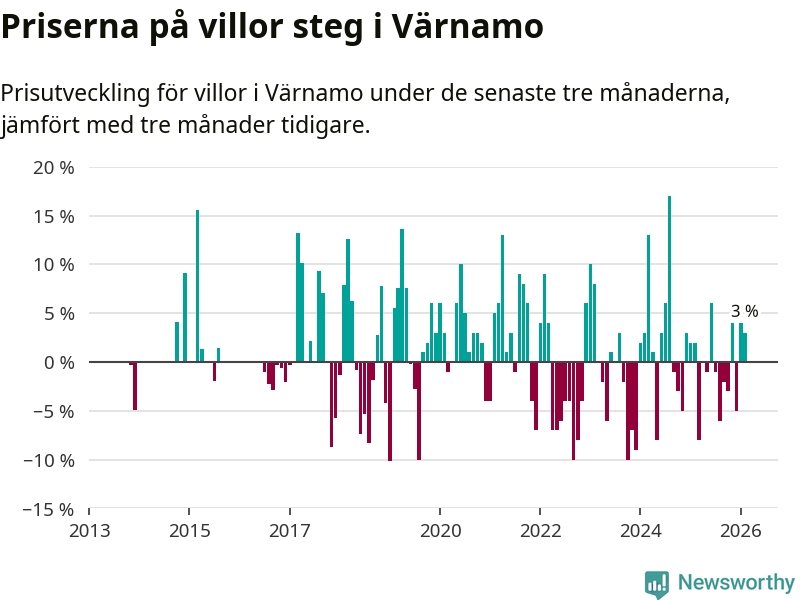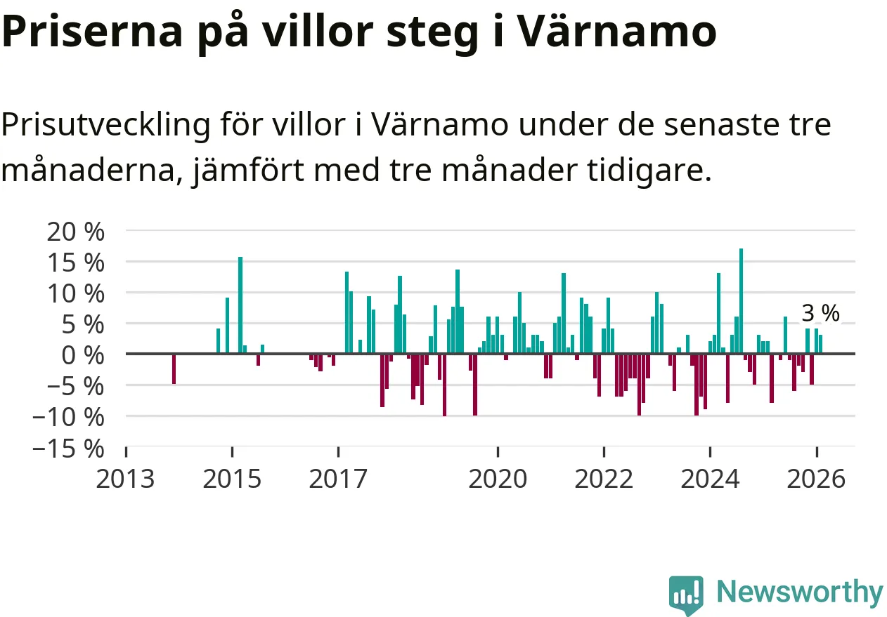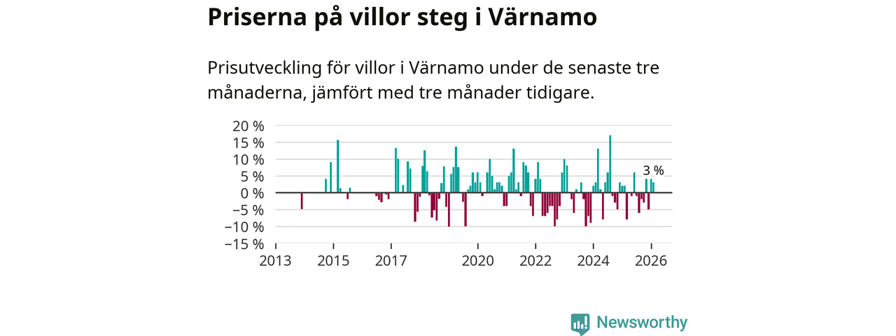 Villapriserna har gått upp i Värnamo kommun. Medelpriset på försäljningarna under de senaste tre månaderna visar på en uppgång med 3 procent.