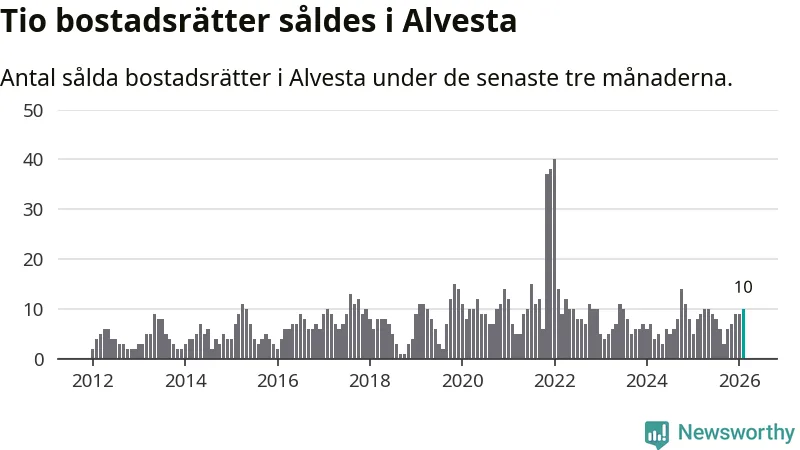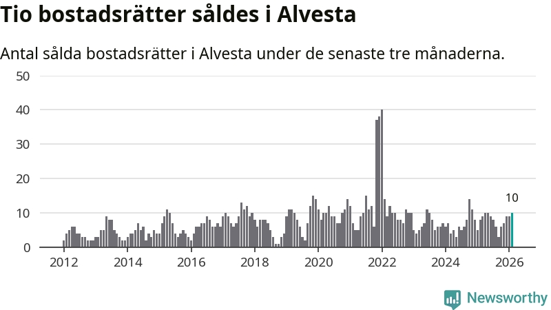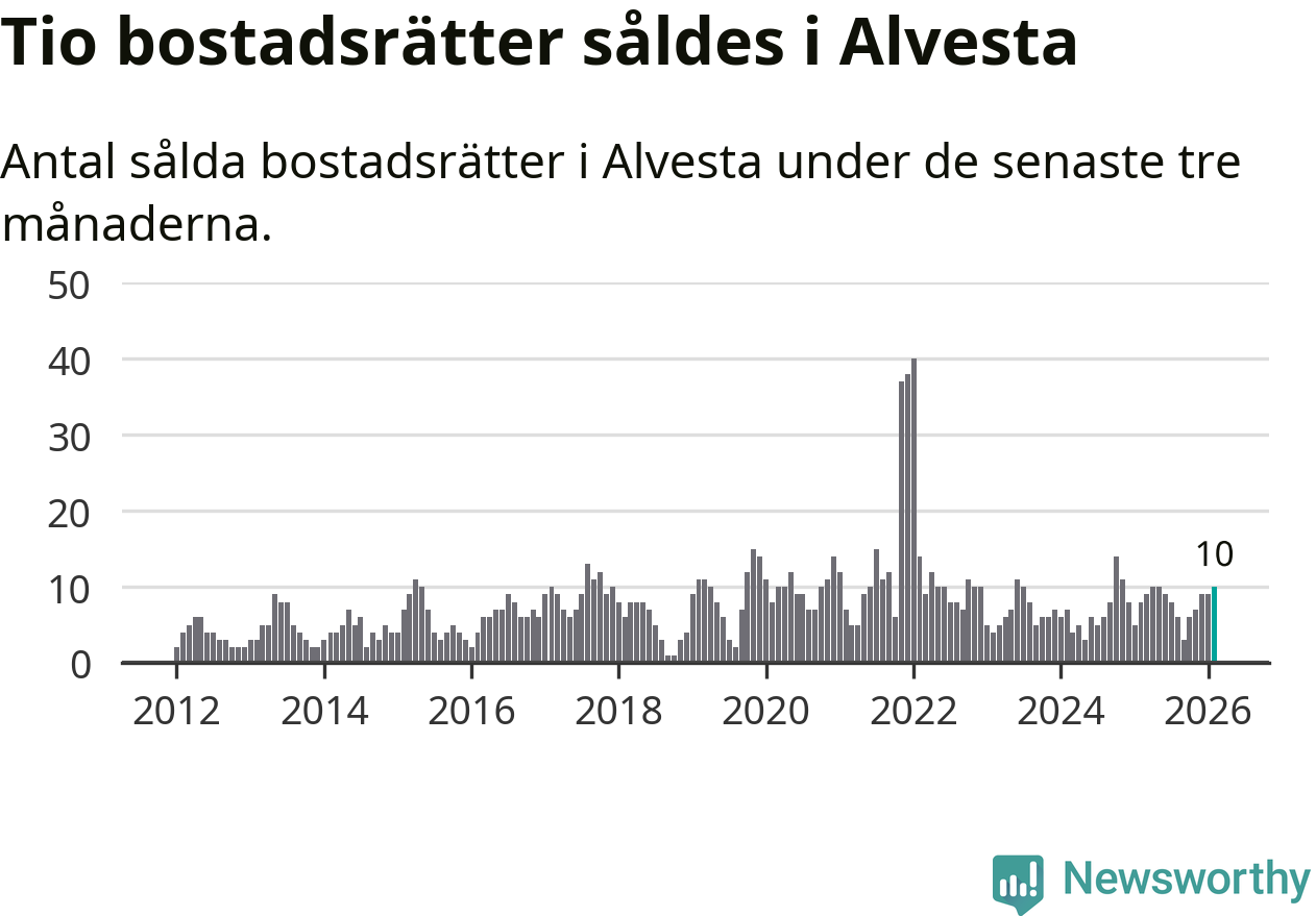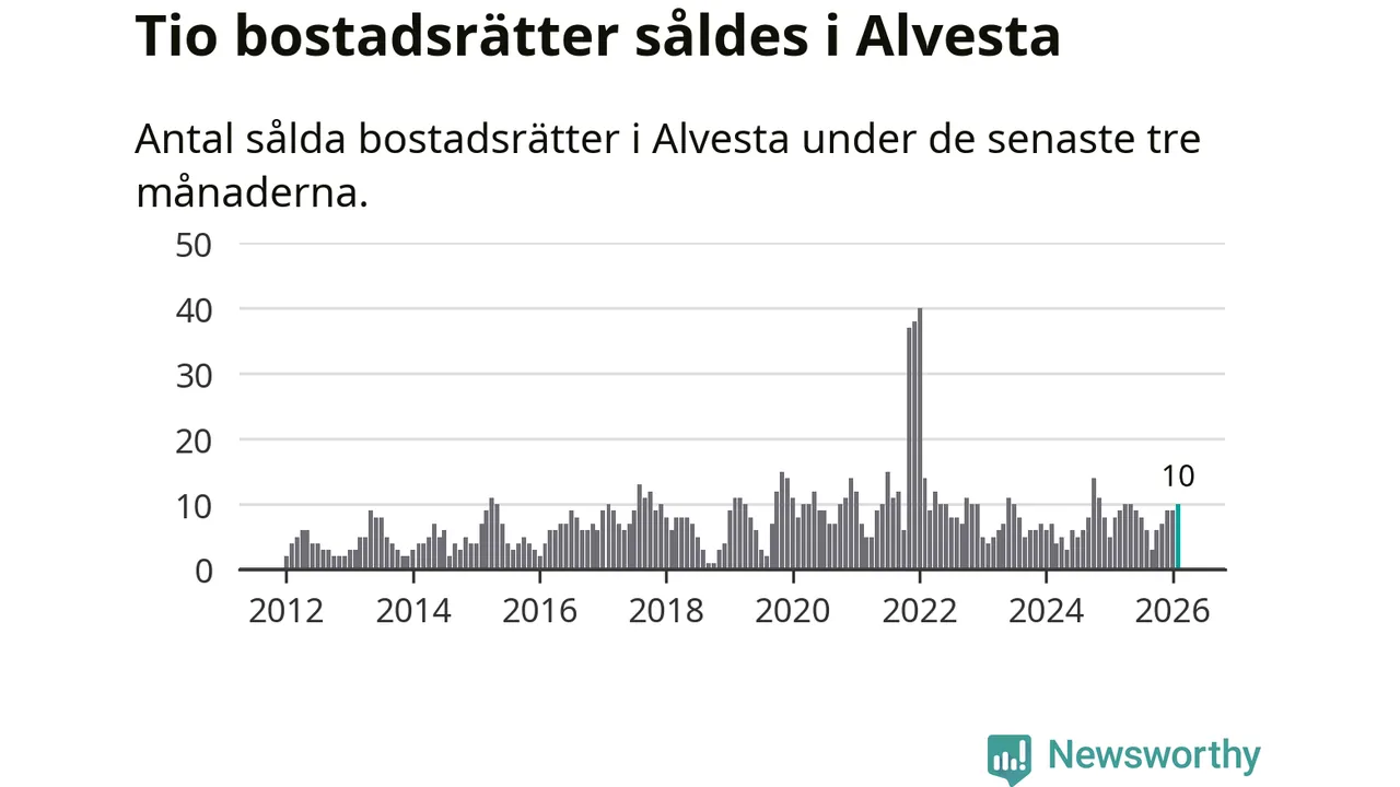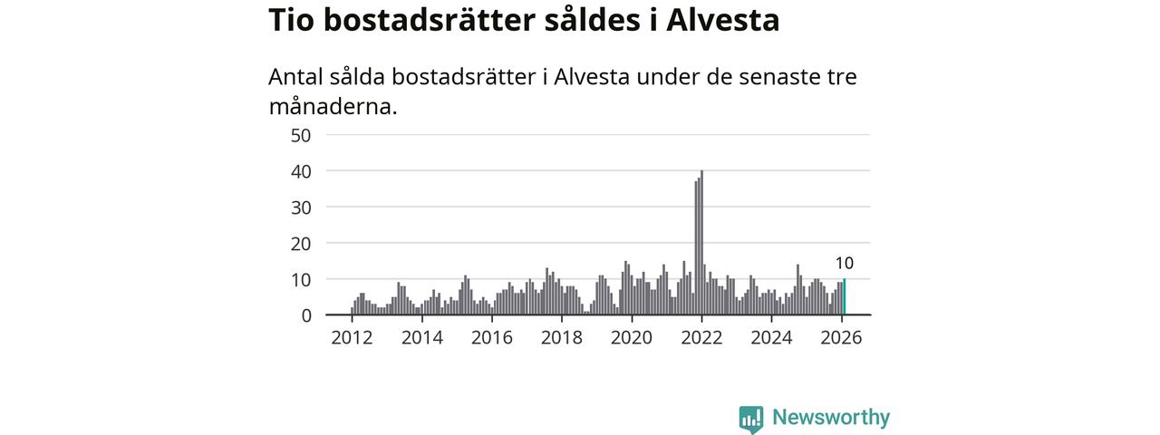 Mellan december och februari gjordes sammanlagt tio affärer med bostadsrätter i Alvesta kommun. Det kan jämföras med åtta vid motsvarande tid i fjol.
