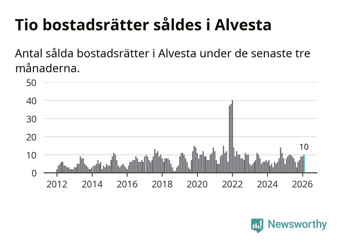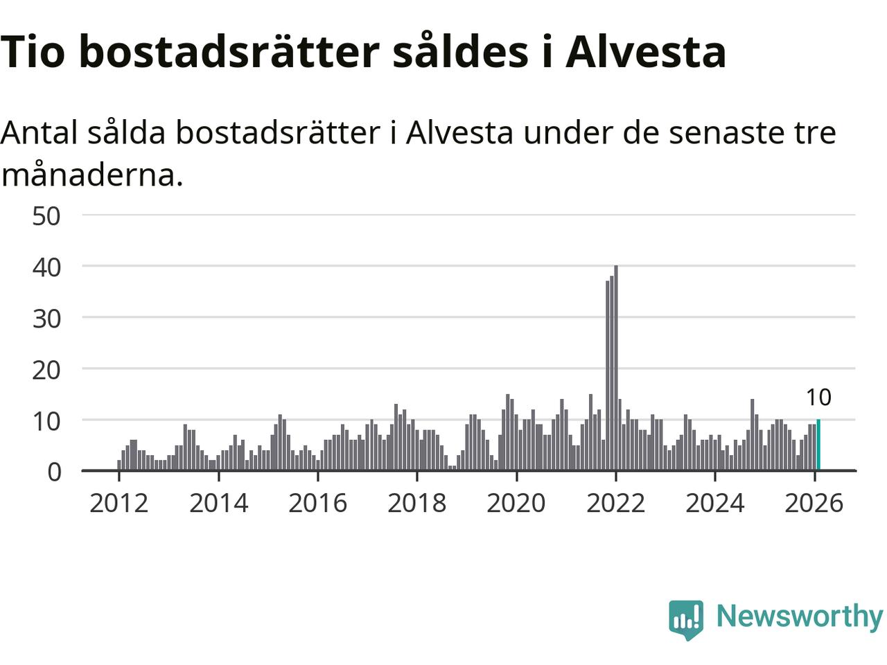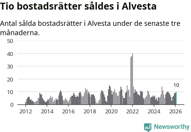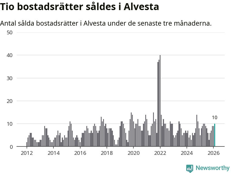Mellan december och februari gjordes sammanlagt tio affärer med bostadsrätter i Alvesta kommun. Det kan jämföras med åtta vid motsvarande tid i fjol.