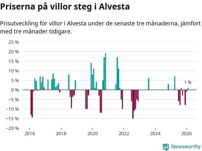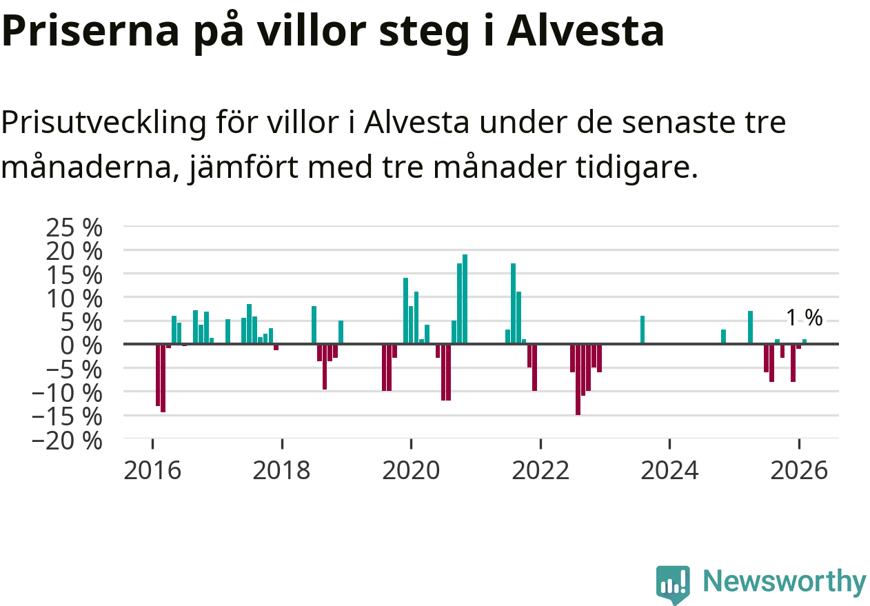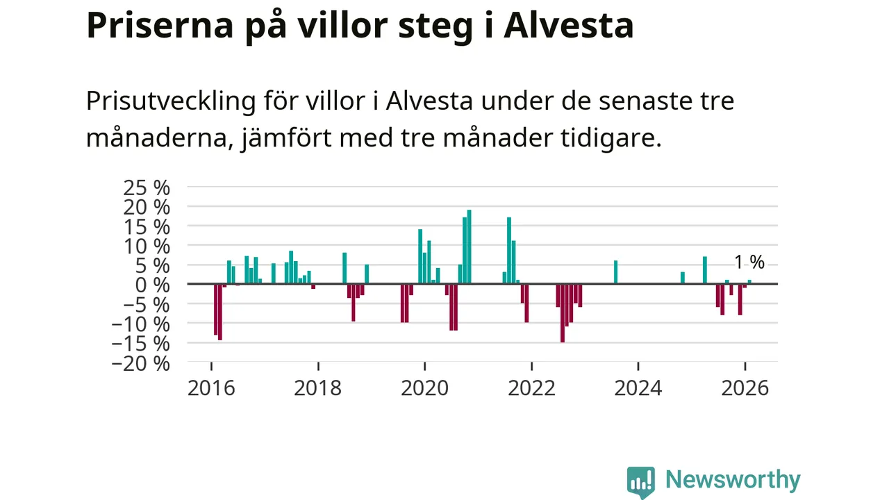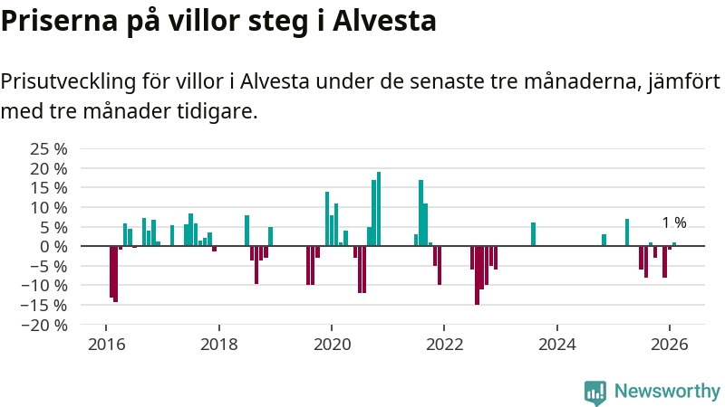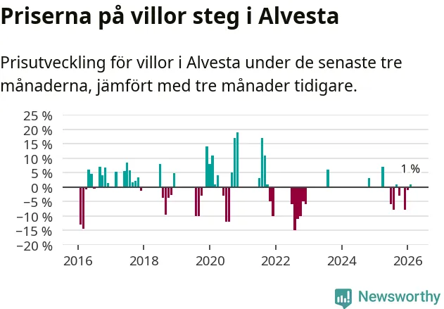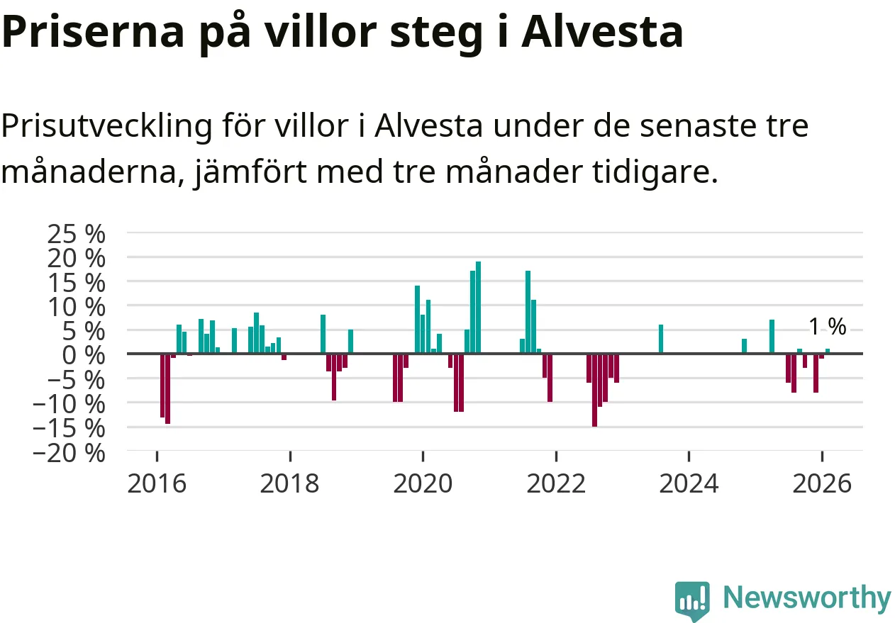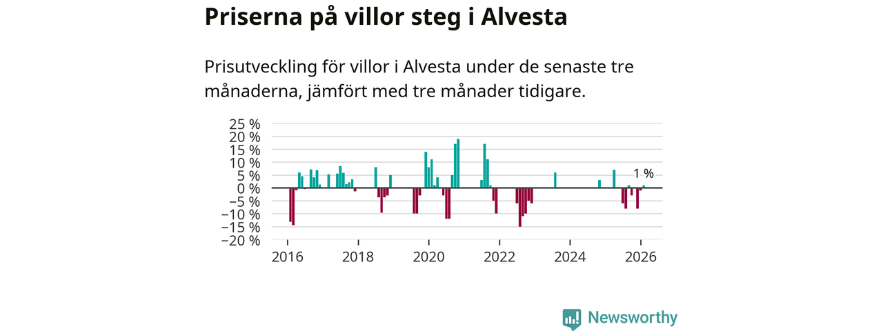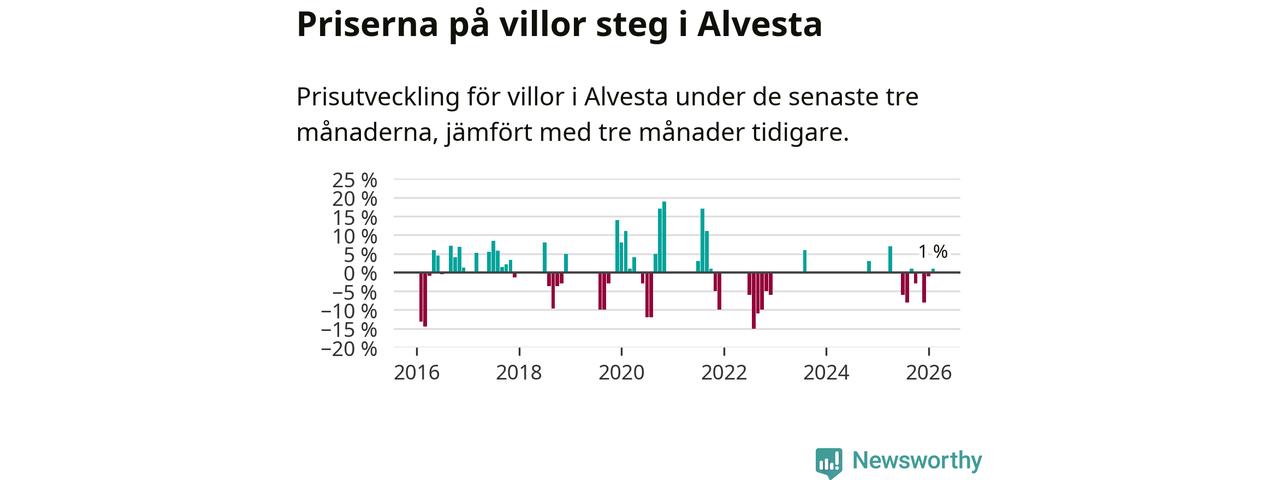 Statistiken visar även på en prisuppgång i Alvesta kommun. Medelpriset på försäljningarna av villor i kommunen var 1 procent högre än för tre månader sedan. I hela Kronoberg däremot sjunker villapriserna. I hela länet noterades en prisnedgång på 5 procent.