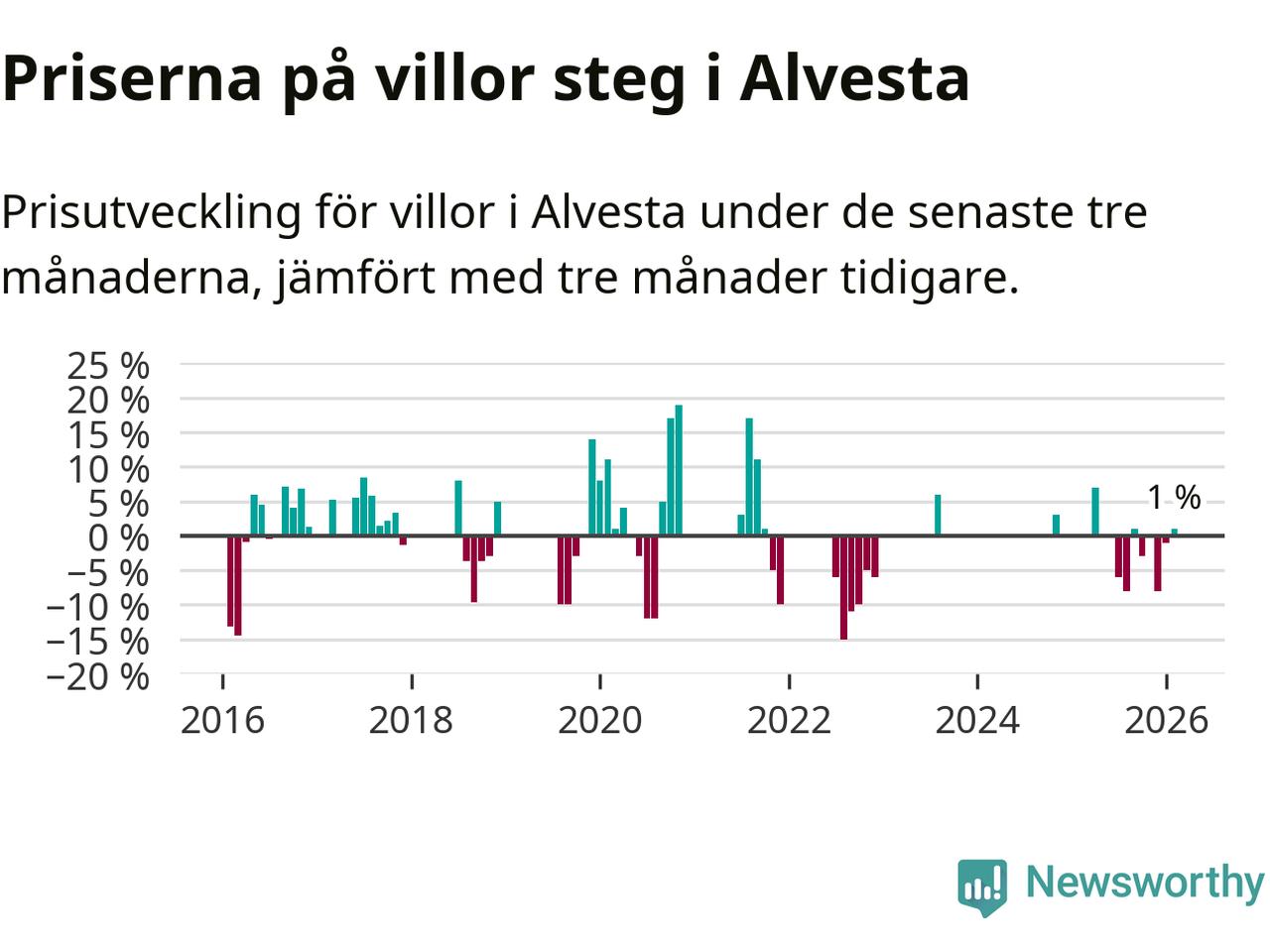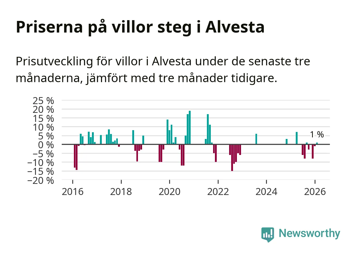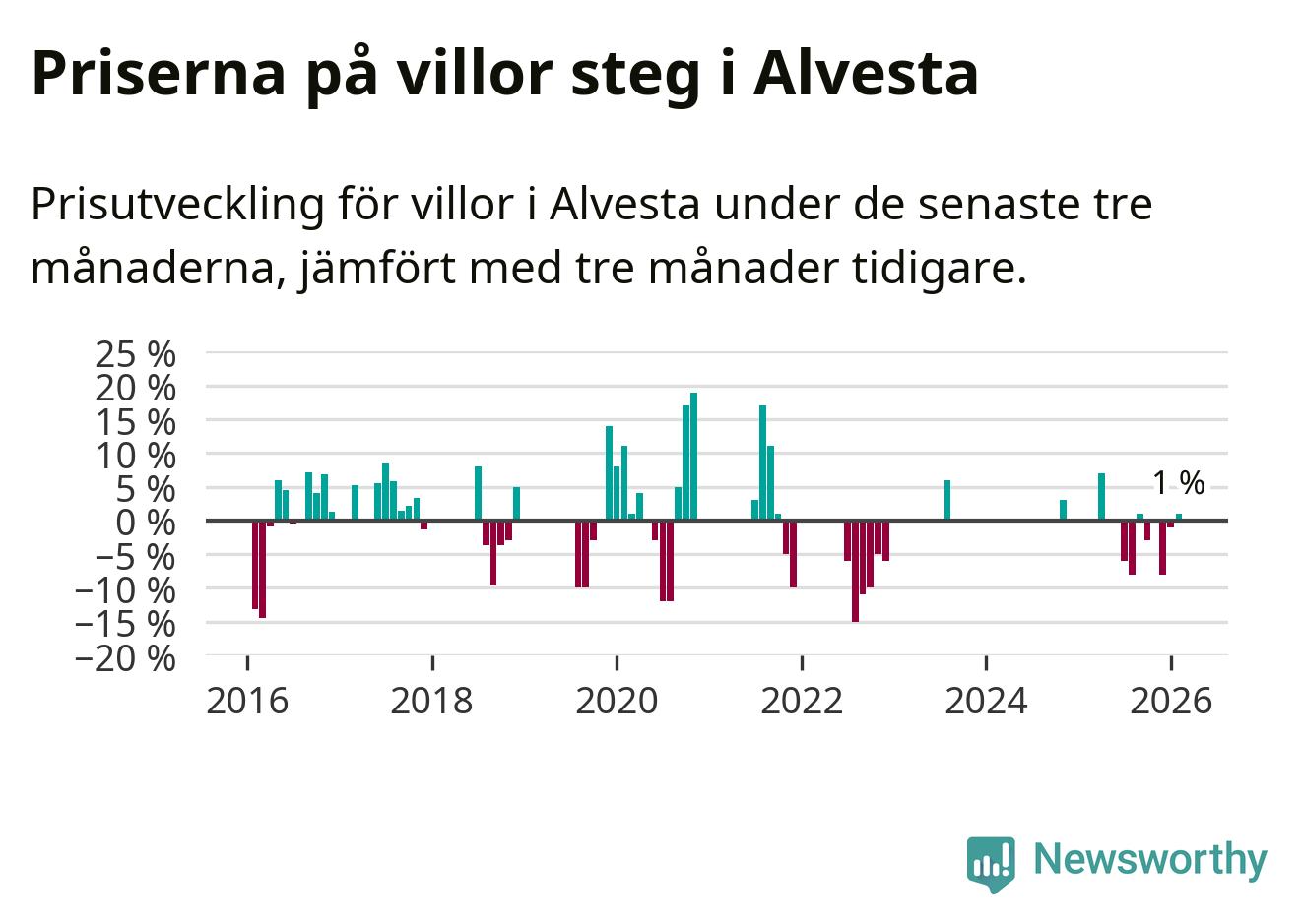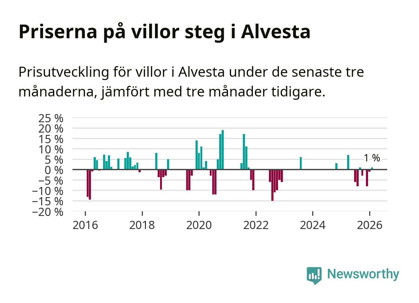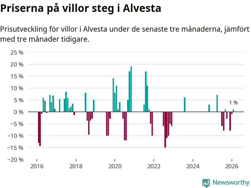Statistiken visar även på en prisuppgång i Alvesta kommun. Medelpriset på försäljningarna av villor i kommunen var 1 procent högre än för tre månader sedan. I hela Kronoberg däremot sjunker villapriserna. I hela länet noterades en prisnedgång på 5 procent.