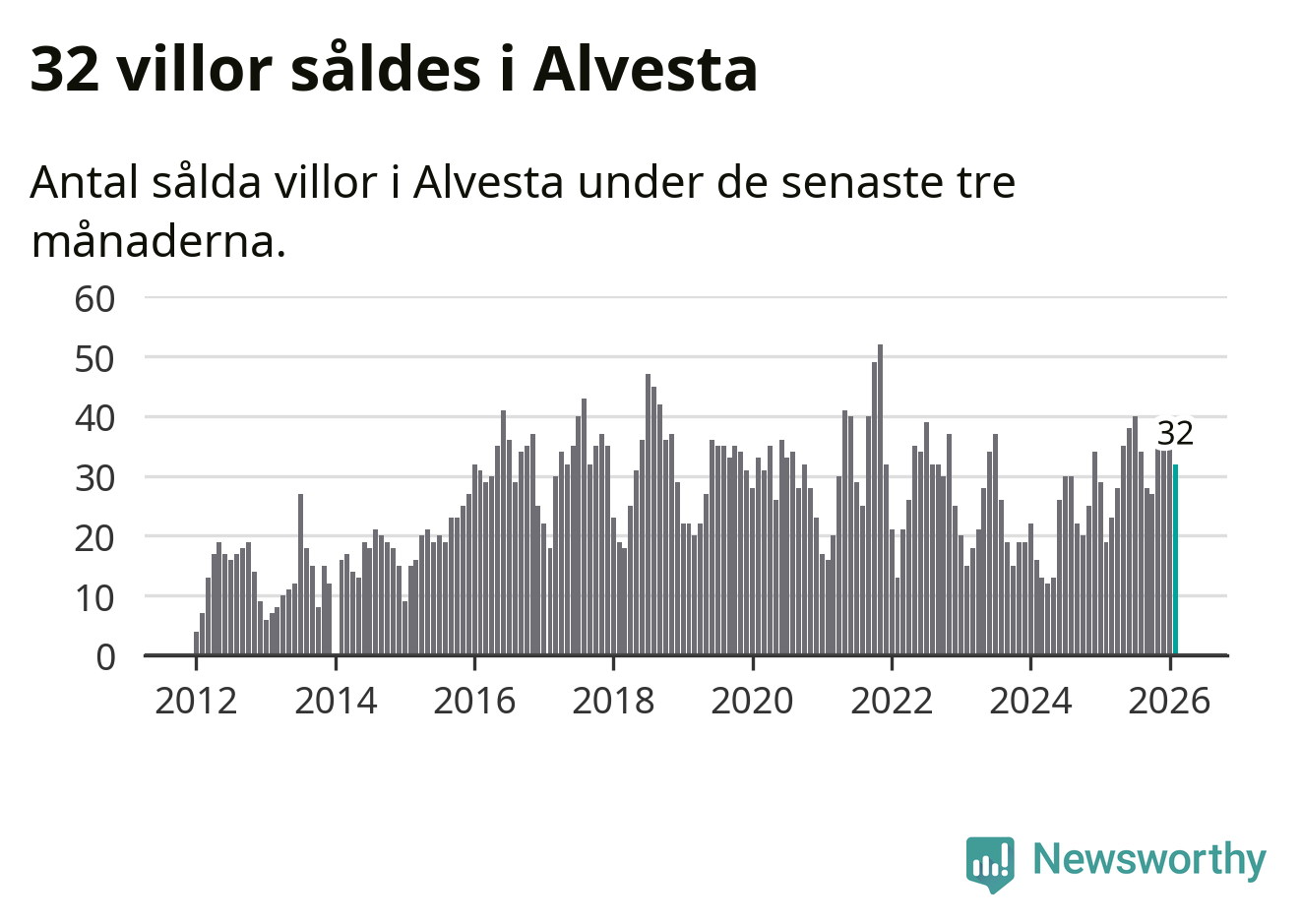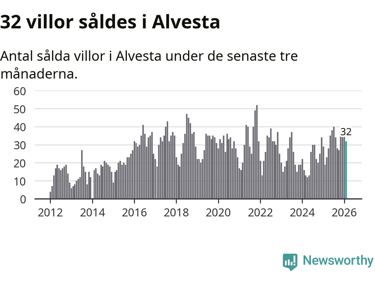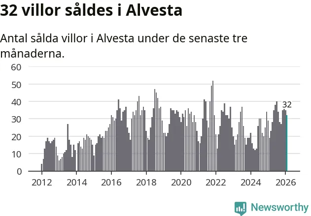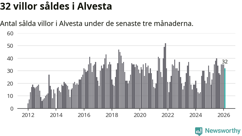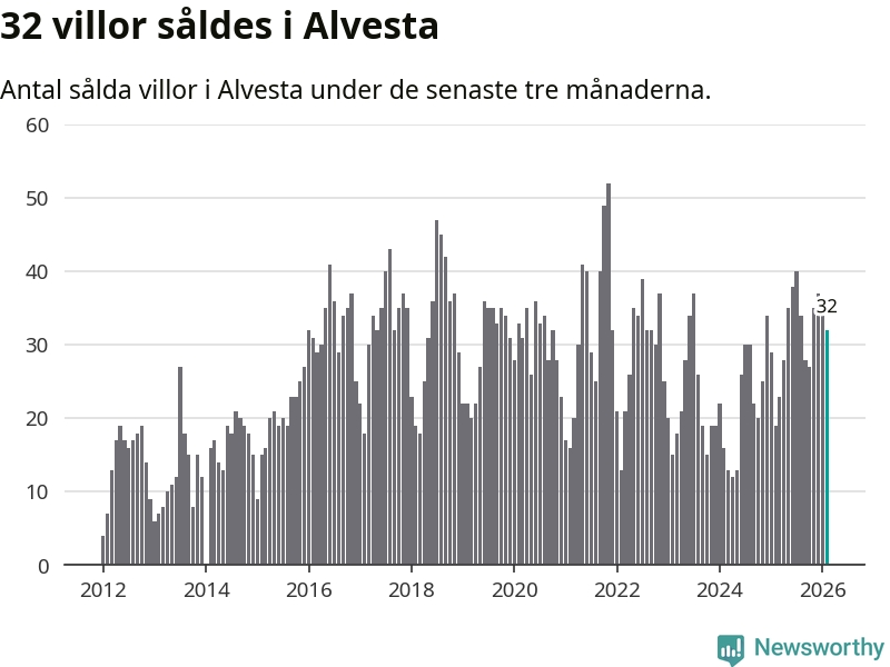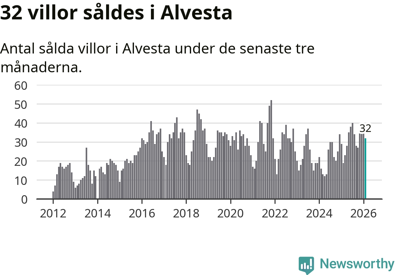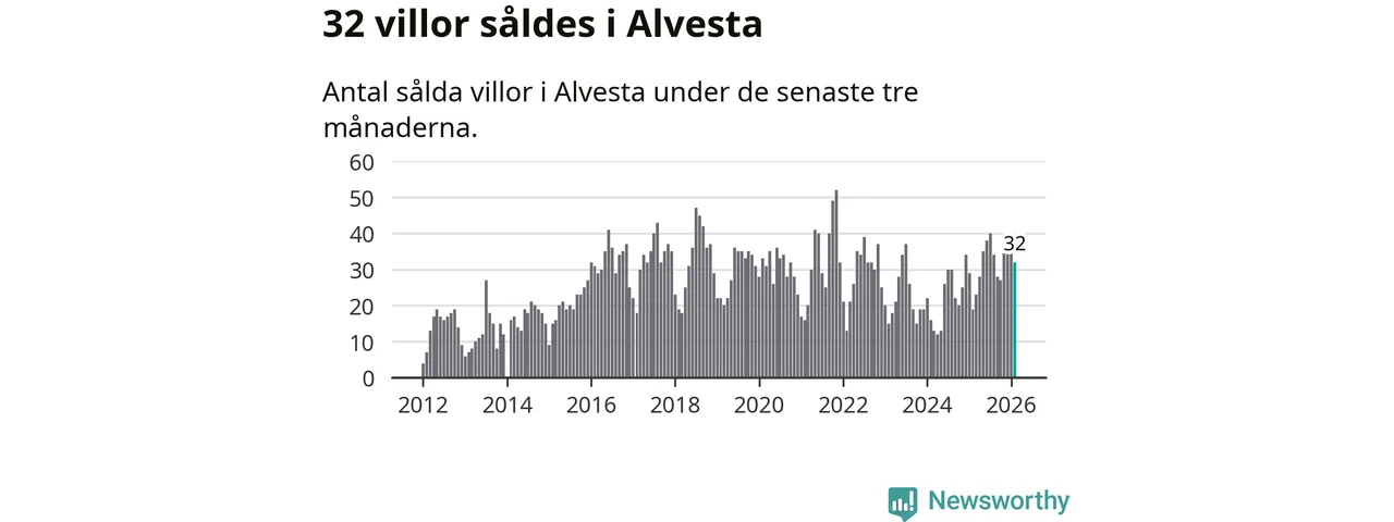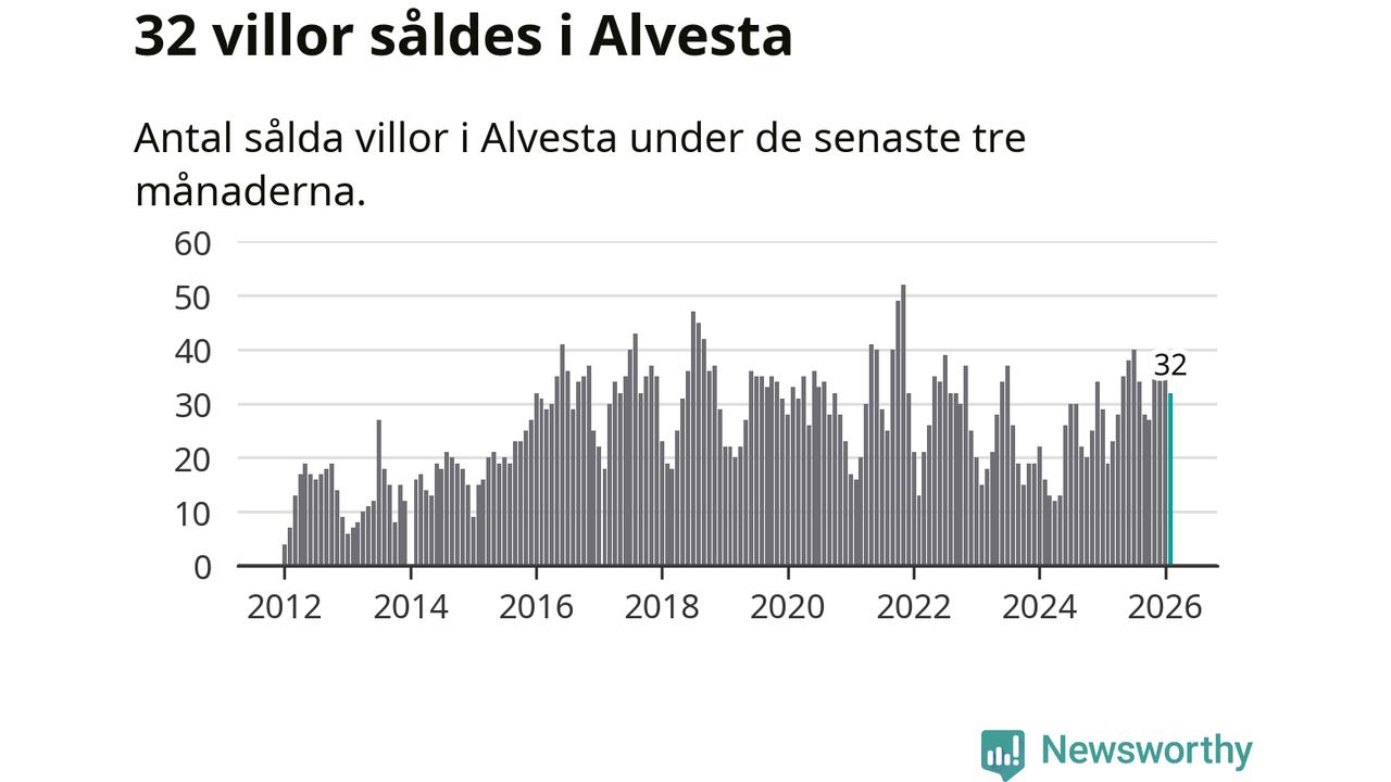 Mellan december och februari gjordes sammanlagt 32 affärer med villor i Alvesta kommun. Det kan jämföras med 19 vid motsvarande tid i fjol.