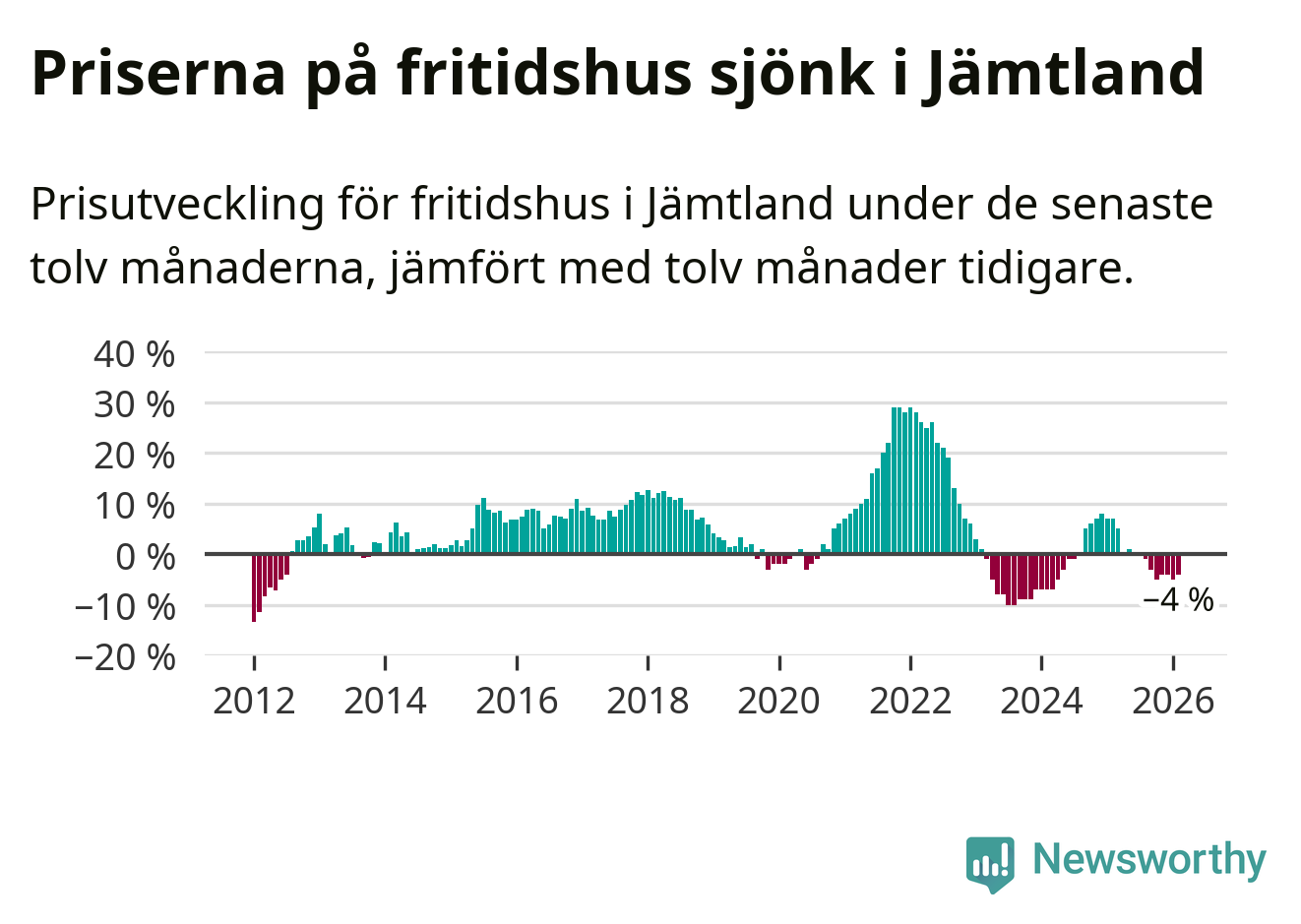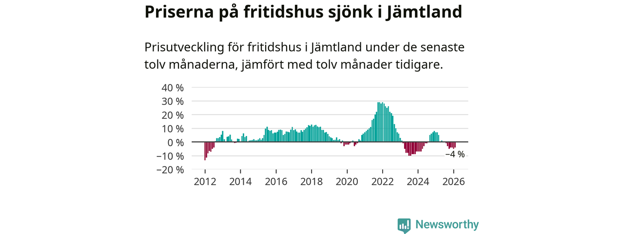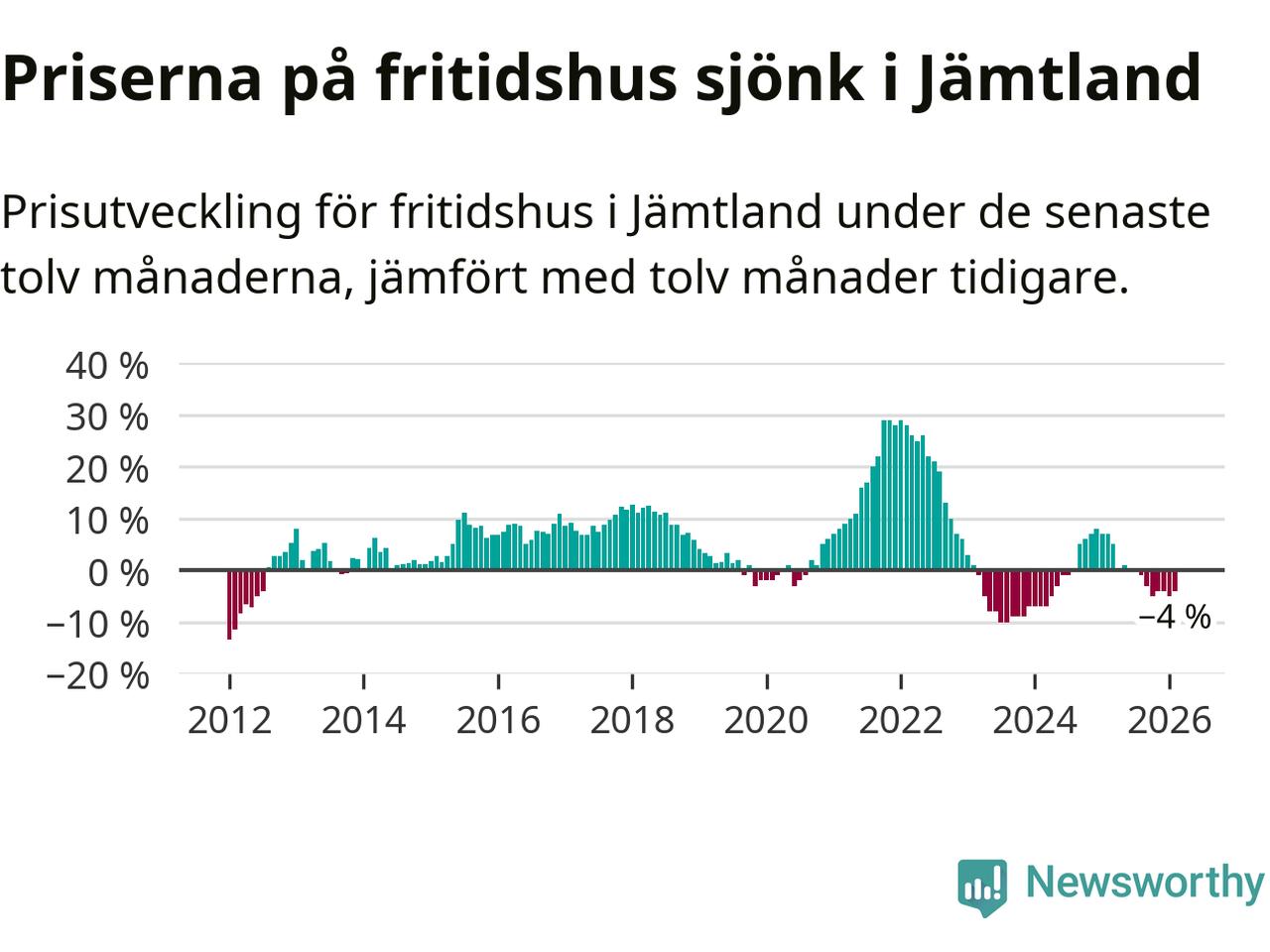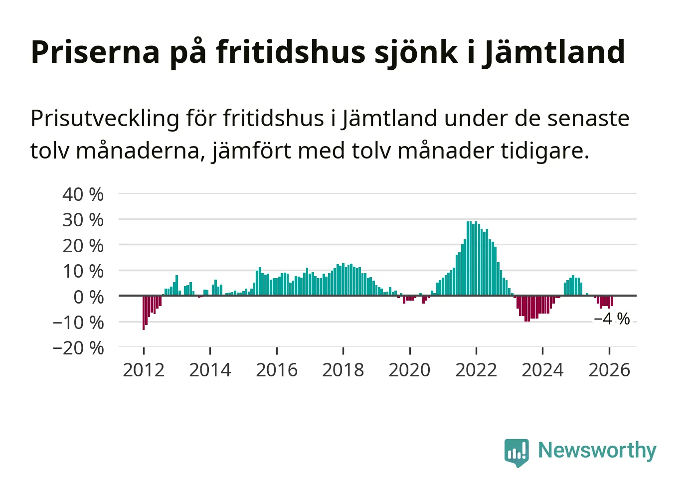 Priserna på fritidshus har gått ner i Jämtlands län. Medelpriset på försäljningarna under de senaste tolv månaderna visar på en nedgång med 4 procent.