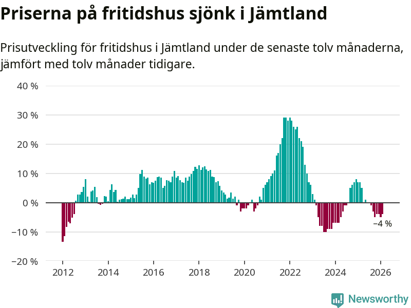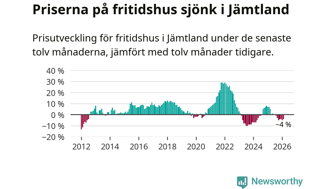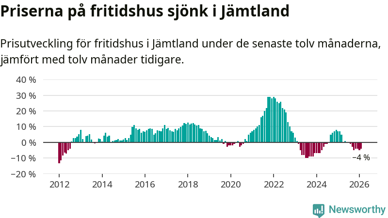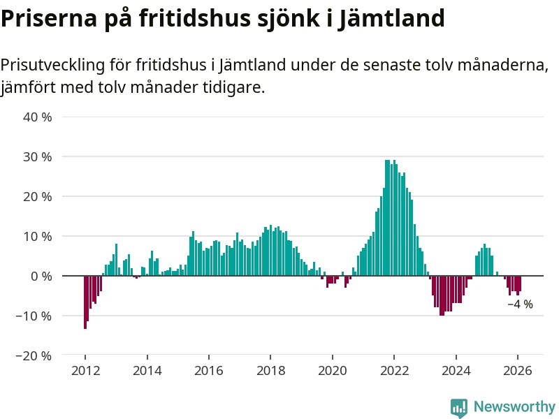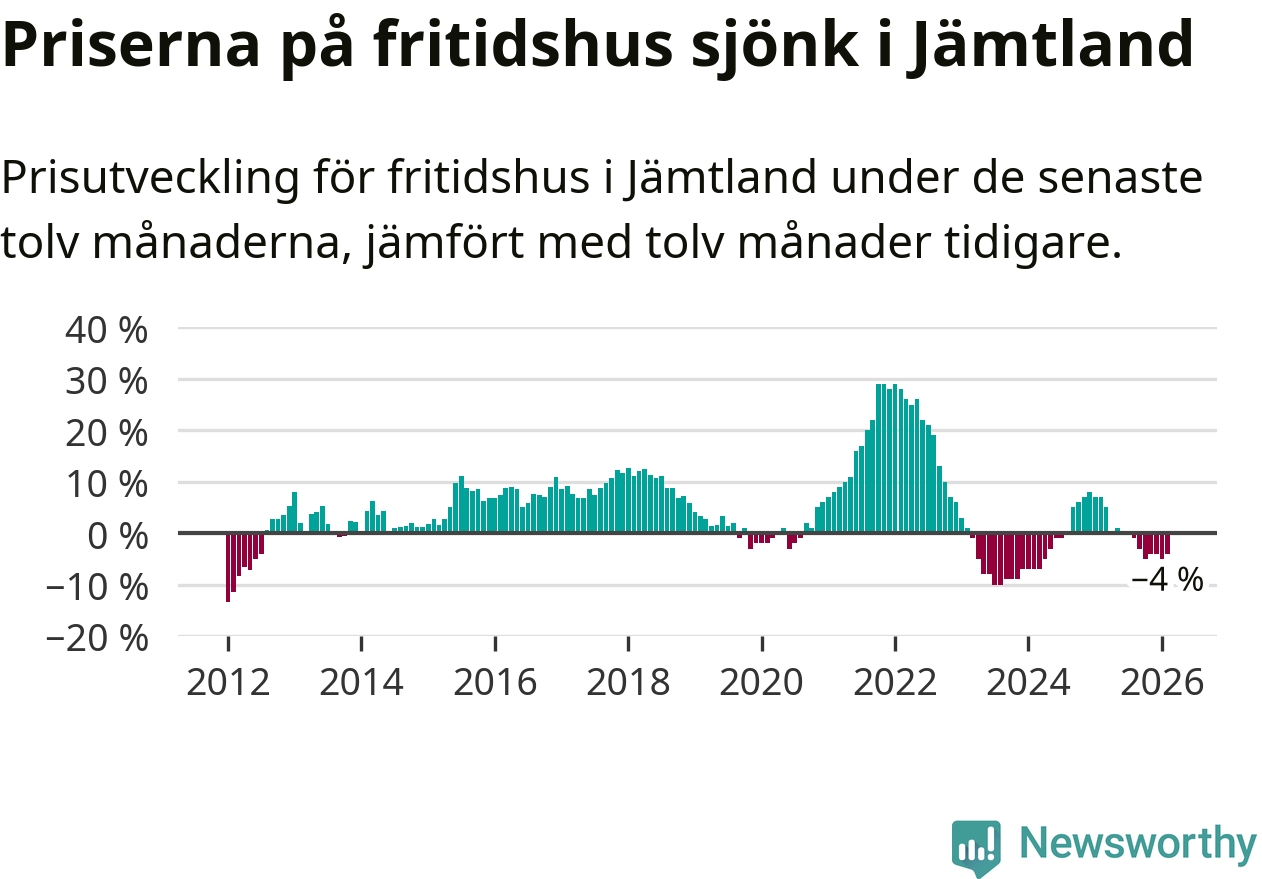 Priserna på fritidshus har gått ner i Jämtlands län. Medelpriset på försäljningarna under de senaste tolv månaderna visar på en nedgång med 4 procent.