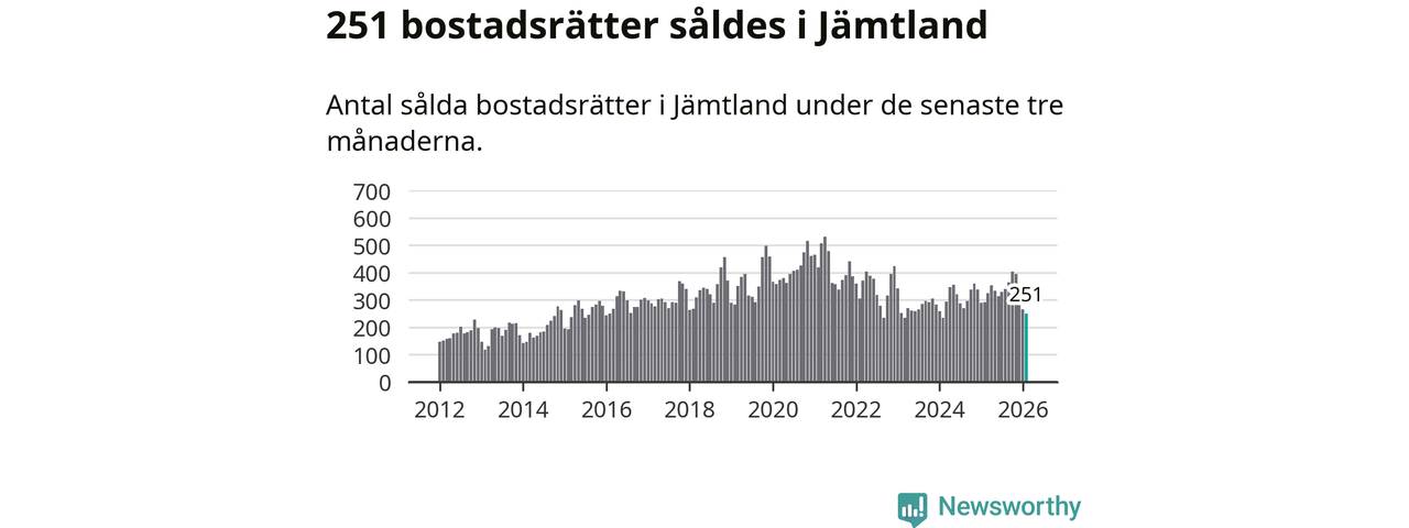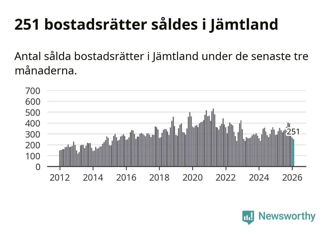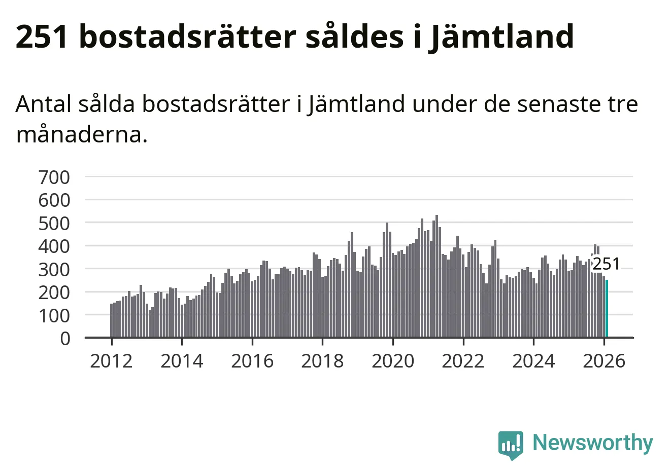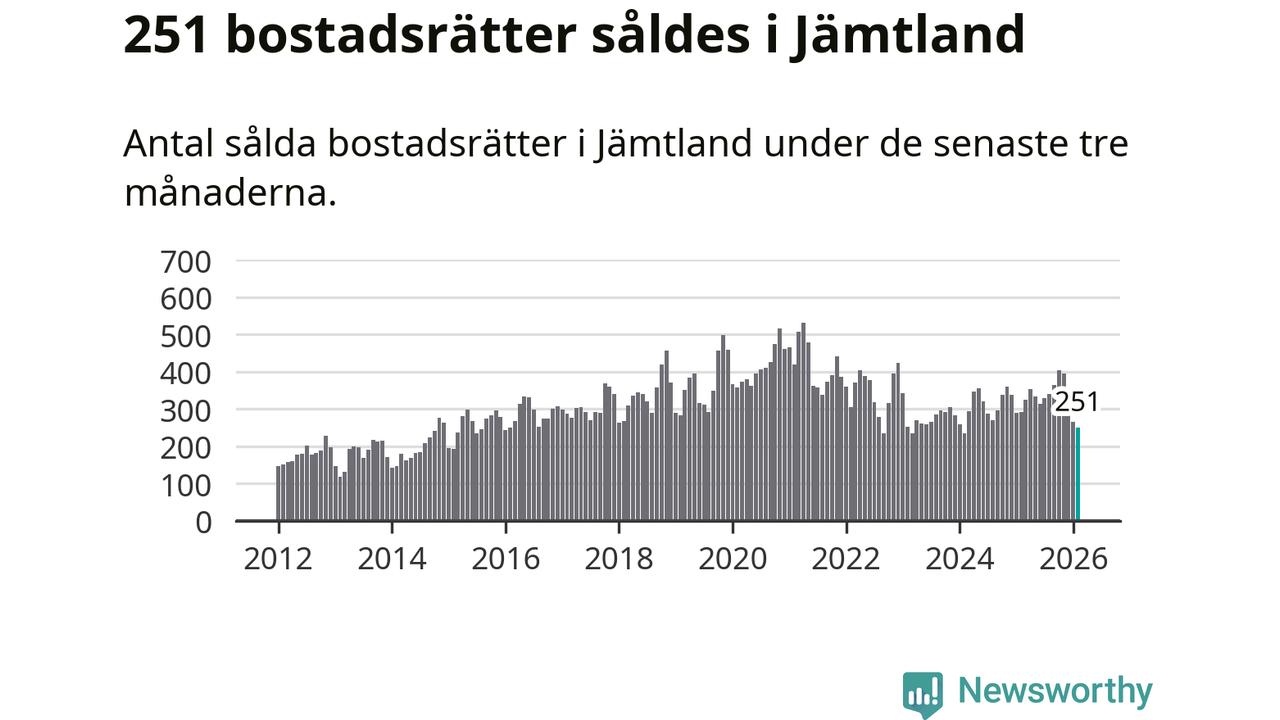 Sammanlagt såldes 251 bostadsrätter i Jämtlands län mellan december och februari till ett genomsnittligt pris på 2,3 miljoner kronor. I fjol gjordes 291 affärer vid den här tiden på året.