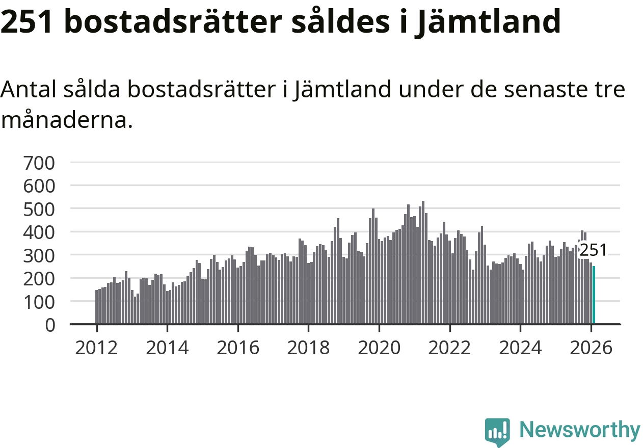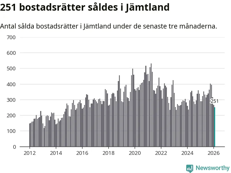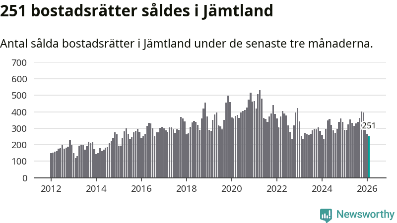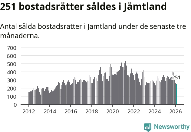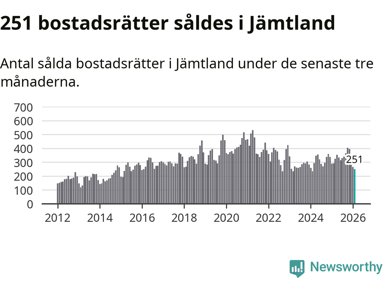 Sammanlagt såldes 251 bostadsrätter i Jämtlands län mellan december och februari till ett genomsnittligt pris på 2,3 miljoner kronor. I fjol gjordes 291 affärer vid den här tiden på året.
