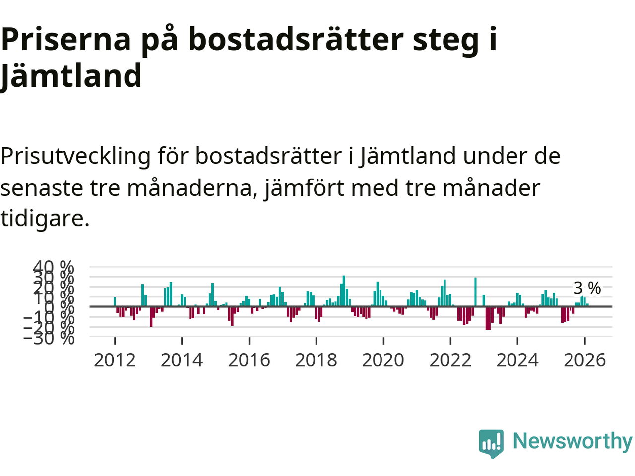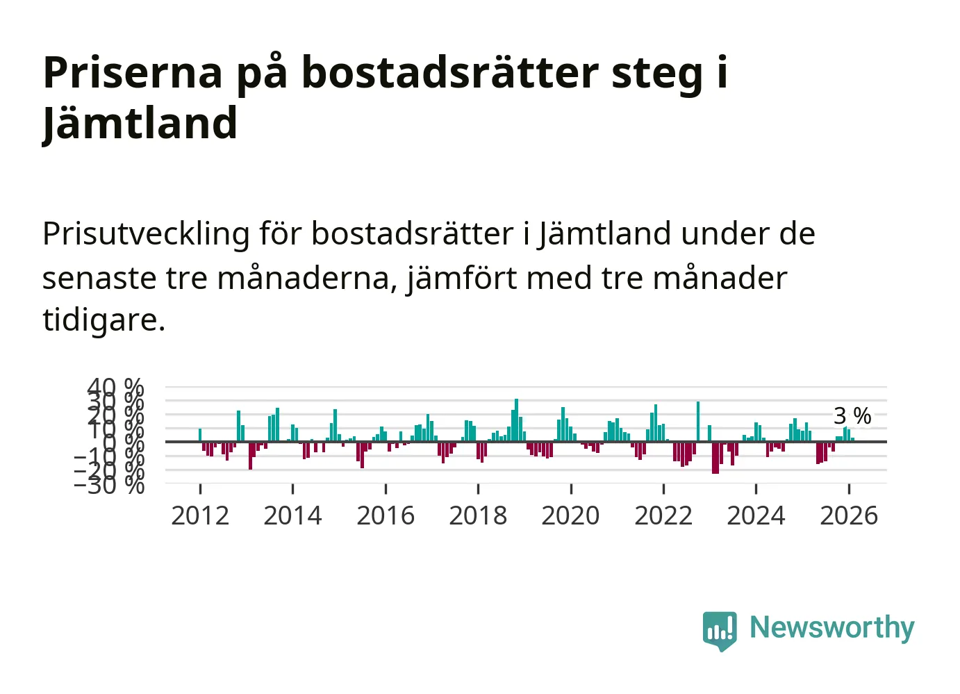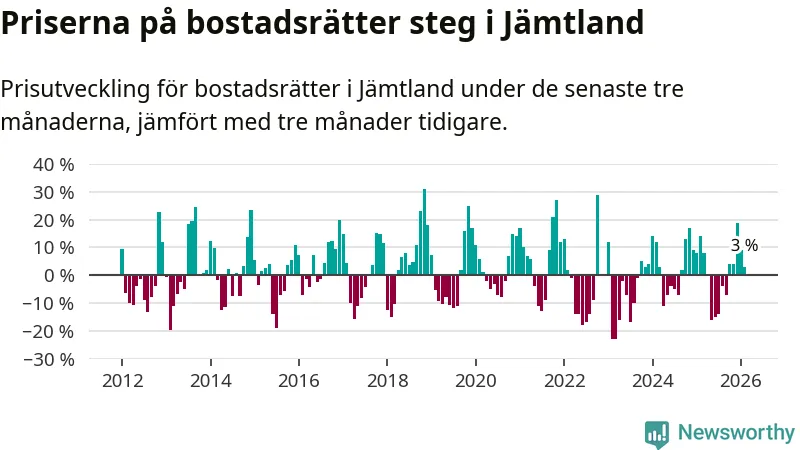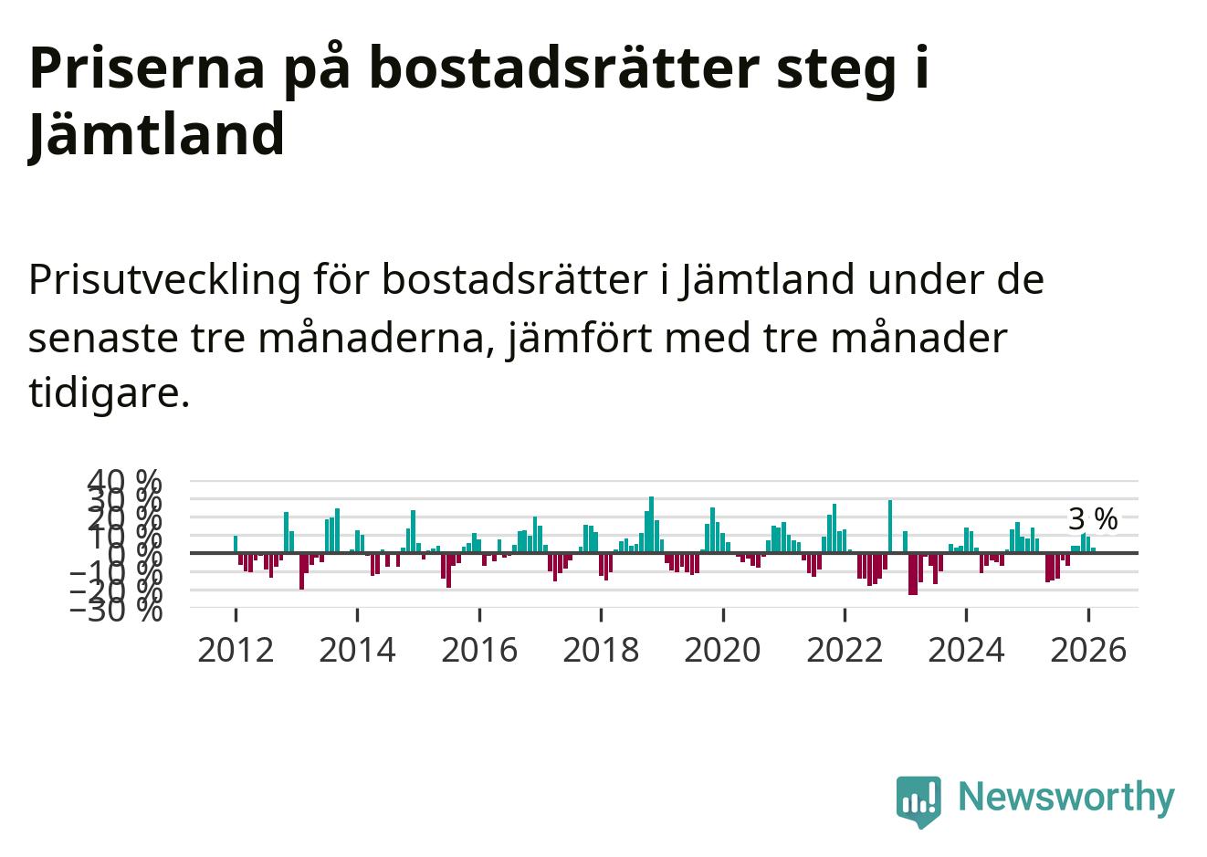 Priserna på bostadsrätter har gått upp i Jämtlands län. Medelpriset på försäljningarna under de senaste tre månaderna visar på en uppgång med 3 procent.