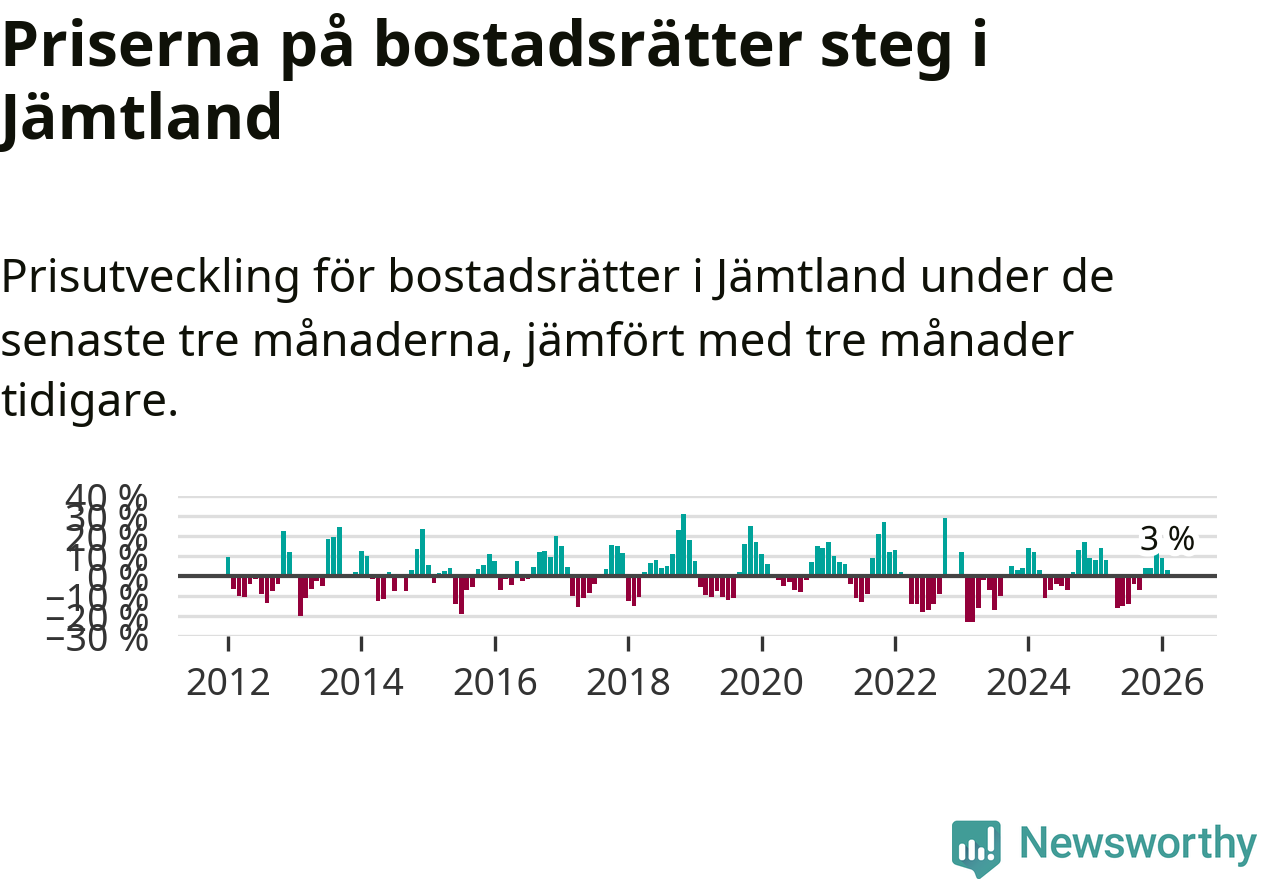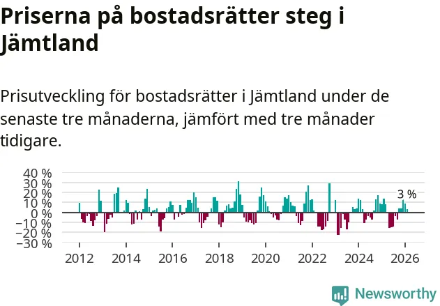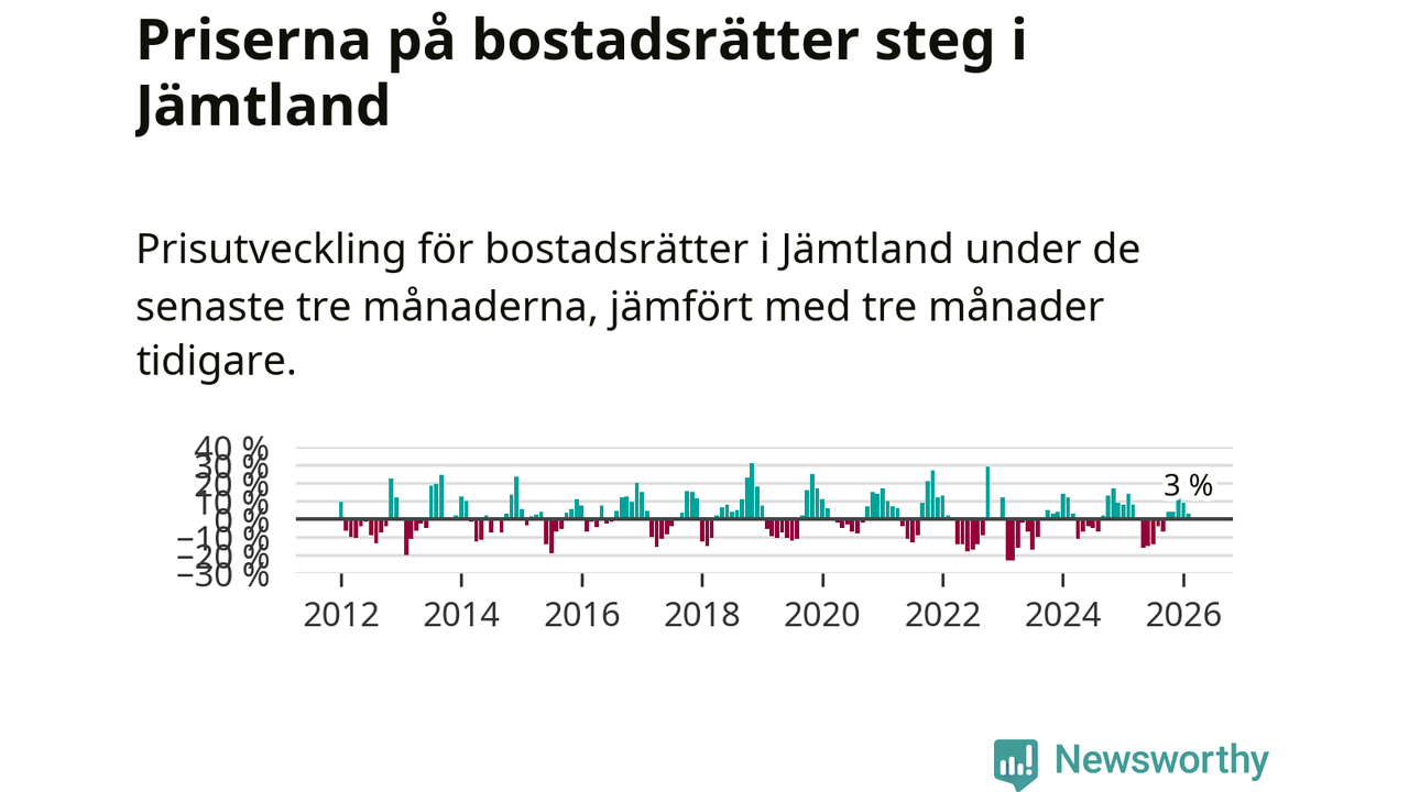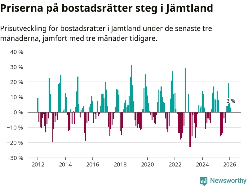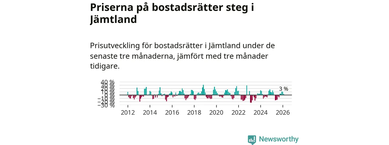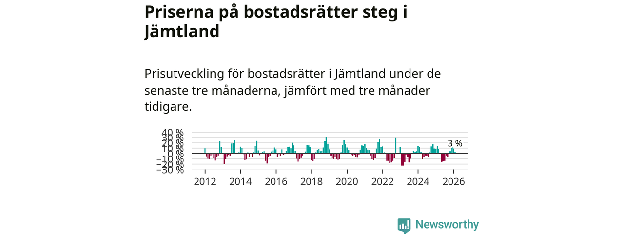 Priserna på bostadsrätter har gått upp i Jämtlands län. Medelpriset på försäljningarna under de senaste tre månaderna visar på en uppgång med 3 procent.