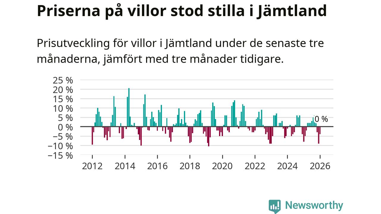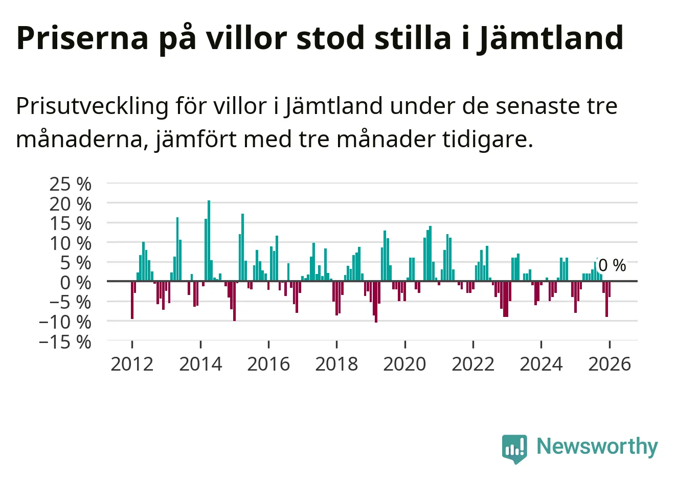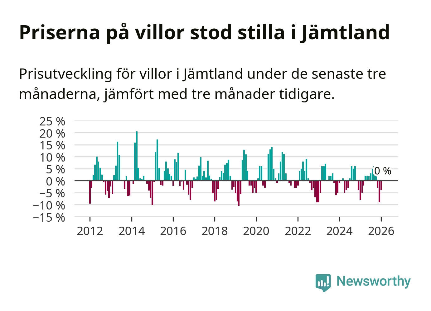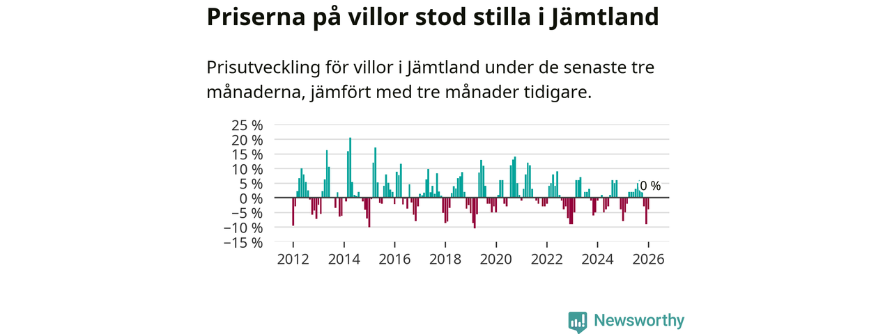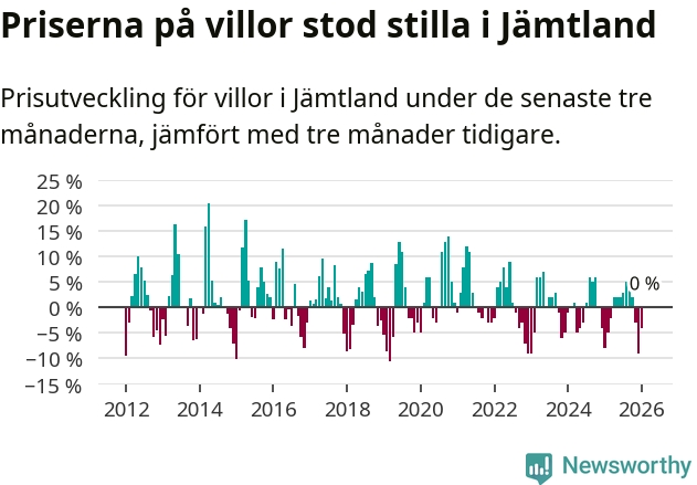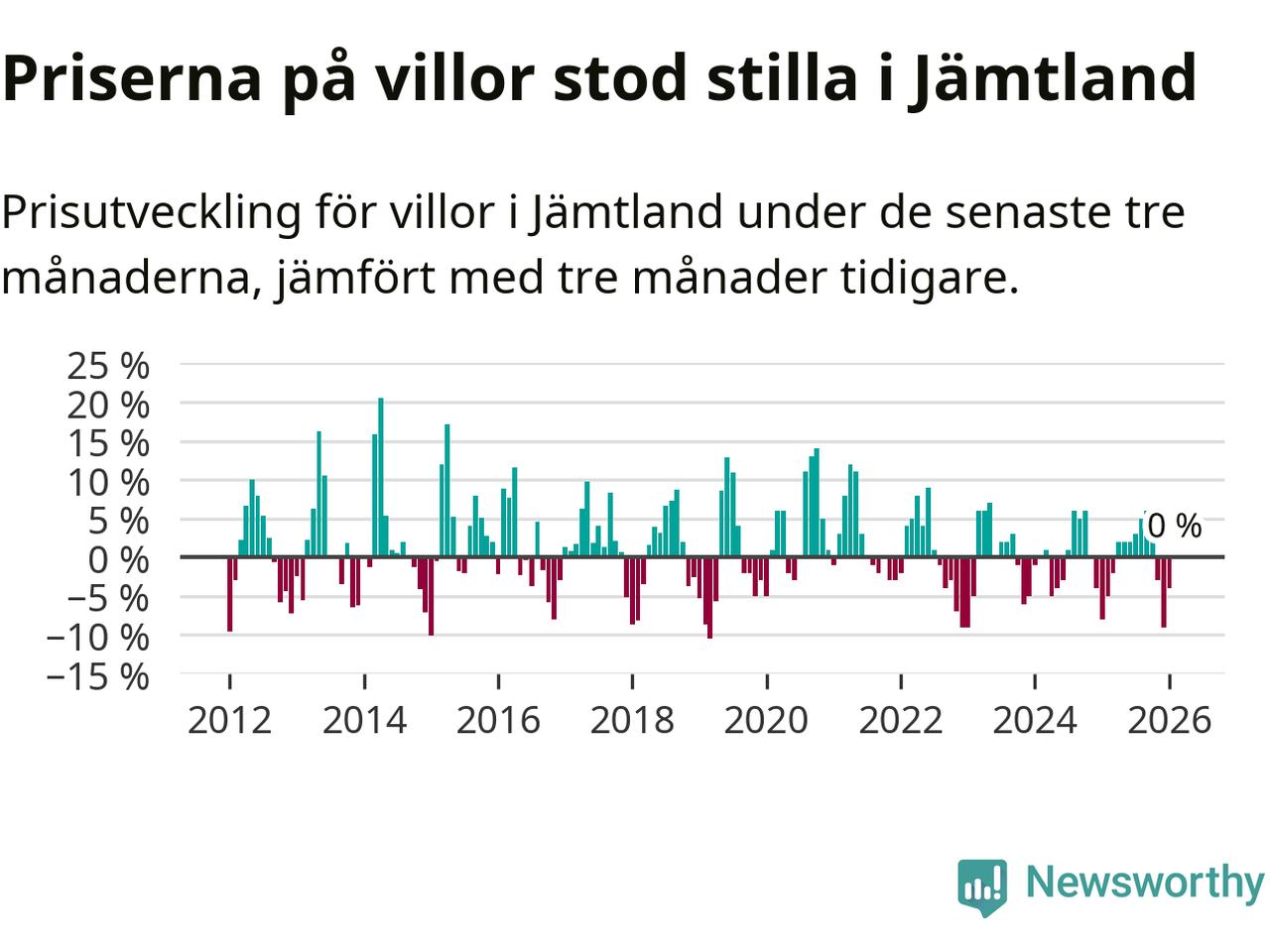 Villapriserna står i stort sett stilla i Jämtlands län. Medelpriset på de på försäljningarna under de senaste tre månaderna låg på samma nivå som för tre månader sedan.