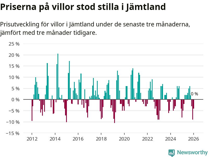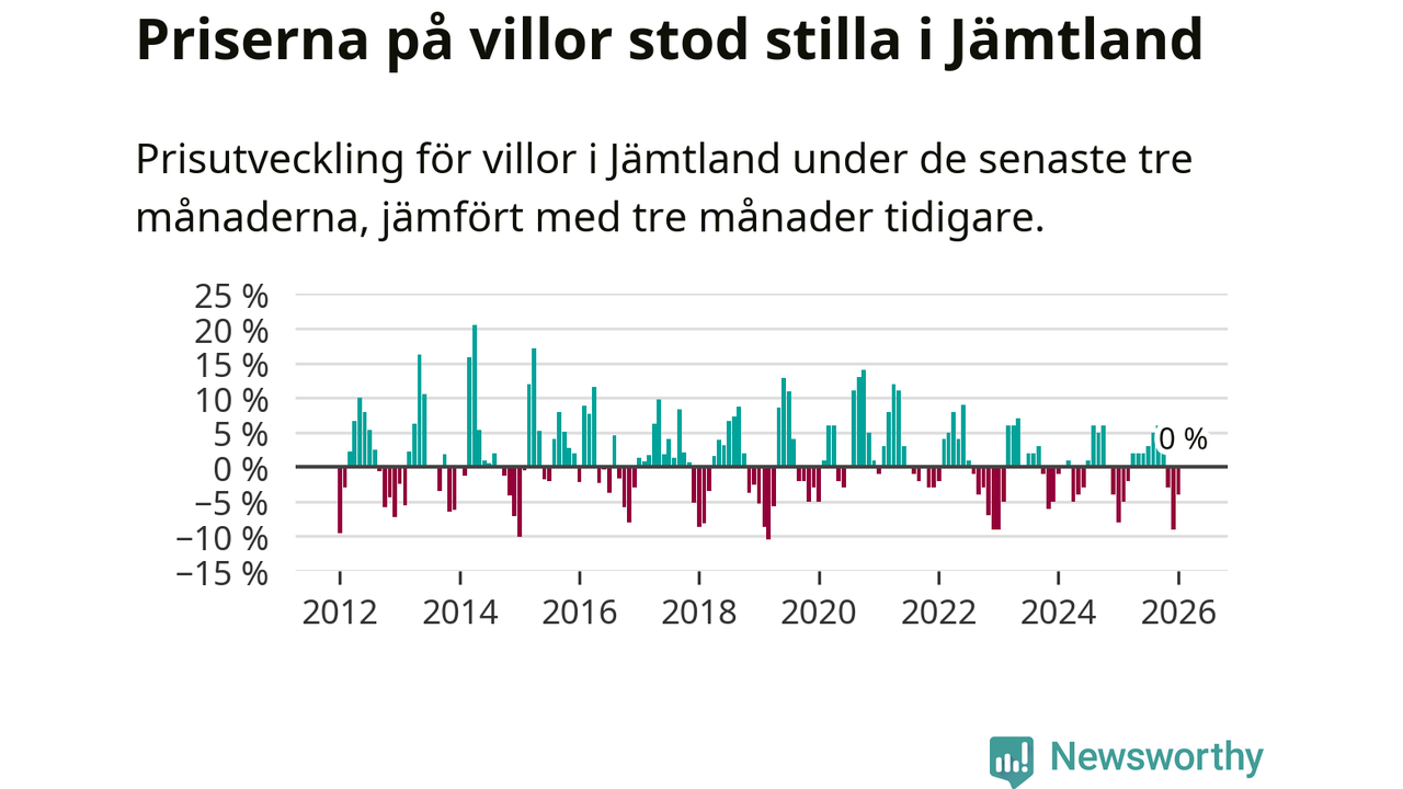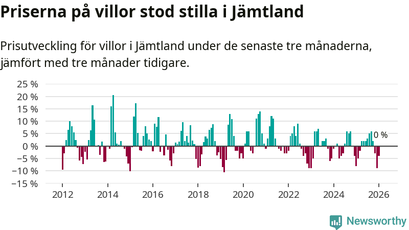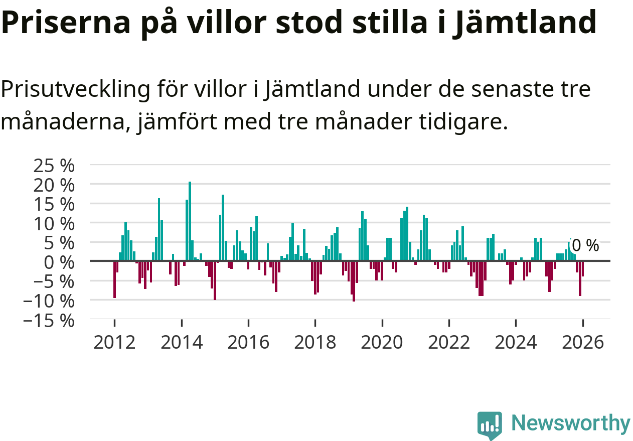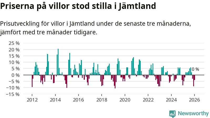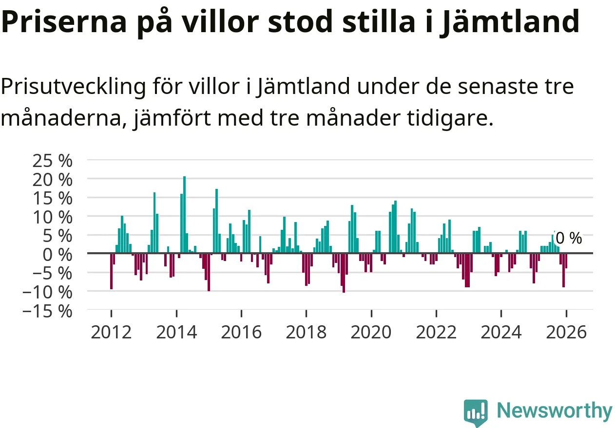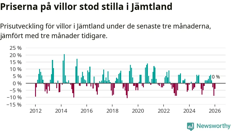 Villapriserna står i stort sett stilla i Jämtlands län. Medelpriset på de på försäljningarna under de senaste tre månaderna låg på samma nivå som för tre månader sedan.