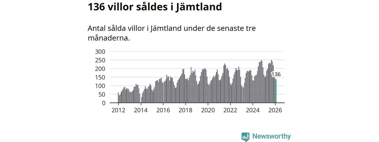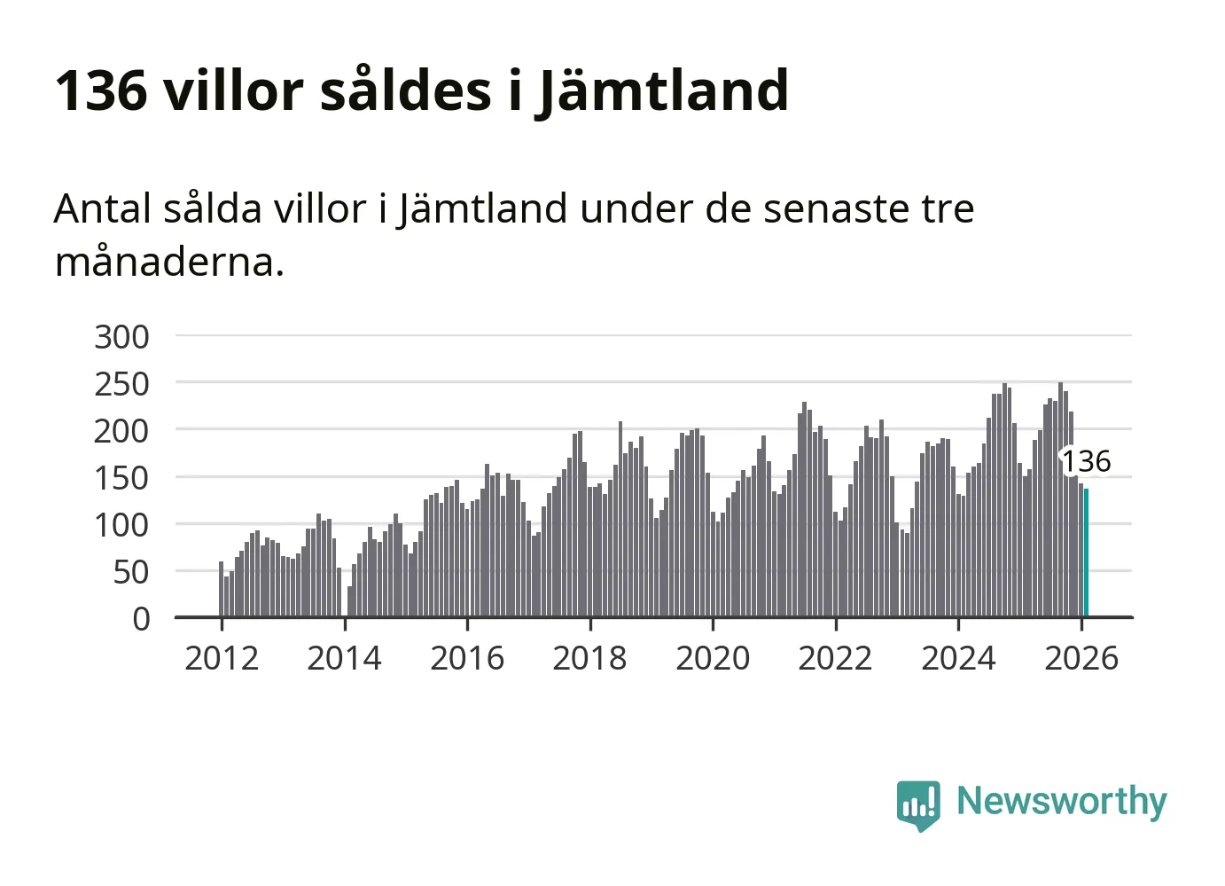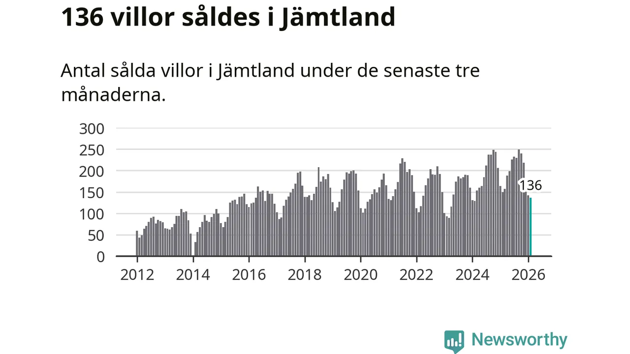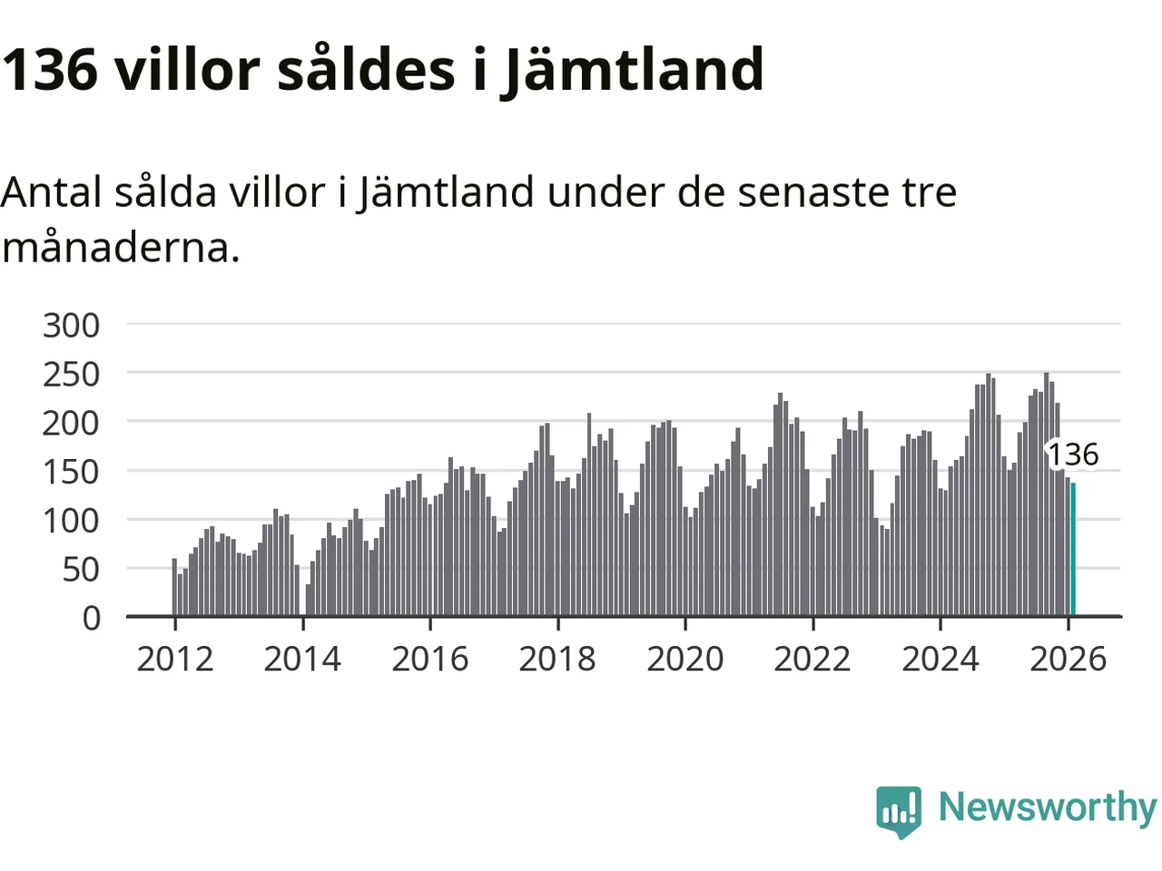 Sammanlagt såldes 136 villor i Jämtlands län mellan december och februari till ett genomsnittligt pris på 3,2 miljoner kronor. I fjol gjordes 150 affärer vid den här tiden på året.