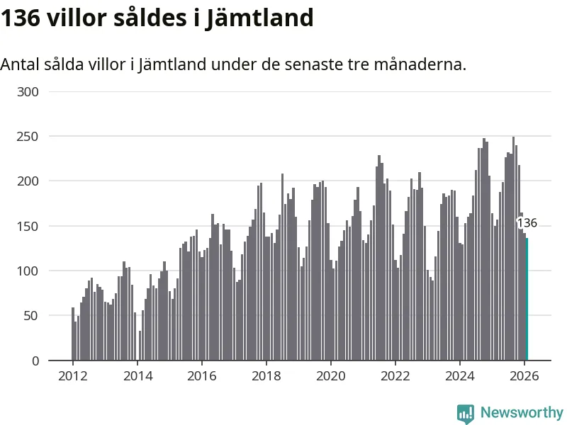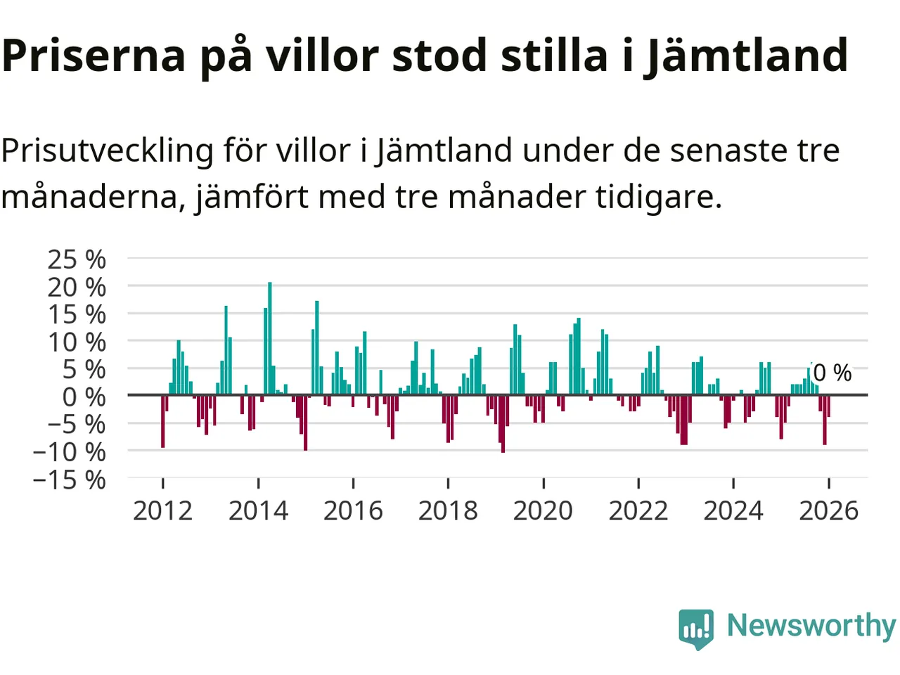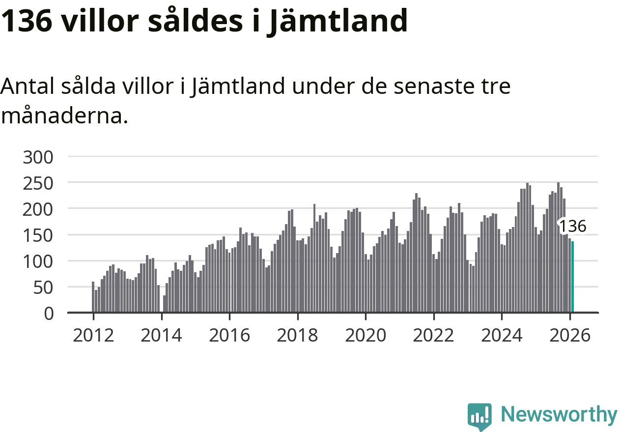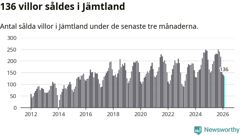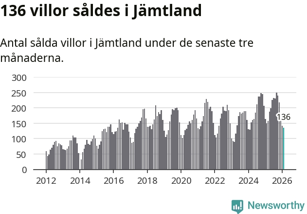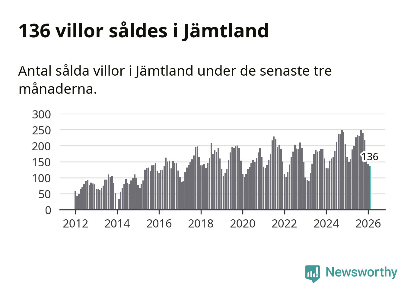 Sammanlagt såldes 136 villor i Jämtlands län mellan december och februari till ett genomsnittligt pris på 3,2 miljoner kronor. I fjol gjordes 150 affärer vid den här tiden på året.