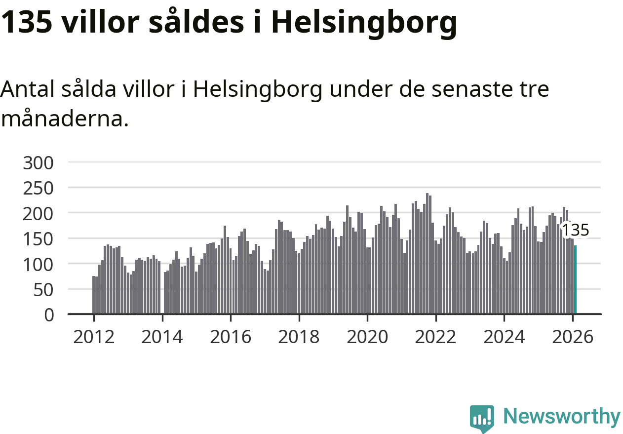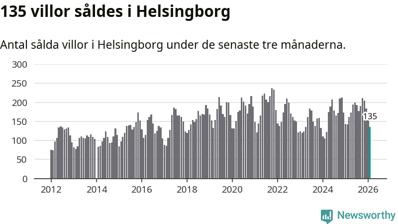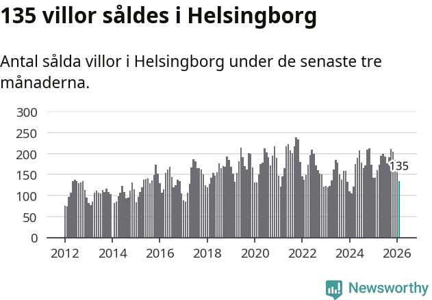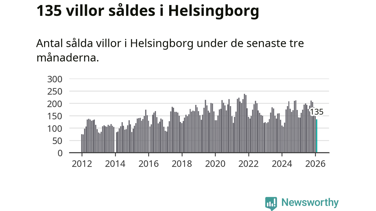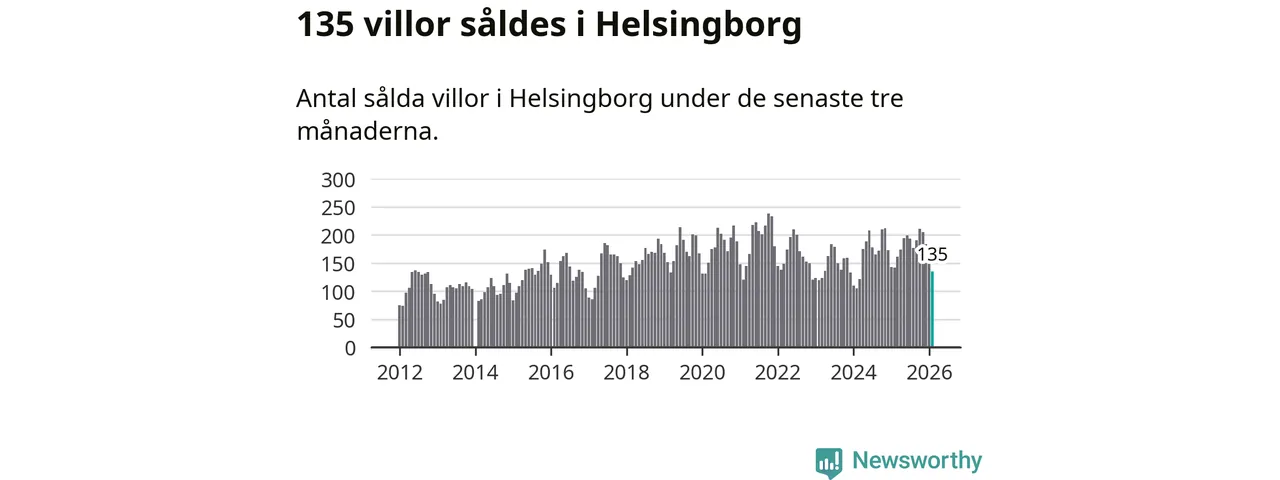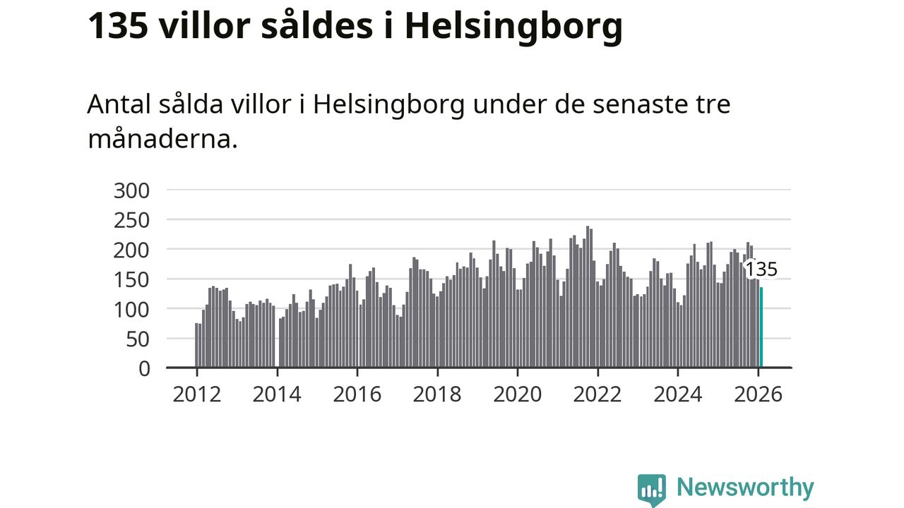 Sammanlagt såldes 135 villor i Helsingborgs kommun mellan december och februari till ett genomsnittligt pris på 5,2 miljoner kronor. I fjol gjordes 142 affärer vid den här tiden på året.