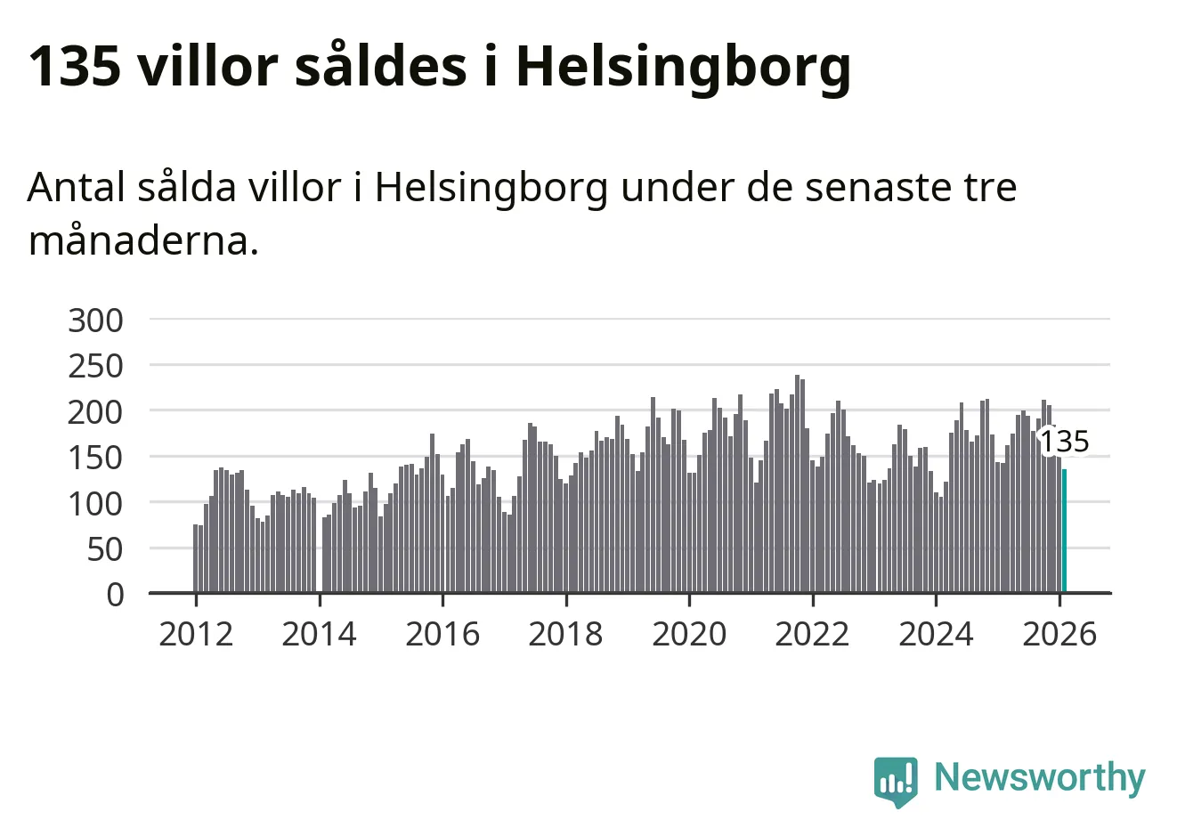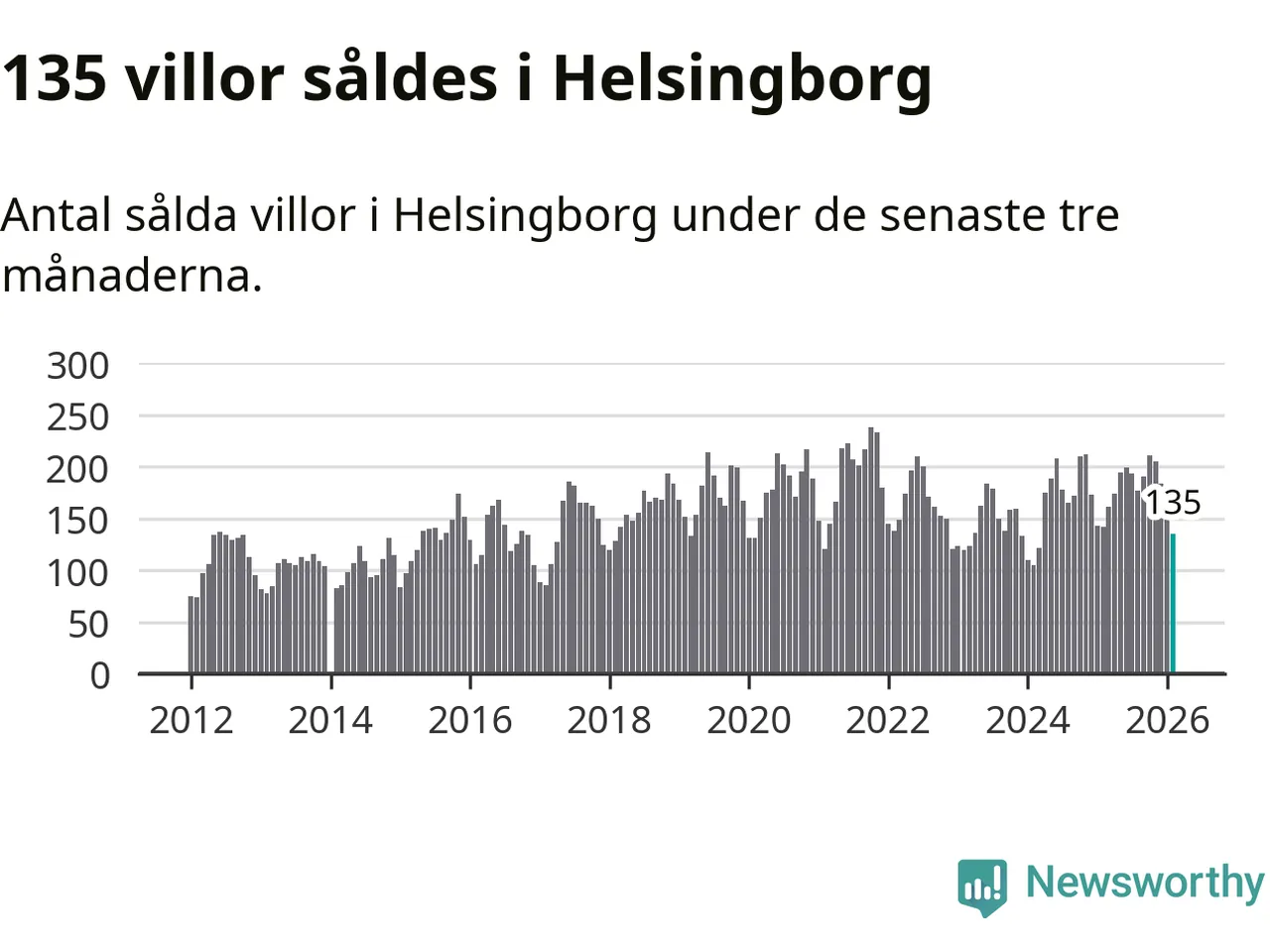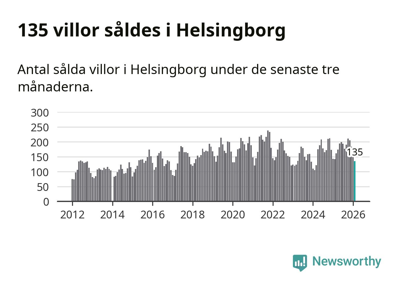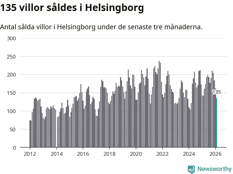 Sammanlagt såldes 135 villor i Helsingborgs kommun mellan december och februari till ett genomsnittligt pris på 5,2 miljoner kronor. I fjol gjordes 142 affärer vid den här tiden på året.